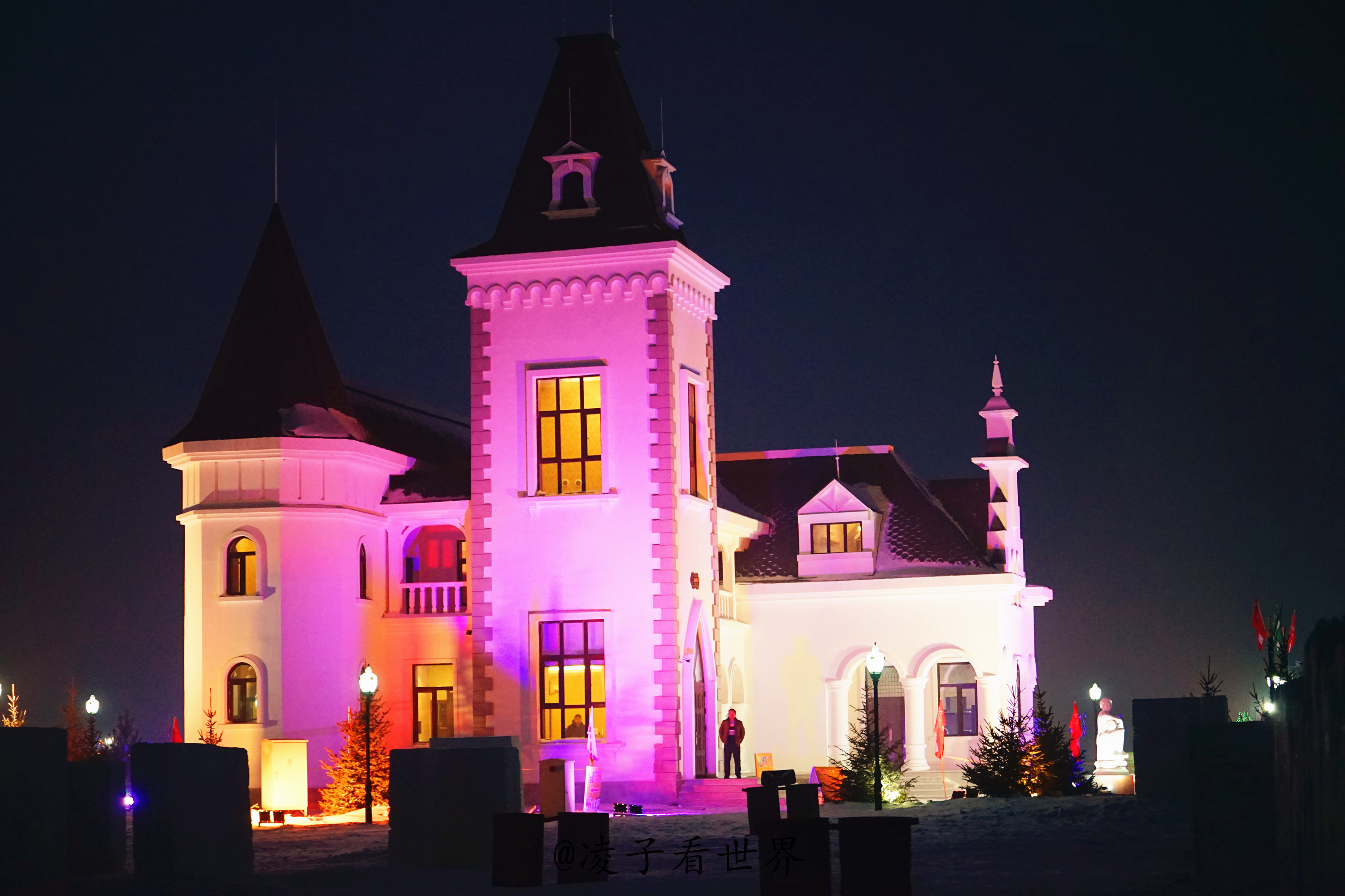 我一进来就被这些美丽的冰雕所吸引,看的眼花缭乱,拍的是不亦乐乎,居然到最后才想起我的城堡还没看到,正要找的时候,它居然就出现在我眼前,仔细一看我的巨蟹座城堡,居然就在B口滑雪场的入口处,而且是最大的。乐得嘴都合不拢了,赶紧合个影吧。夜晚的城堡看起来真是让人着迷,柔和的灯光打上去,是那样的诱人,真想住下来不走了。