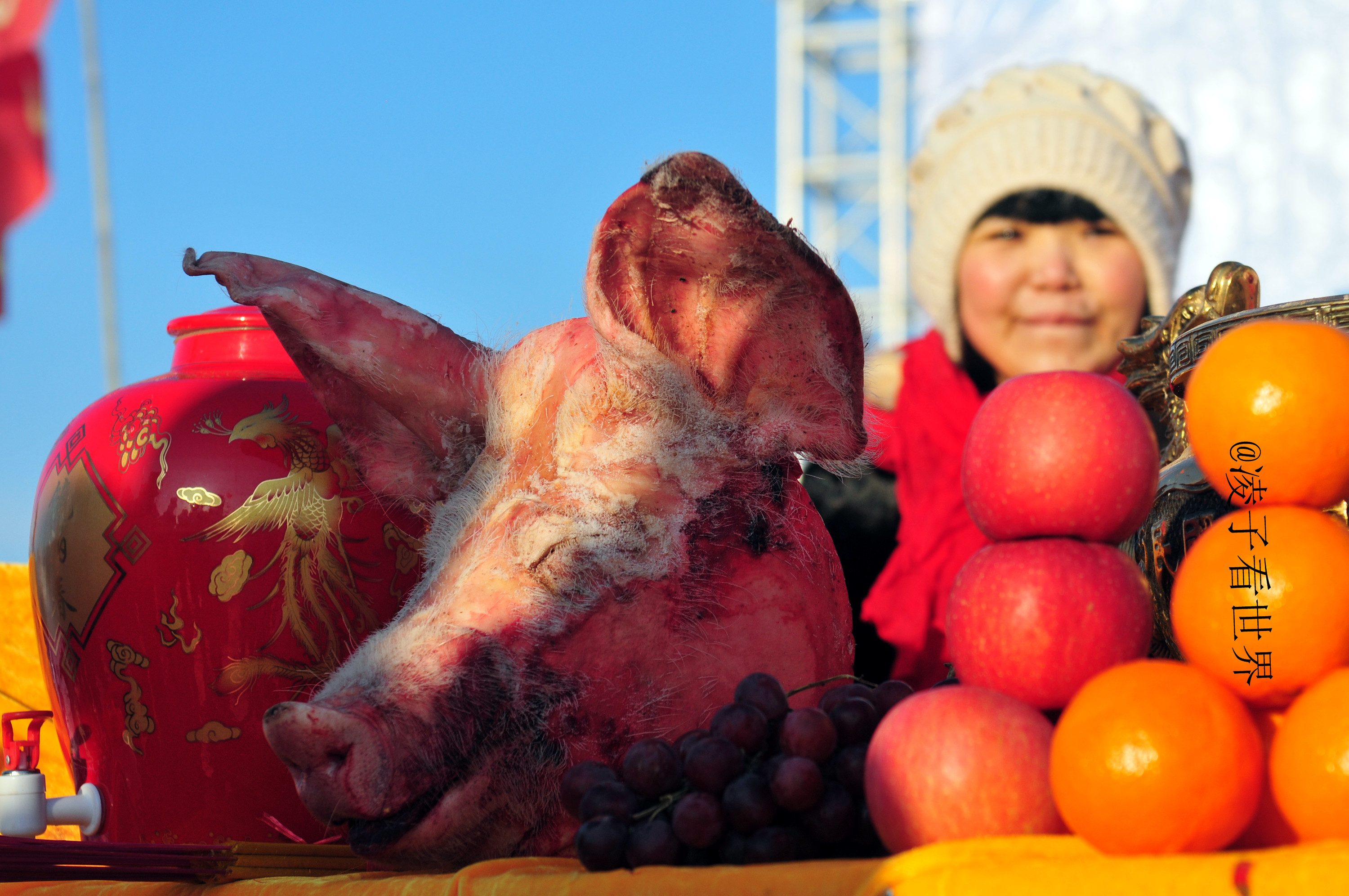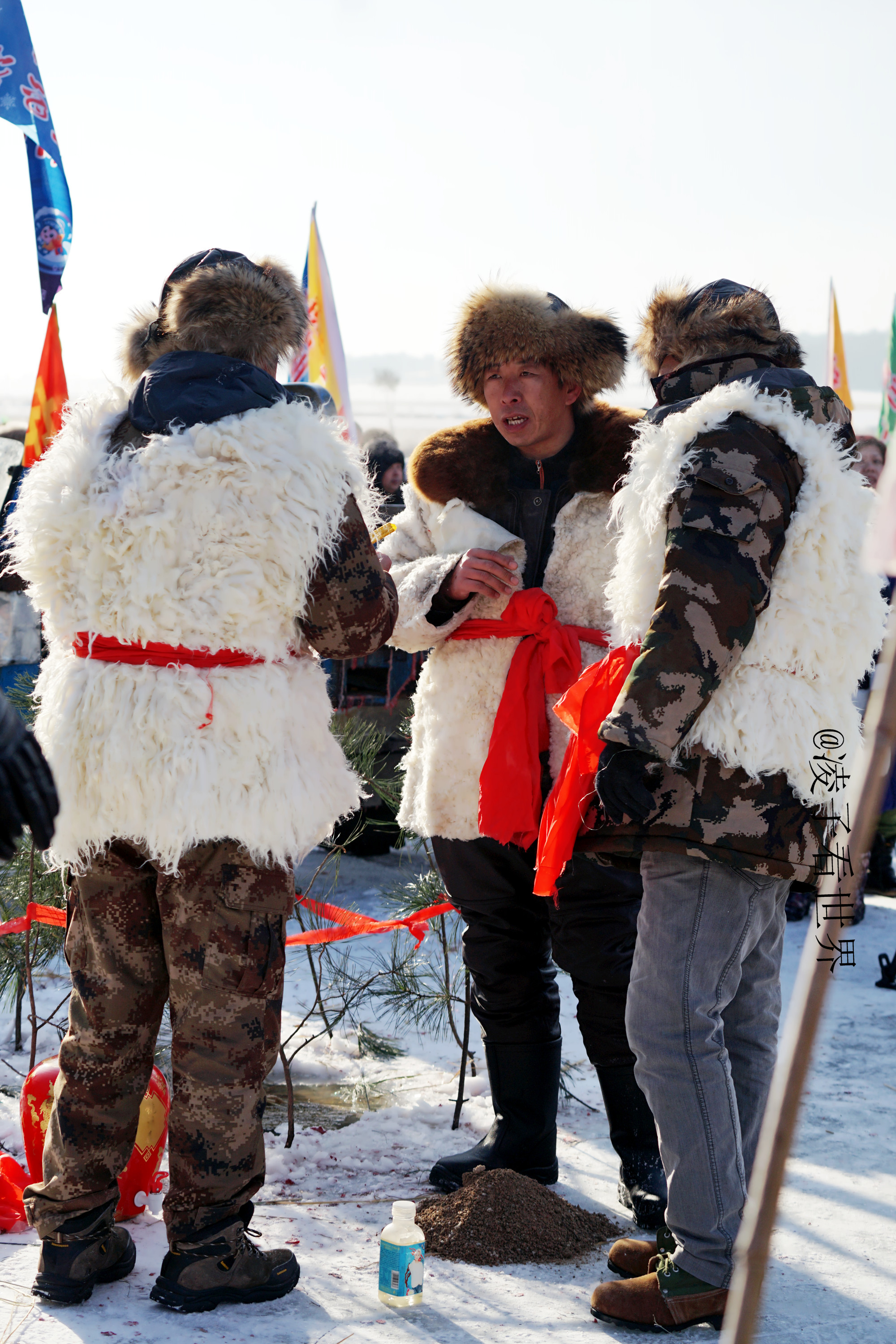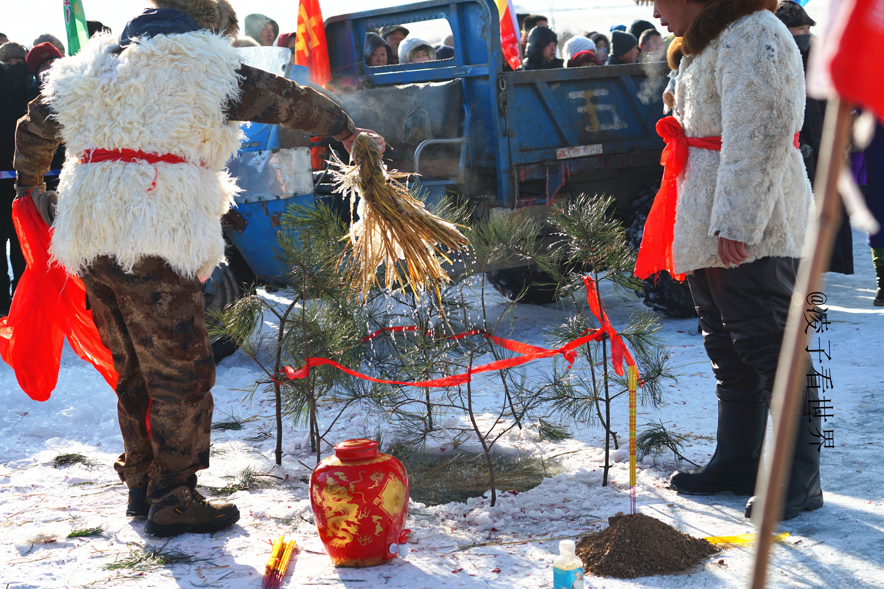 经过前一晚上的布网,第二天一早就等着拉网的胜利时刻。数十名身穿羊皮大衣、头戴狗皮帽子的渔民,首先要进行祭祖仪式,看见供桌上这个大大的猪头没,然后再点上三只很粗的香,这边祭祀完以后。再到湖面的捕鱼现场,首先捞干净冰洞里的稻草,放稻草是为了防止洞口冻住。再由渔把头向冰洞内撒酒以及祭品,嘴里念念有词,意思是求龙王保佑今年平平安安,多打鱼。最后再往渔网上撒酒,意为唤醒冬网,