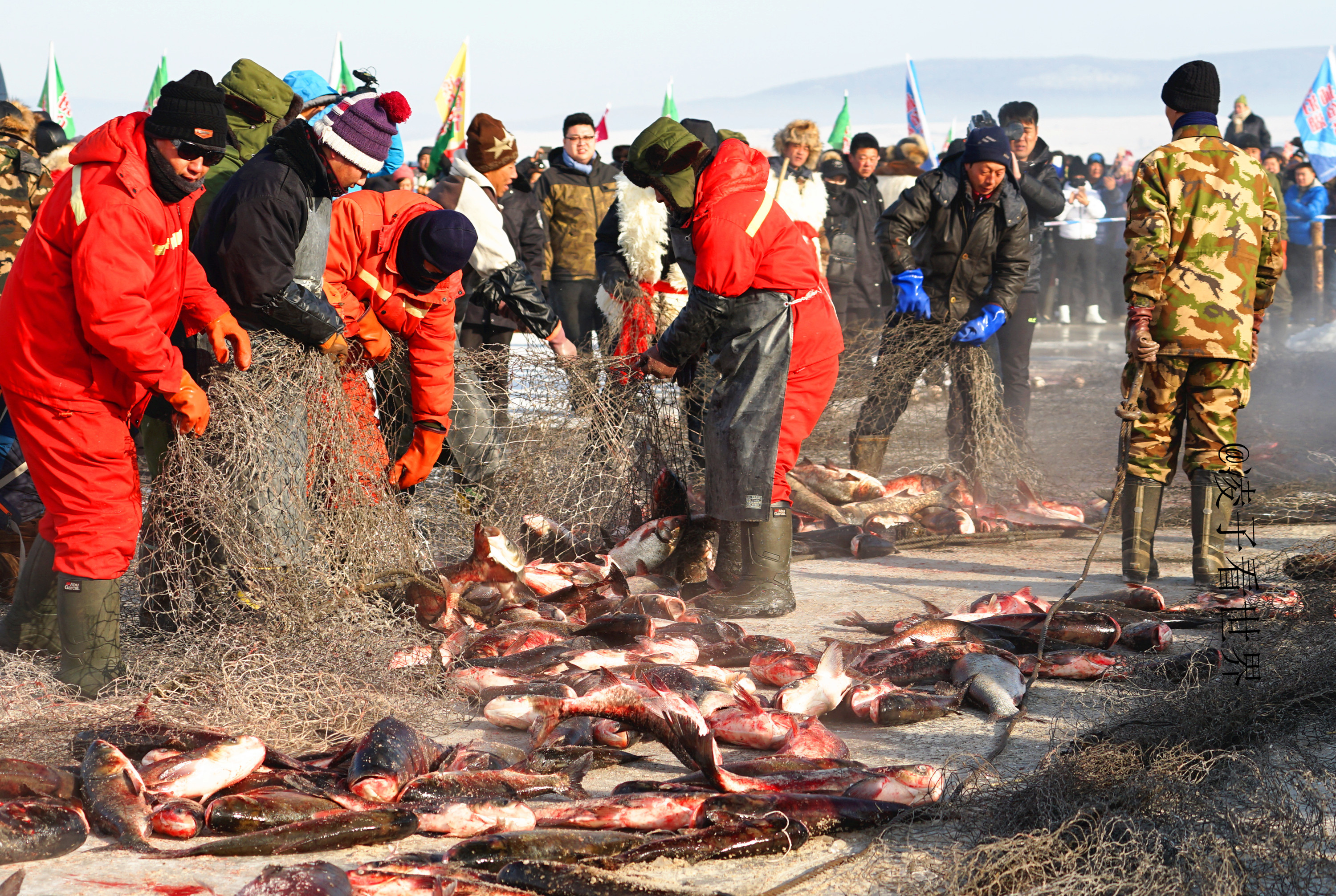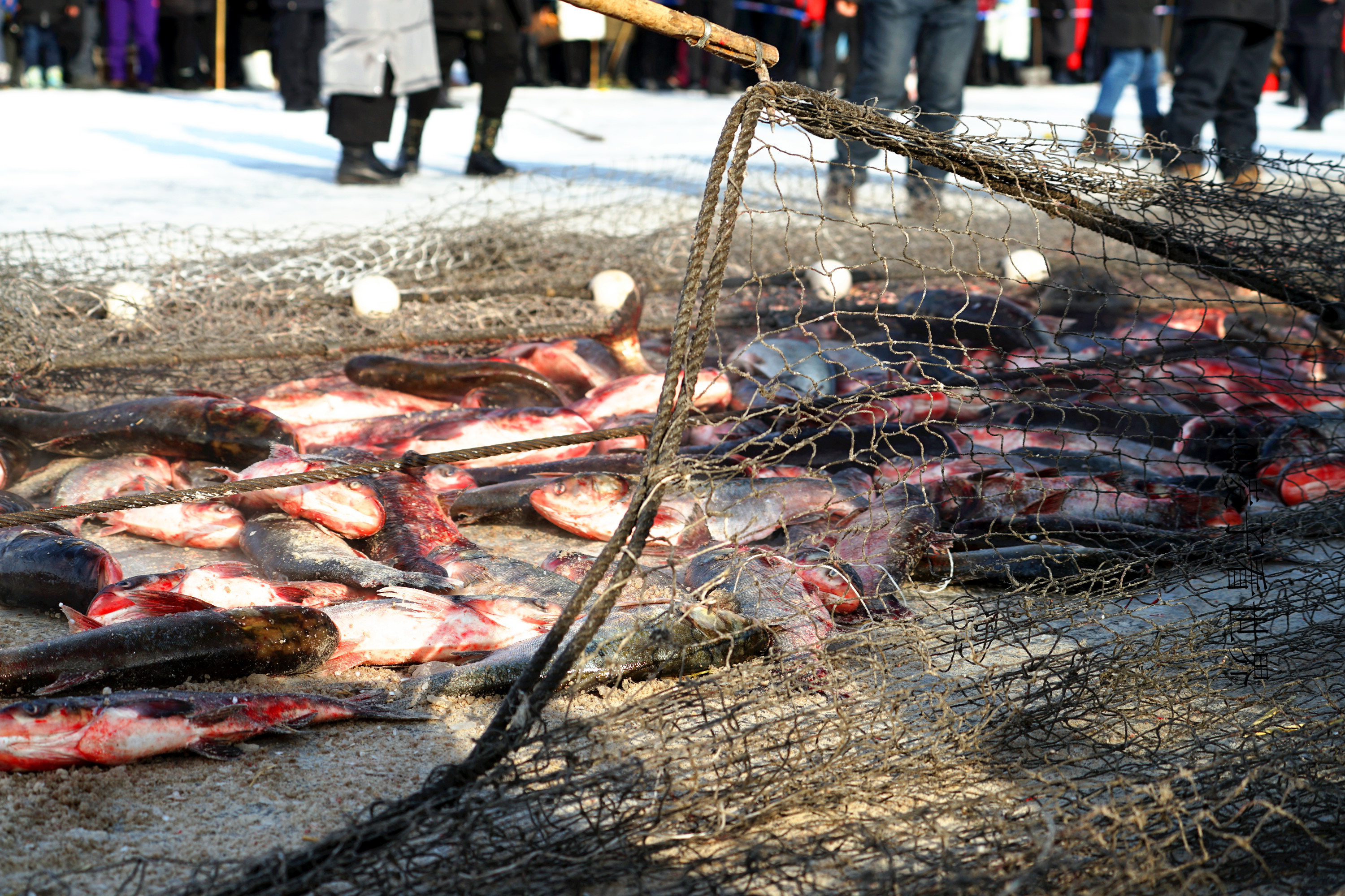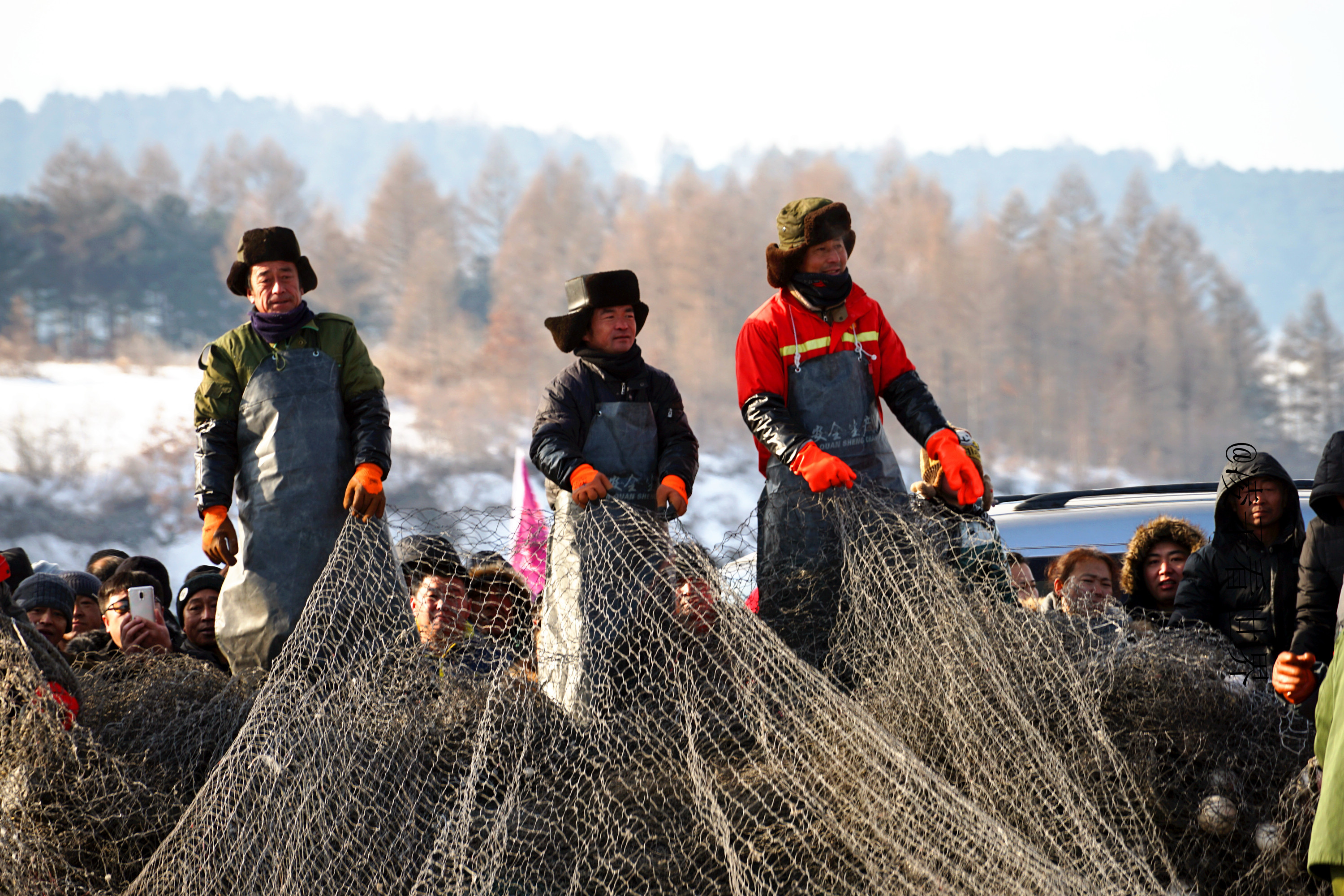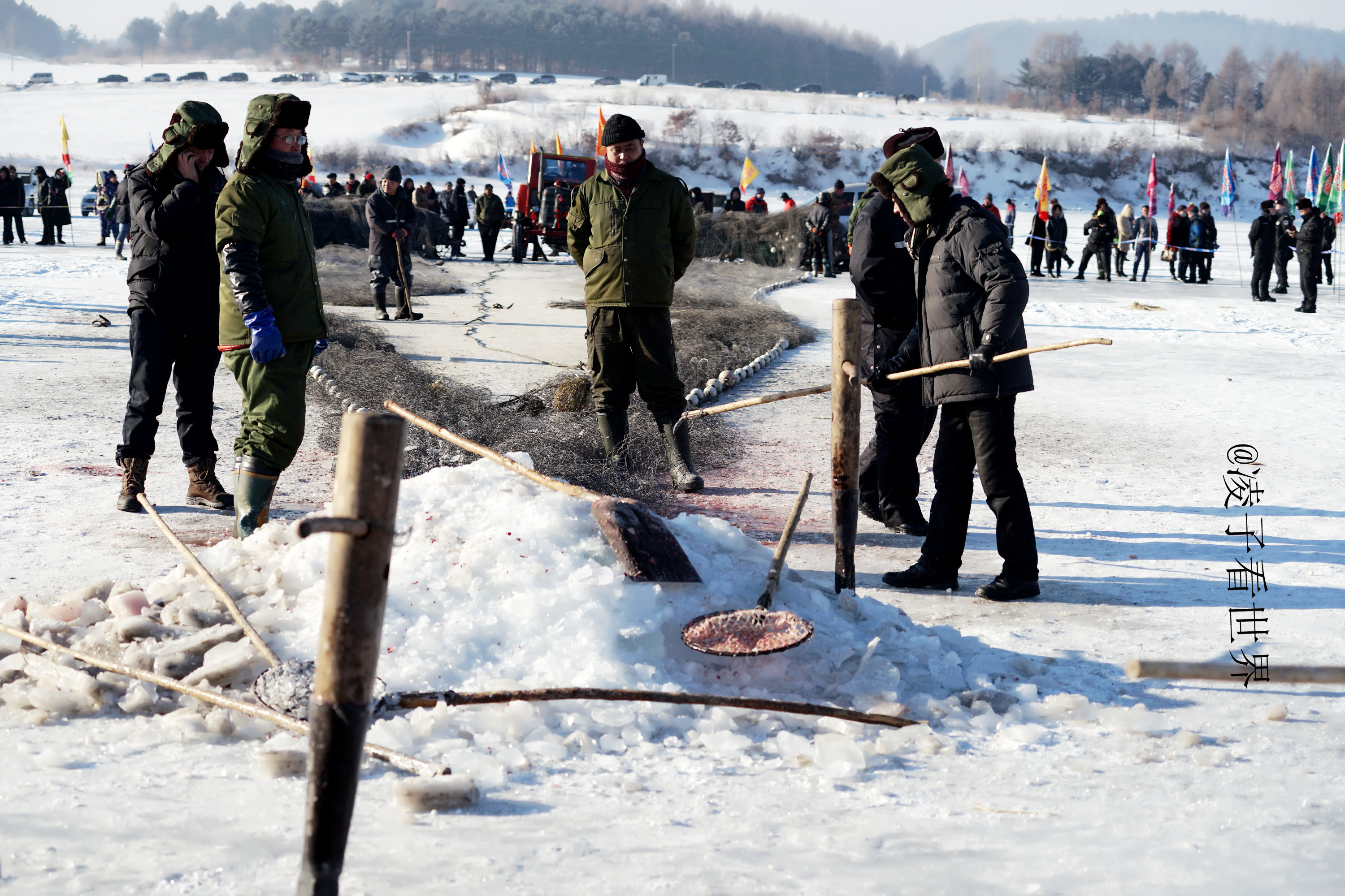 其实很多人并不了解,一次“冬捕”往往要动用的人力几十甚至上百,经历十多个小时,还有一套非常繁复的作业流程:先在一米左右的冰层上每隔八九米凿一个冰眼,一网要凿几百个冰窟窿,然后穿杆引线。这就是渔猎的艰辛,也有丰收的喜悦。把鱼网下到冰下,一网下去居然能捕到上万斤鱼甚至十数万斤鱼,你信吗?这些疑问都正是“冬捕”的神奇之处。冬天的水面结冰后,冰下面的水还可以维持在四度左右,鱼就在这相对温暖的区域内冬眠。此时把鱼网从入网口下水再牵引到数百上千米以外的出网口,然后起网,就能捕到大量的鱼。