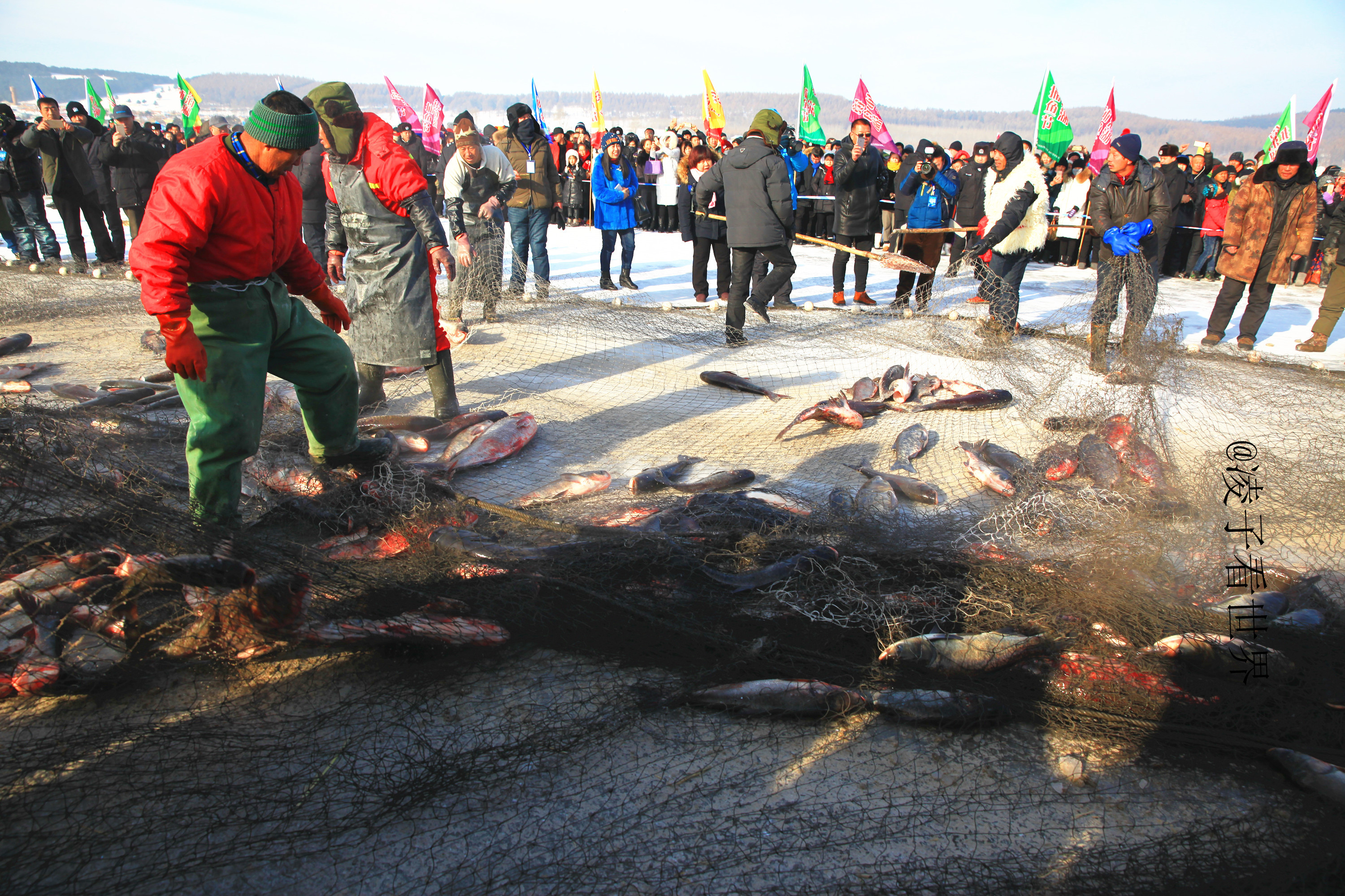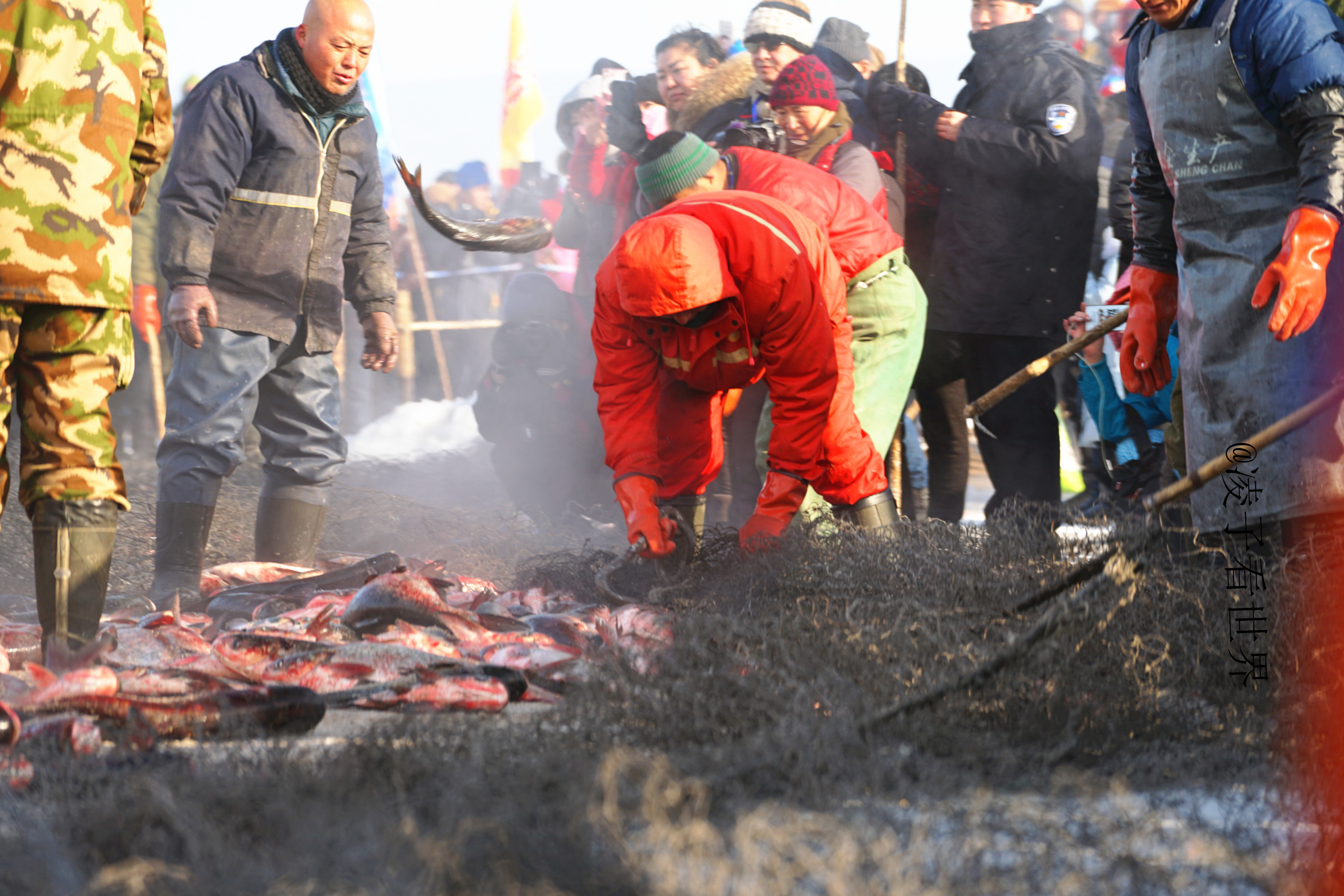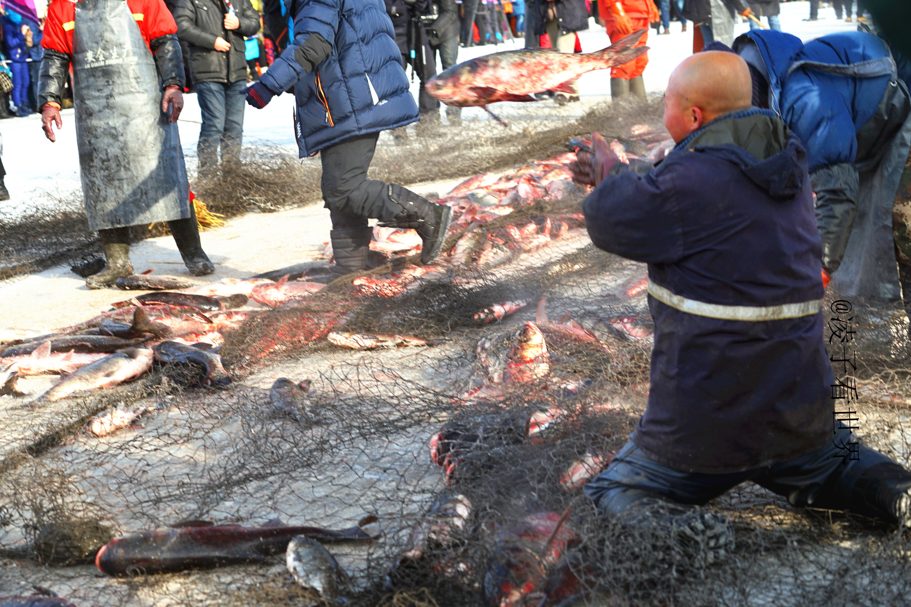 在渔把头的一声令下,硕大的渔网被几十名渔工缓缓拉出冰面,只见那活蹦乱跳的鱼儿,弹跳着卷起来,忽而翻滚,忽而头尾上翘。似乎也在欢腾这出水的瞬间,鱼儿在冰面下待久了要出来透口气。渔工们喊着号子一步步的将大网收拢,看着网中那一条条硕大无比的鱼,围观的人们立刻欢呼起来,引得警察叔叔们一个劲的高声大喊,往后退,往后退。丰收的喜悦洋溢在每个人的脸上,渔工们举起自己亲手捕捞到的大鱼乐得合不拢嘴。