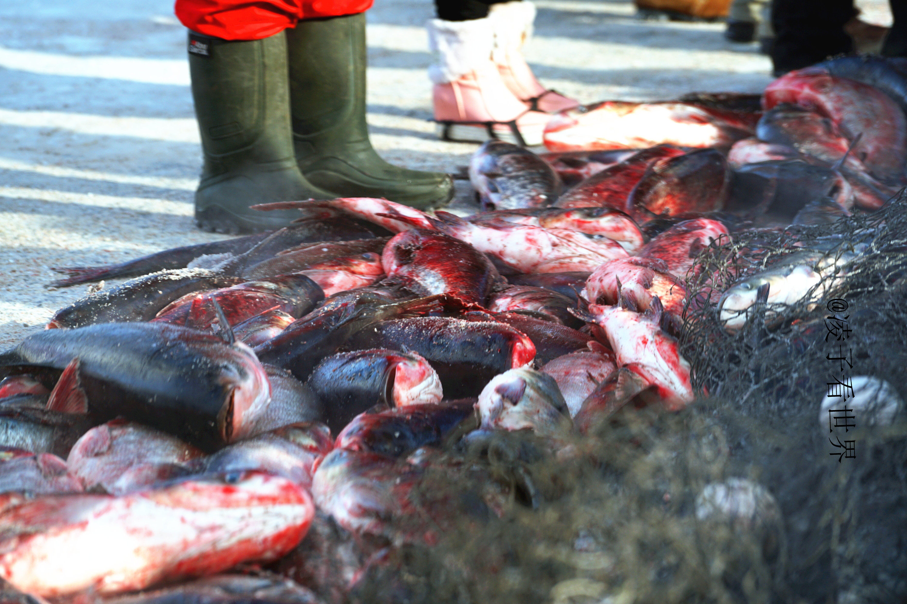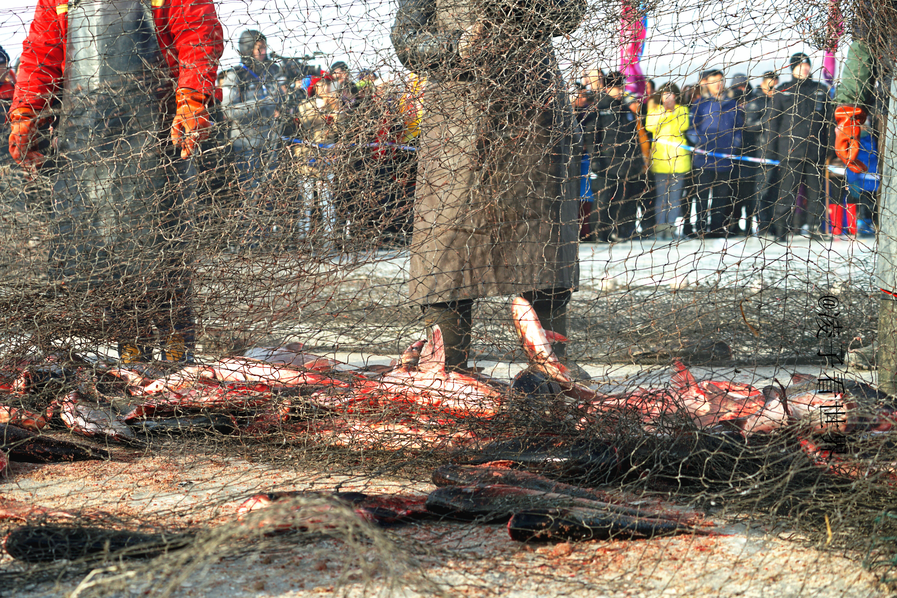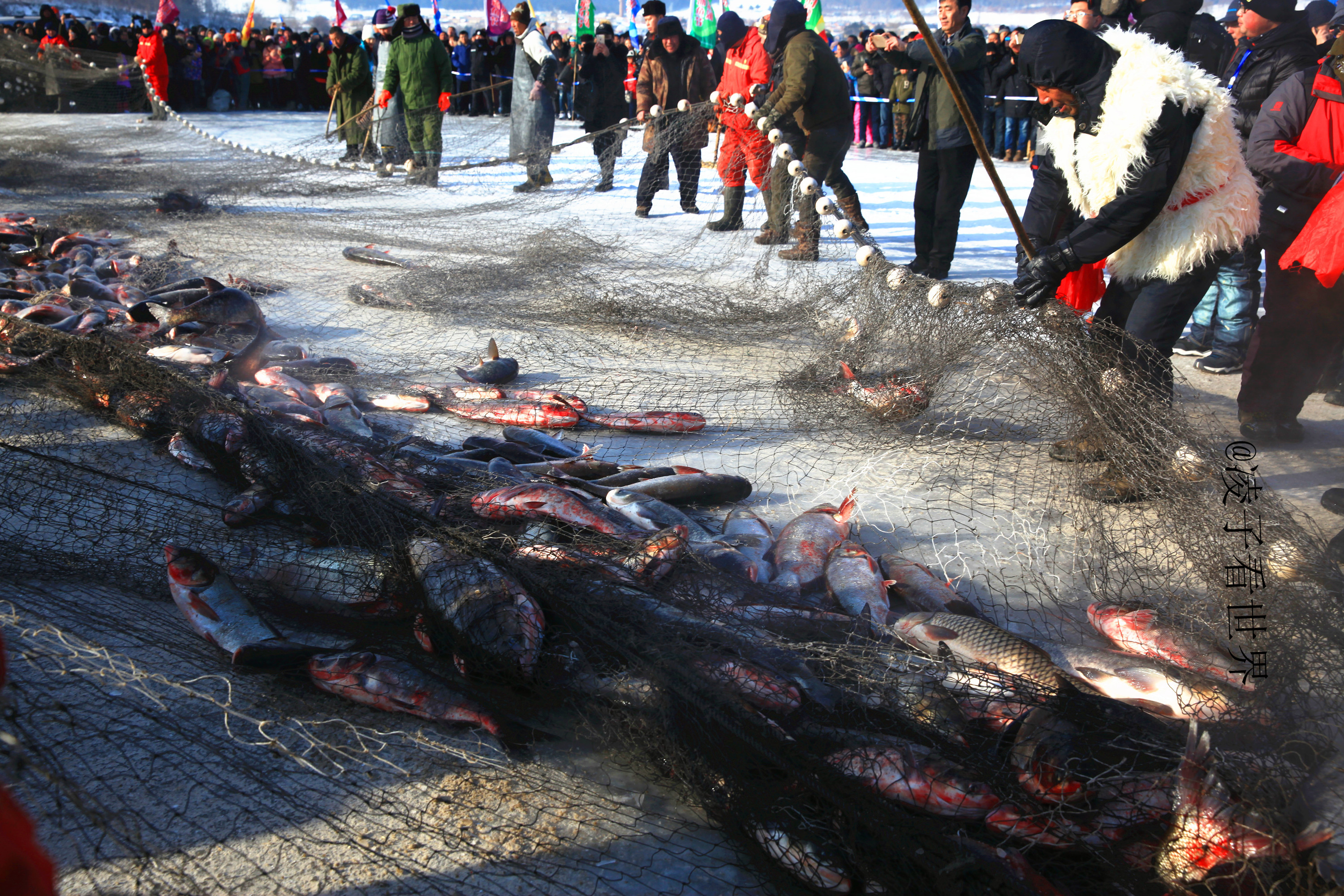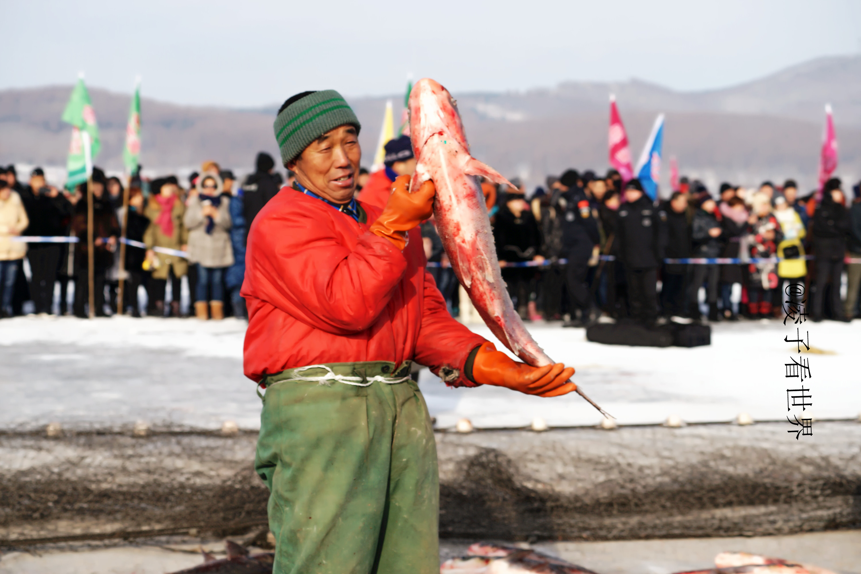 在渔把头的一声令下,硕大的渔网被几十名渔工缓缓拉出冰面,只见那活蹦乱跳的鱼儿,弹跳着卷起来,忽而翻滚,忽而头尾上翘。似乎也在欢腾这出水的瞬间,鱼儿在冰面下待久了要出来透口气。渔工们喊着号子一步步的将大网收拢,看着网中那一条条硕大无比的鱼,围观的人们立刻欢呼起来,引得警察叔叔们一个劲的高声大喊,往后退,往后退。丰收的喜悦洋溢在每个人的脸上,渔工们举起自己亲手捕捞到的大鱼乐得合不拢嘴。