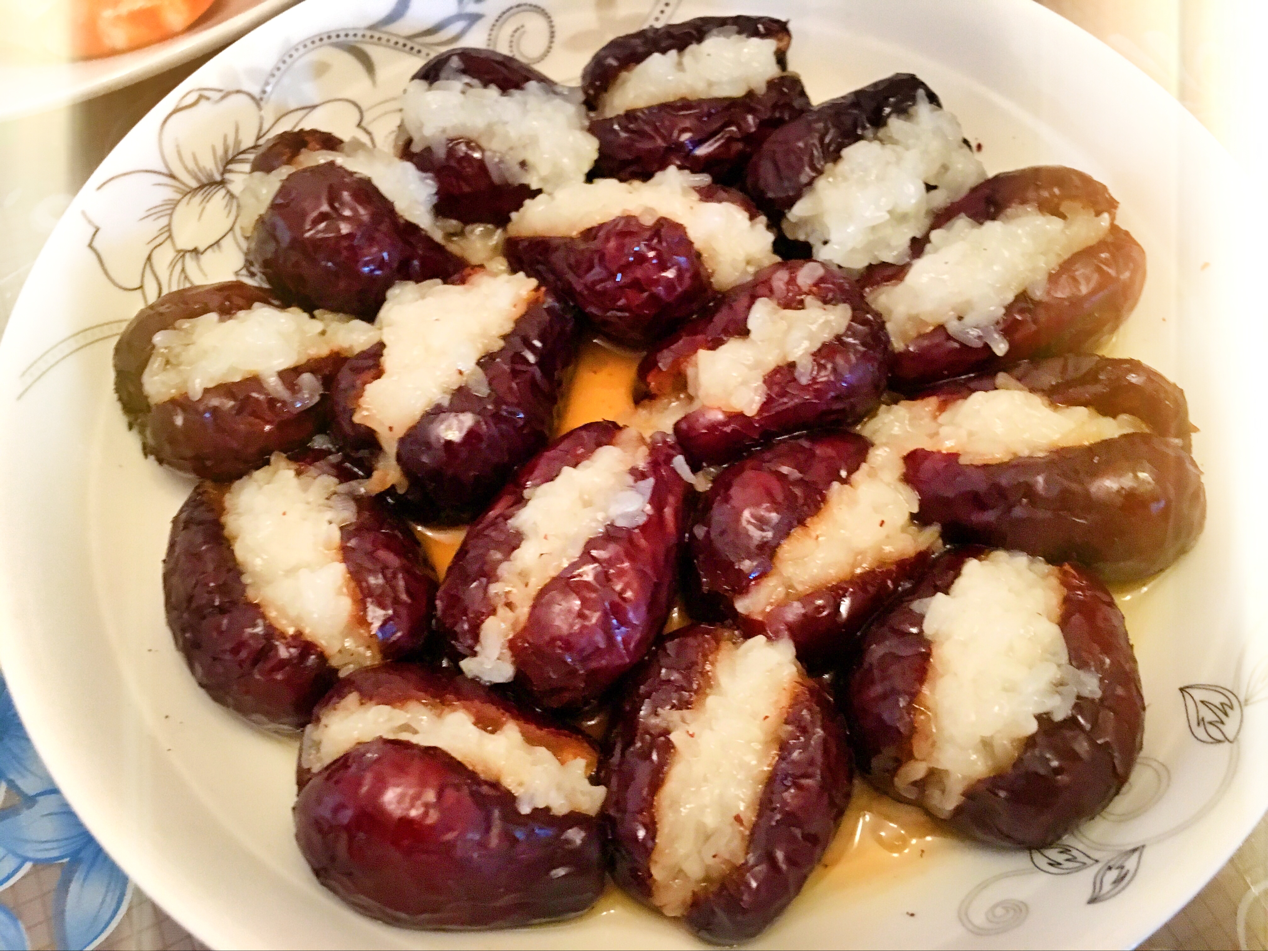 糯米枣,我觉得就是红红火火甜甜蜜蜜。而这个糯米年糕当然就是年年高喽!糯米我是提前蒸到七成熟,然后塞到掏了核的大枣里,装盘上锅蒸20分钟即可,记得蒸的时候要撒一点水在大枣上,因为大枣是干的。如果不洒水蒸出来就会发干,不好吃。糯米年糕,一层层夹好豆沙馅,直接装到大碗里上锅蒸就可以。