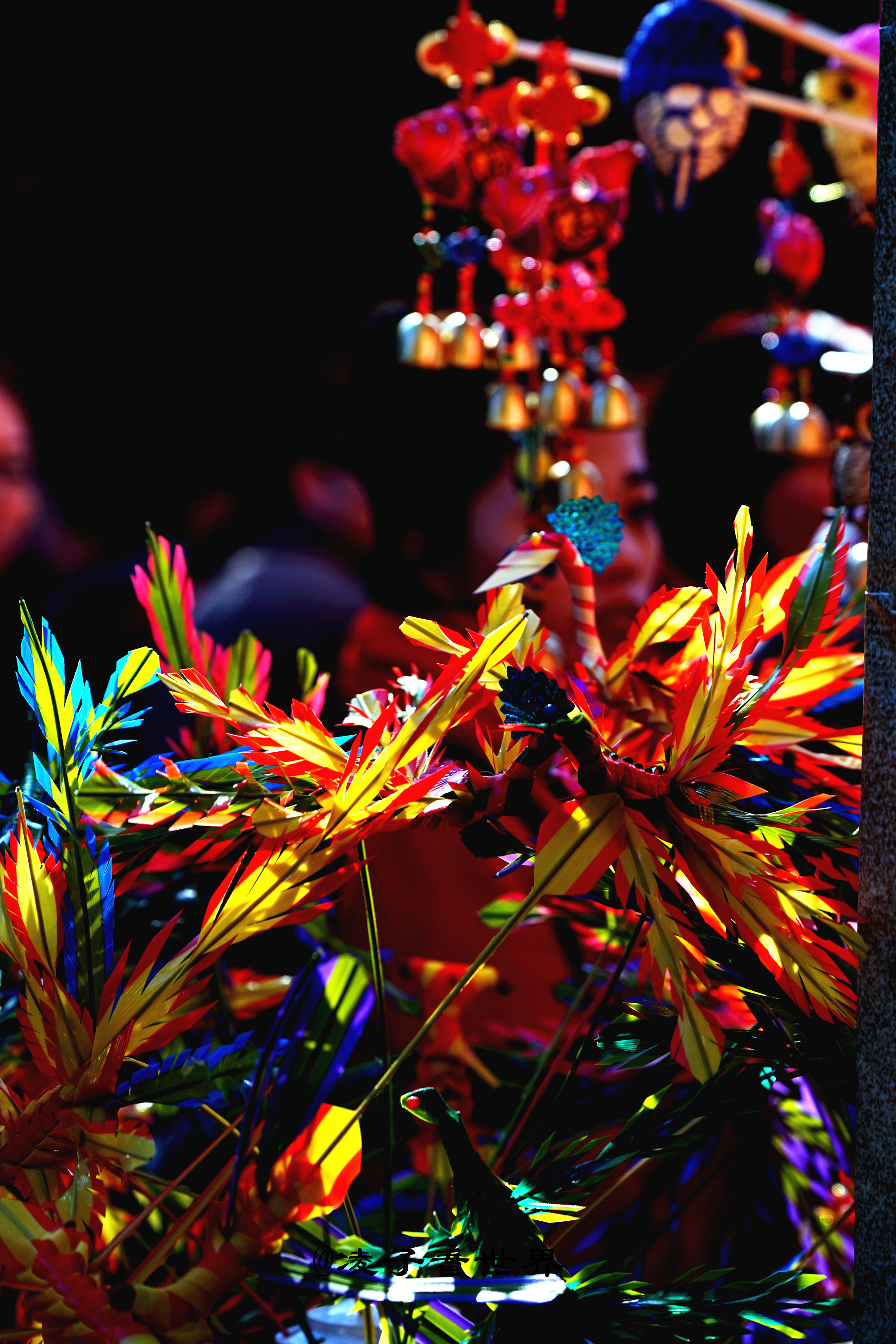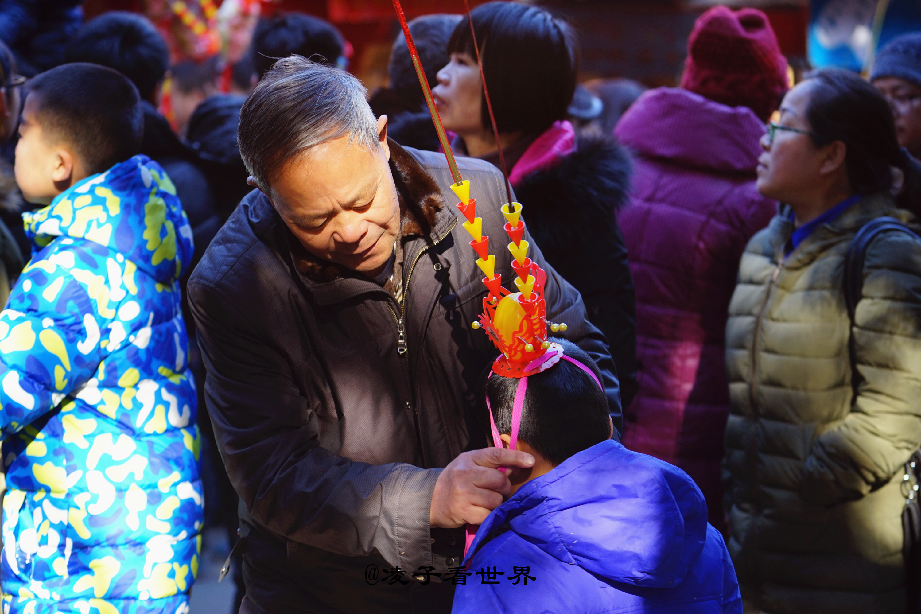 庙会上各种各样的小玩偶,无论是皮影还是这五彩的扎蚂蚱,都是传统的小玩物,孩子大人都感兴趣,好多大人买它们是为了找回儿时的那点记忆,那点乐趣。孩子们觉得新鲜,没见过过去的这些传统玩物,要一个带回家慢慢的琢磨,把玩。