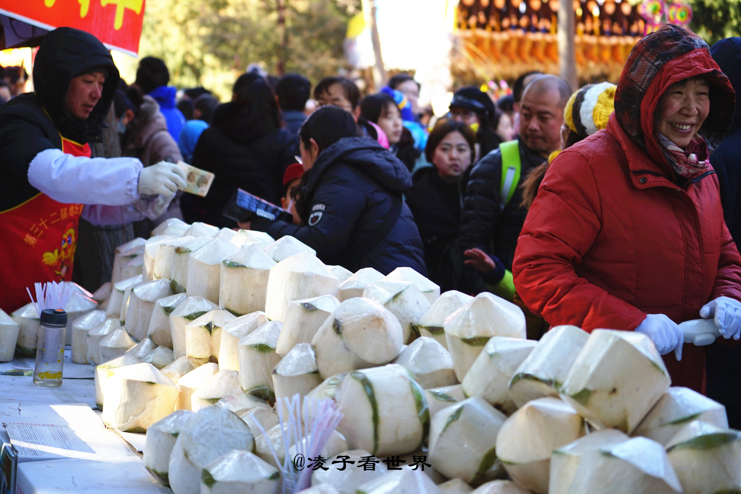 庙会上的美食街人头攒动,这里可是孩子们最喜欢的地方,来这吃什么都觉得香,无论是煎饼,烤串,麻辣粉,杏仁粉,卤煮等等都是庙会上最受欢迎的小吃。还有这来自海南最新鲜的椰子,二十元一个都抢着买。
