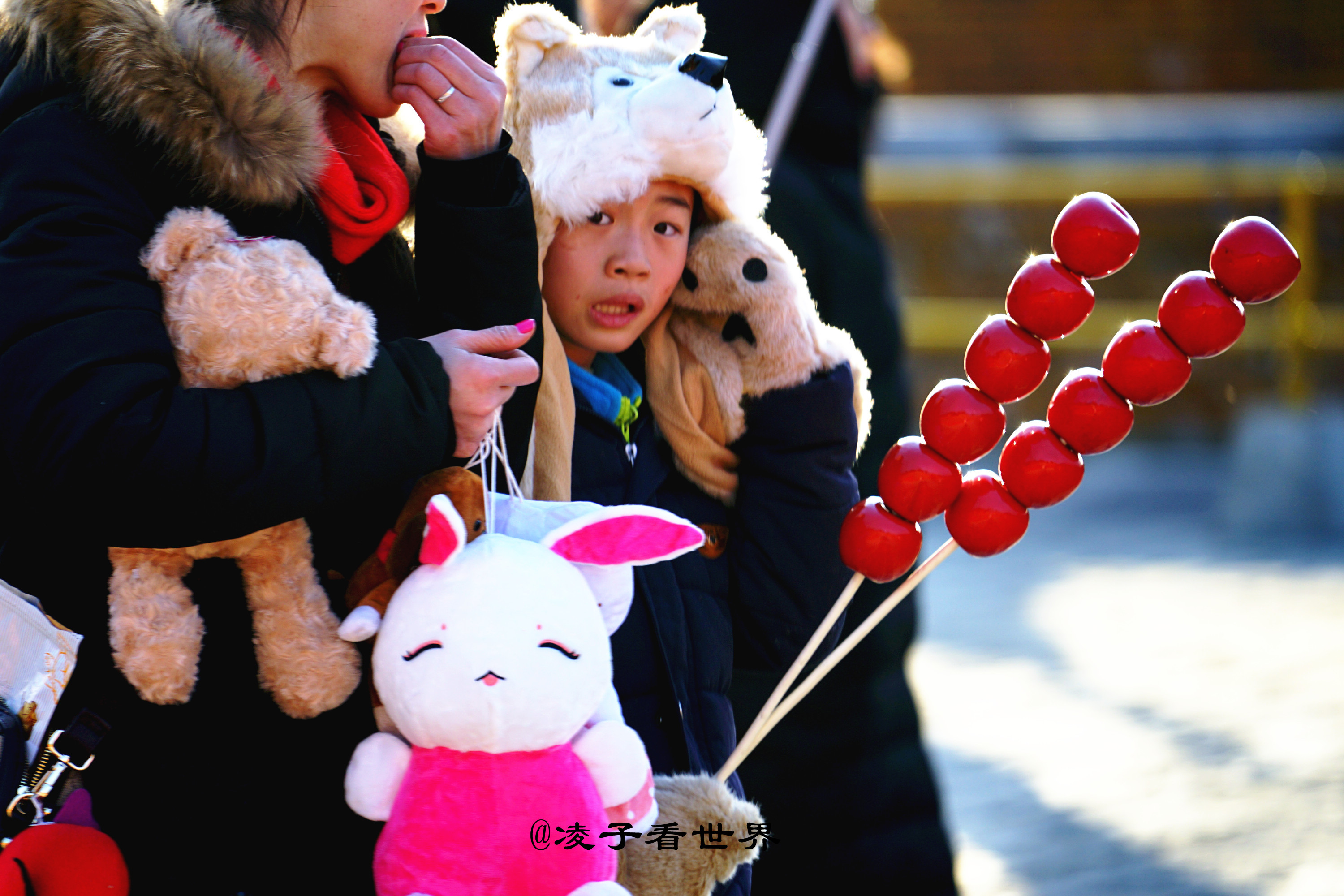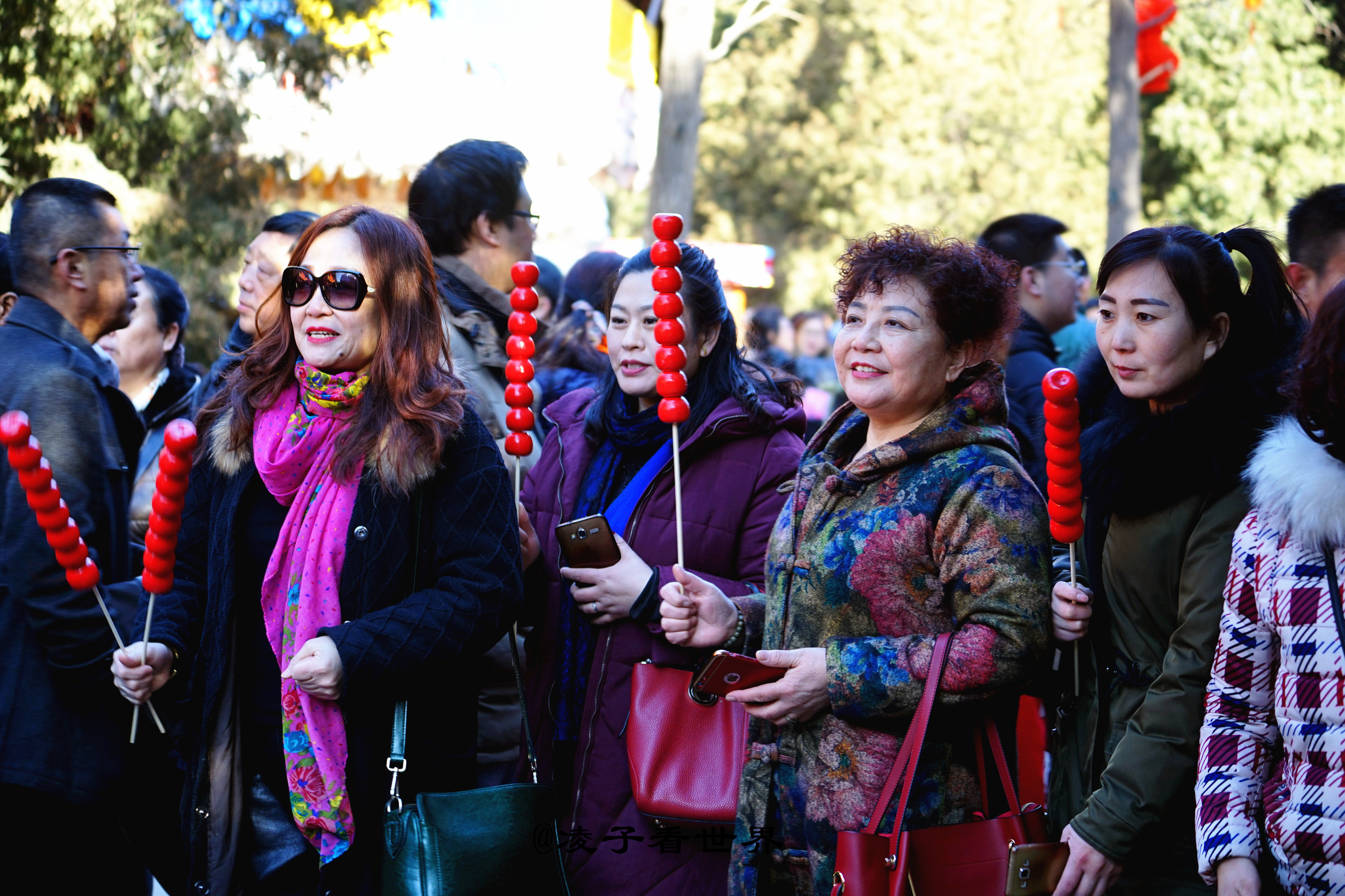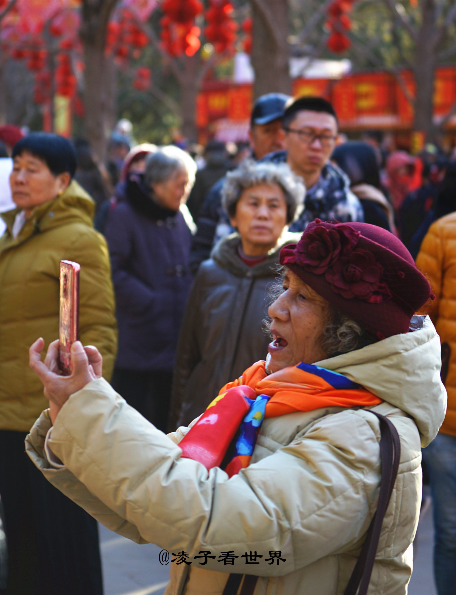 一家老小在庙会上合个影也是对这一团圆日子的最好留念,日后想起来也是幸福满满。大妈们最喜欢儿时的记忆,瞧!这一人手里一个鲜红的大糖葫芦。就是她们小时候最好的零食,如今还是那么的爱不释手。七十多岁的老奶奶也高兴的玩起自拍,可见这个时代手机对人们带来了无限的乐趣。拍完奶奶顺手就发到了朋友圈等着点赞。老奶奶直感慨手机功能太强大!