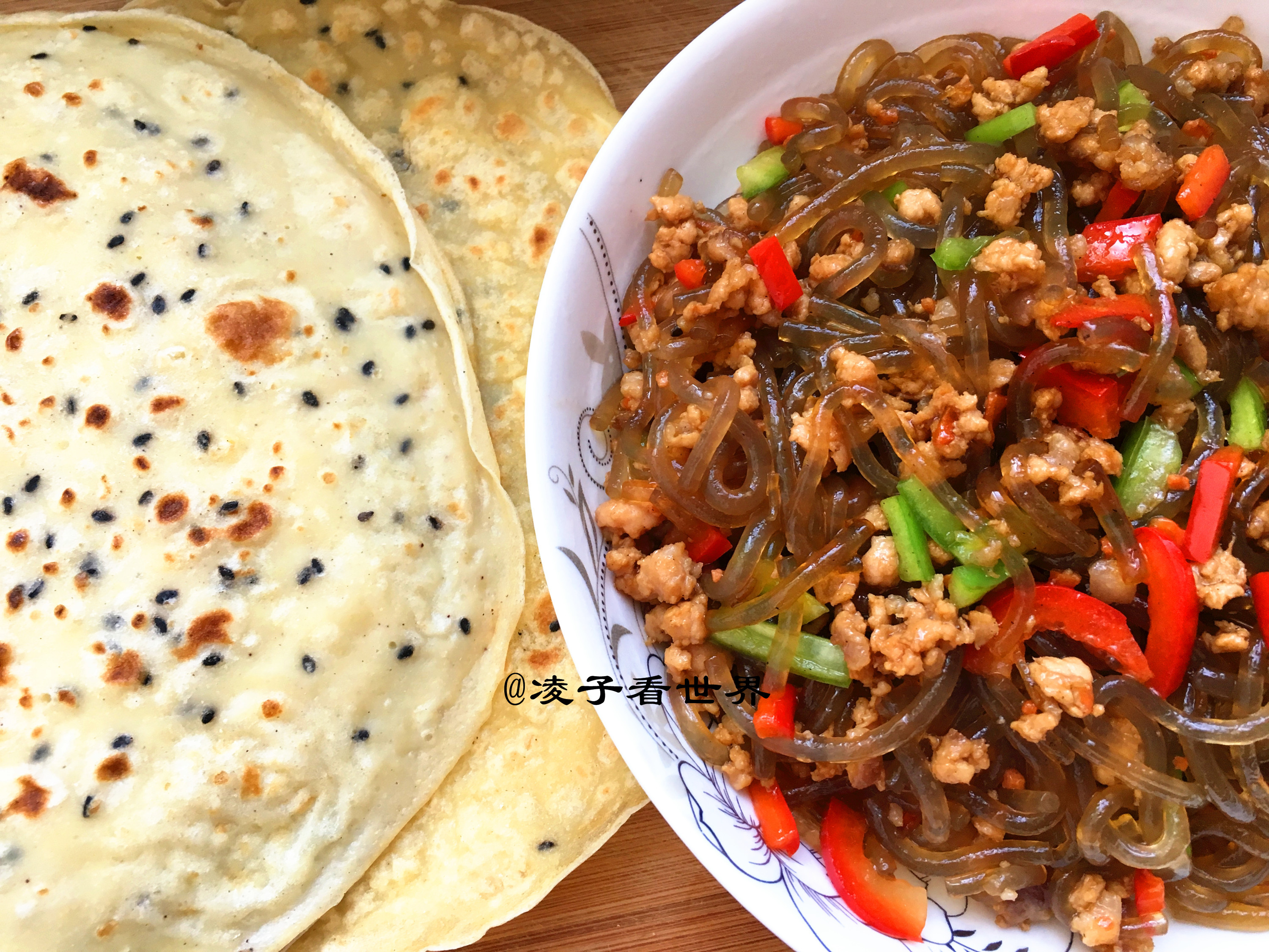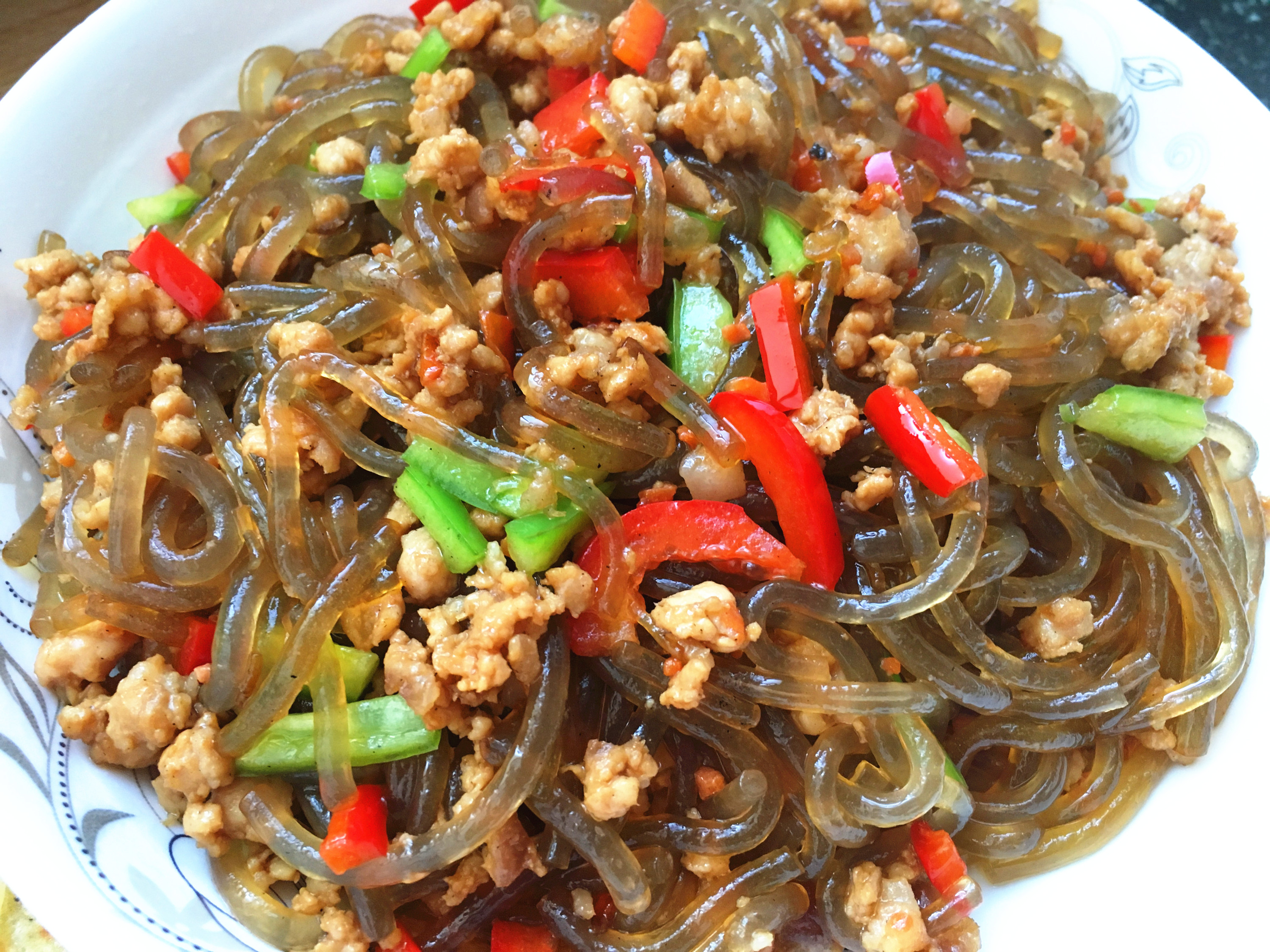这个肉末炒粉条一定要说一下,粉条必须是红薯粉,而且要提前煮熟,拌少许油以免粘连,放着备用,首先把肉末用葱姜炒熟,然后倒入备好的粉条,放入作料翻炒几下,再加入少许的青红椒丁,炒两下即可出锅。这样做出来的粉条卷饼那可是一绝哦!北京人吃法是卷粉丝,这个吃法是陕西人的吃法。我想说还是陕西的吃法好吃,不信你可以试试。