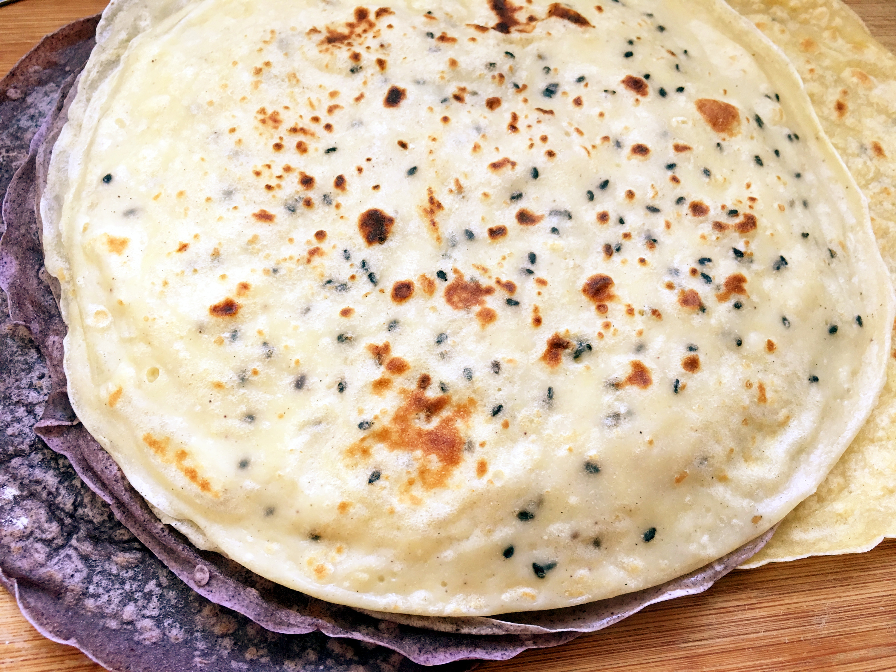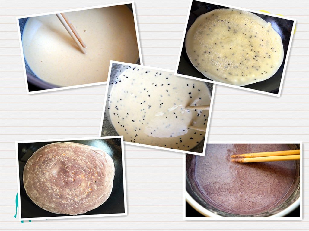 这春饼我用的是黄豆面,小米面,白面粉,按一比一的比例和成面糊,里面加了黑芝麻,这样既好看又好吃。另一种用的是黑米面,面粉,也是按一比一的比例调成糊状。这里要注意的是这个面糊要提前一个小时和好,放在那里醒发。这样烙出来的春饼是又劲道又好吃。而且烙的时候还不易粘锅。