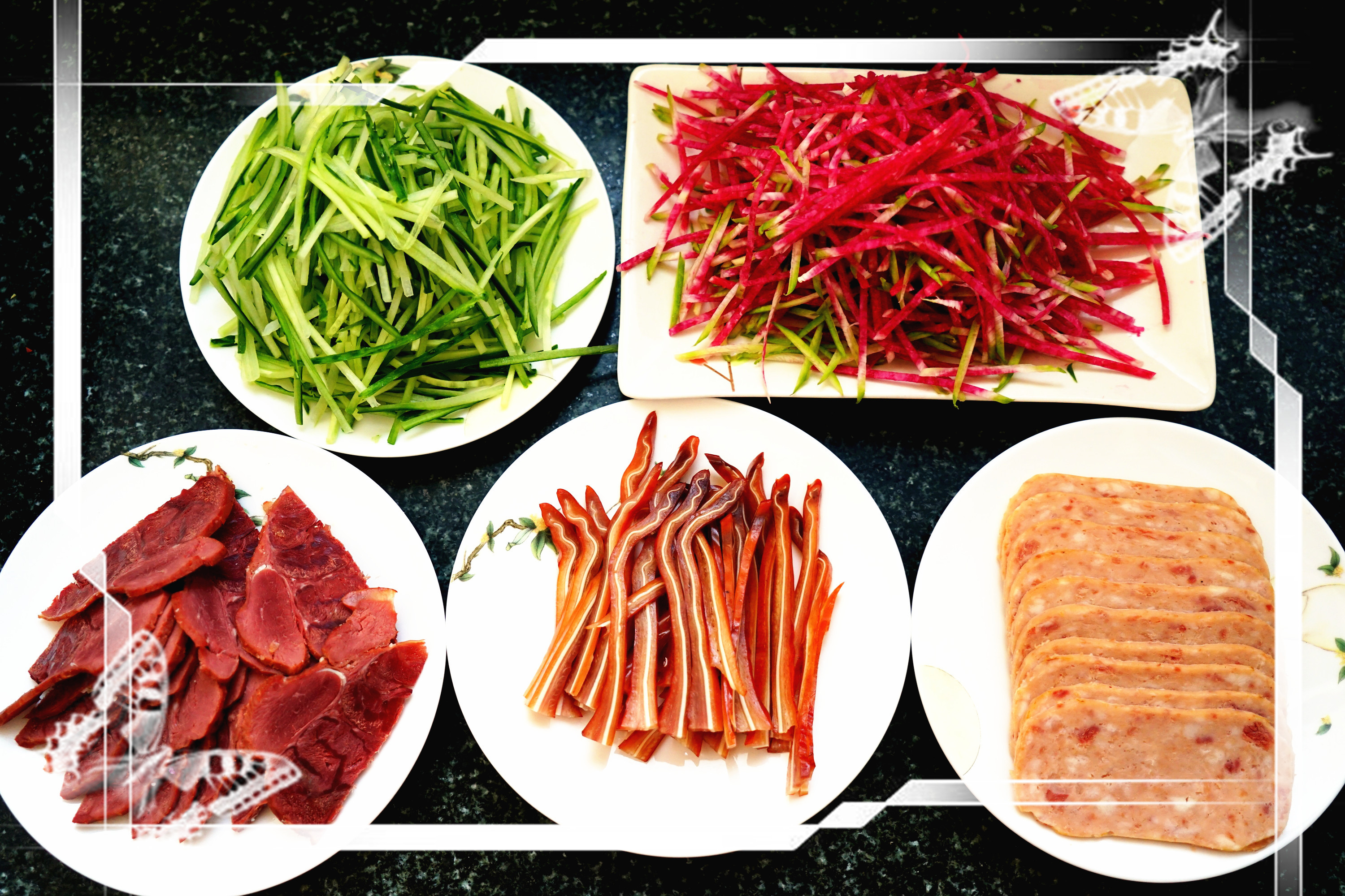 黄瓜拌耳丝这个本应该直接凉拌吃就行,今天孩子非要卷起来吃,就给他卷了一个,我也卷一个试试口感,嗯,相当的不错,黄瓜脆,猪耳朵丝也是脆生生的,有嚼头。赞一个!这吃饭啊,就是要时时尝试新鲜的吃法。