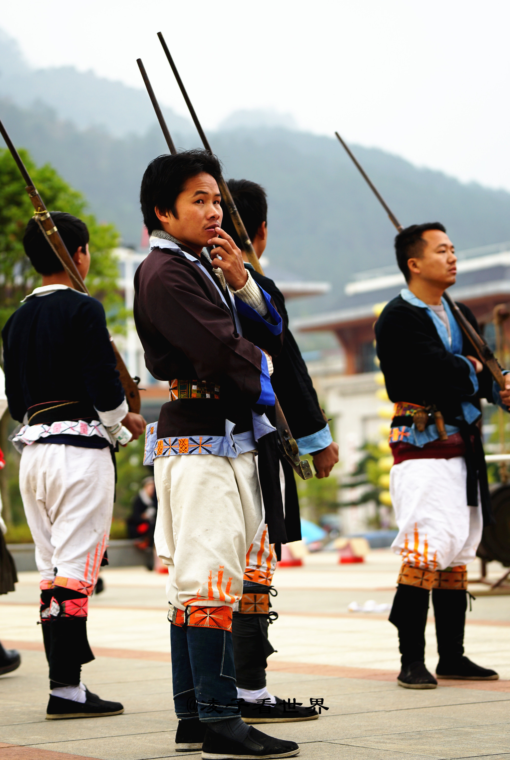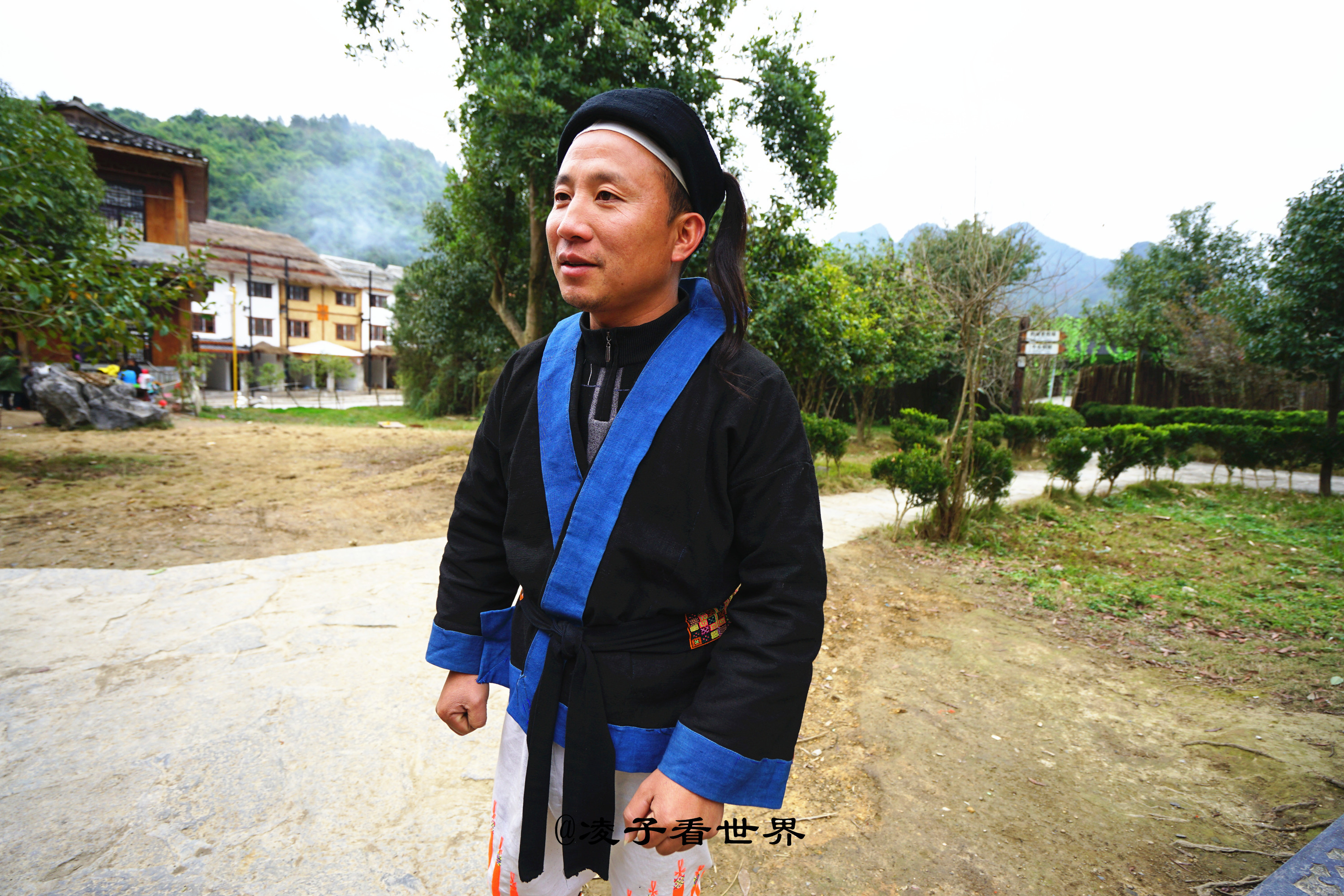 白裤瑶寨男女在成年时,头发便终身不剃剪了。男子用白布把拧成一股的头发旋紧从脑后盘绕至前额。这位就是瑶族古寨的村长,再向大家介绍他穿的服饰。
