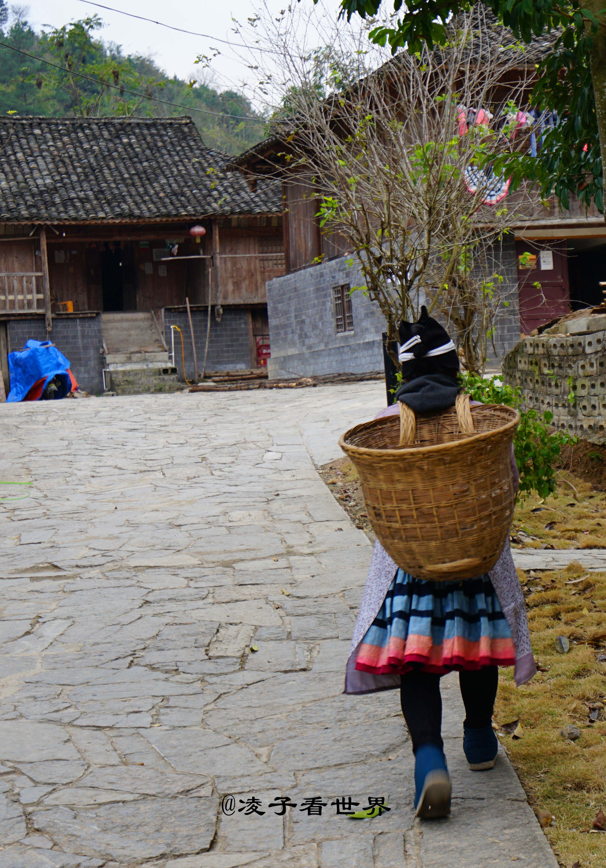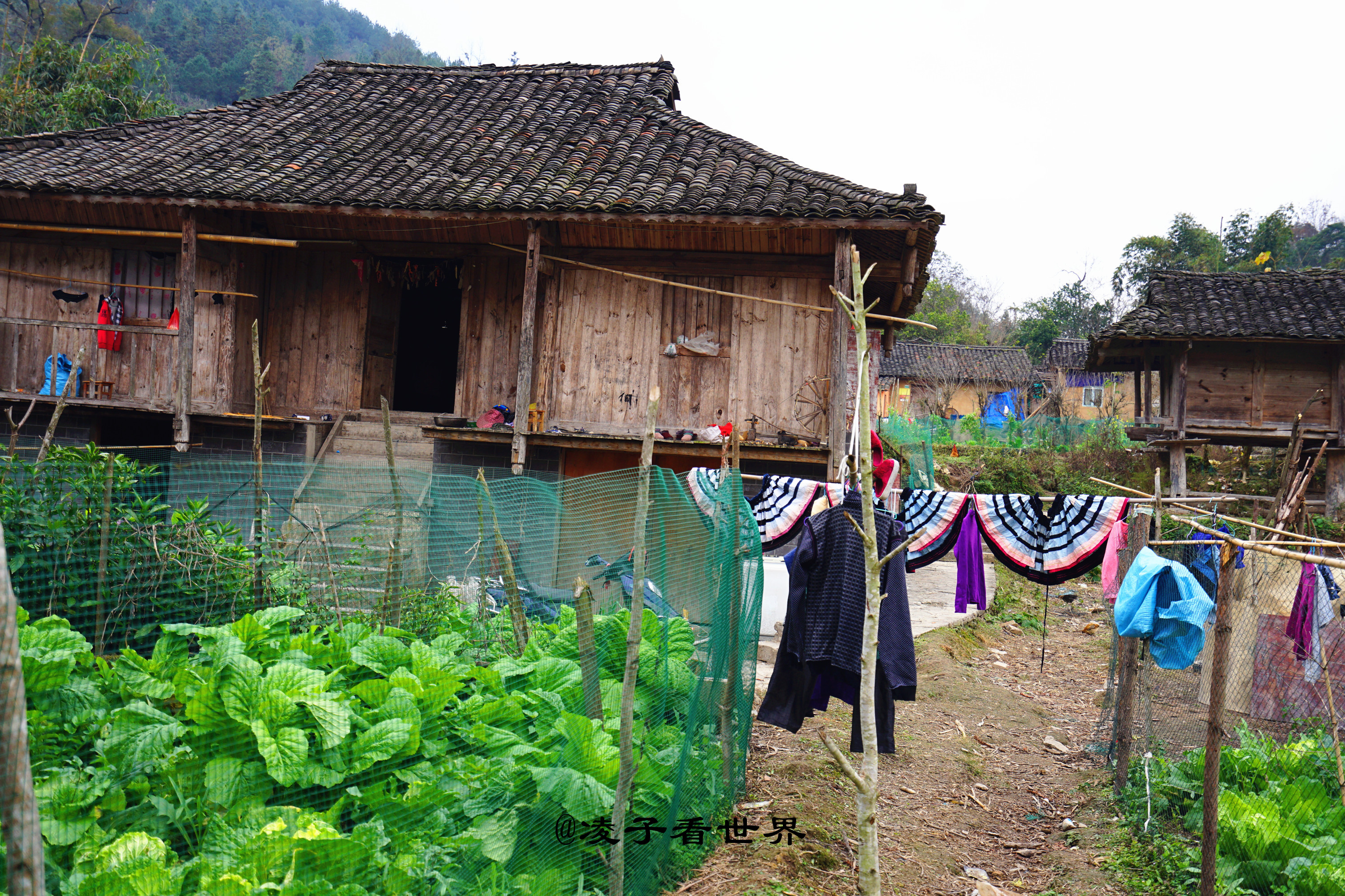 妇女则把发梳结成髻用黑布巾罩起来,再用黑布巾两端的白布带缠紧。留头发、包头巾的习俗白裤瑶称其为“包头禁发”,这种装束习俗在我国少数民族的风俗里绝无仅有。对于头发白裤瑶格外珍惜,不仅成年男女包头禁发,长在头上的发辫不再剃剪,即使是日常脱落的头发,也要谨慎地拾起用纸包住夹在篱笆里收藏好。这位大嫂正在自家门口洗菜。