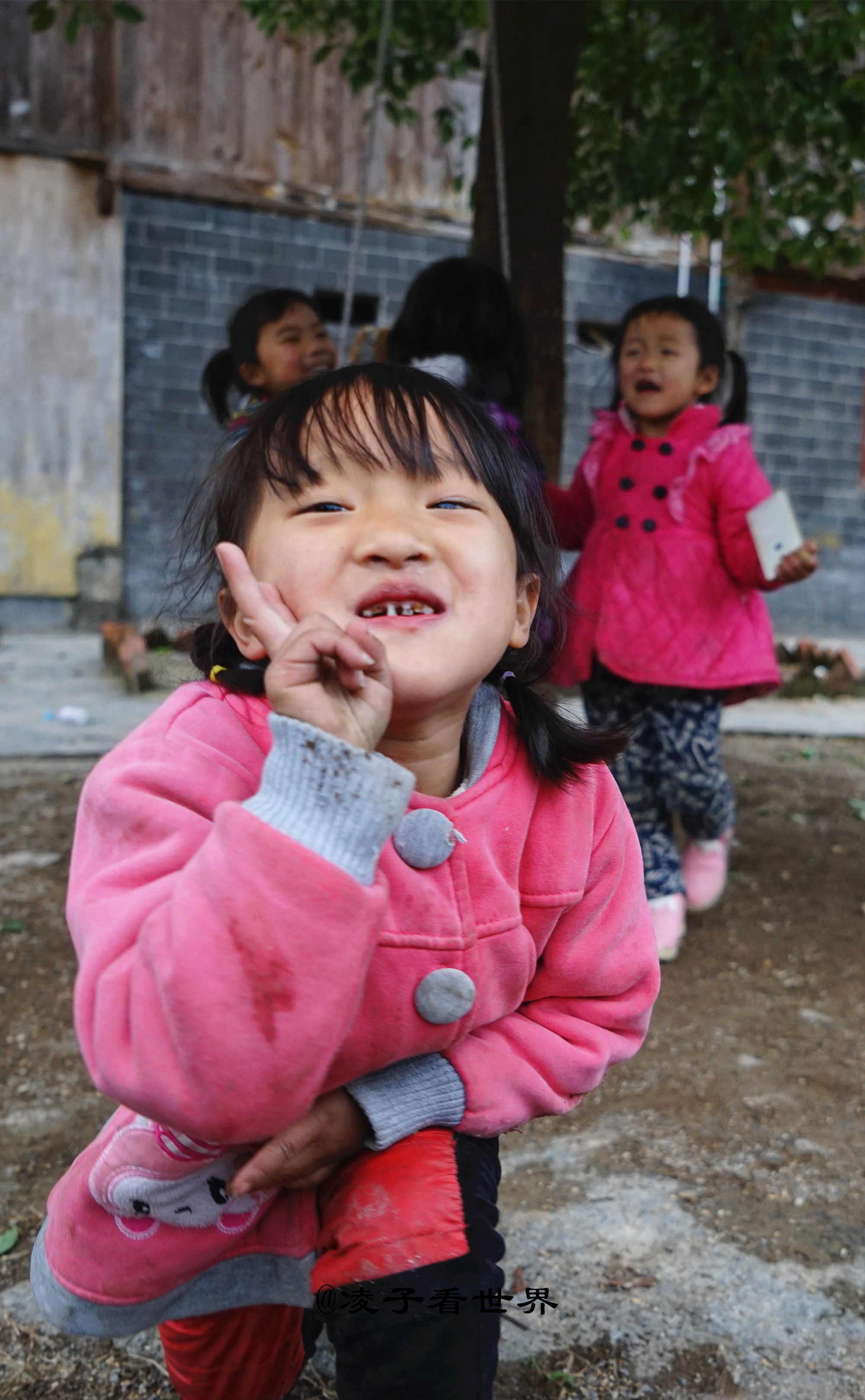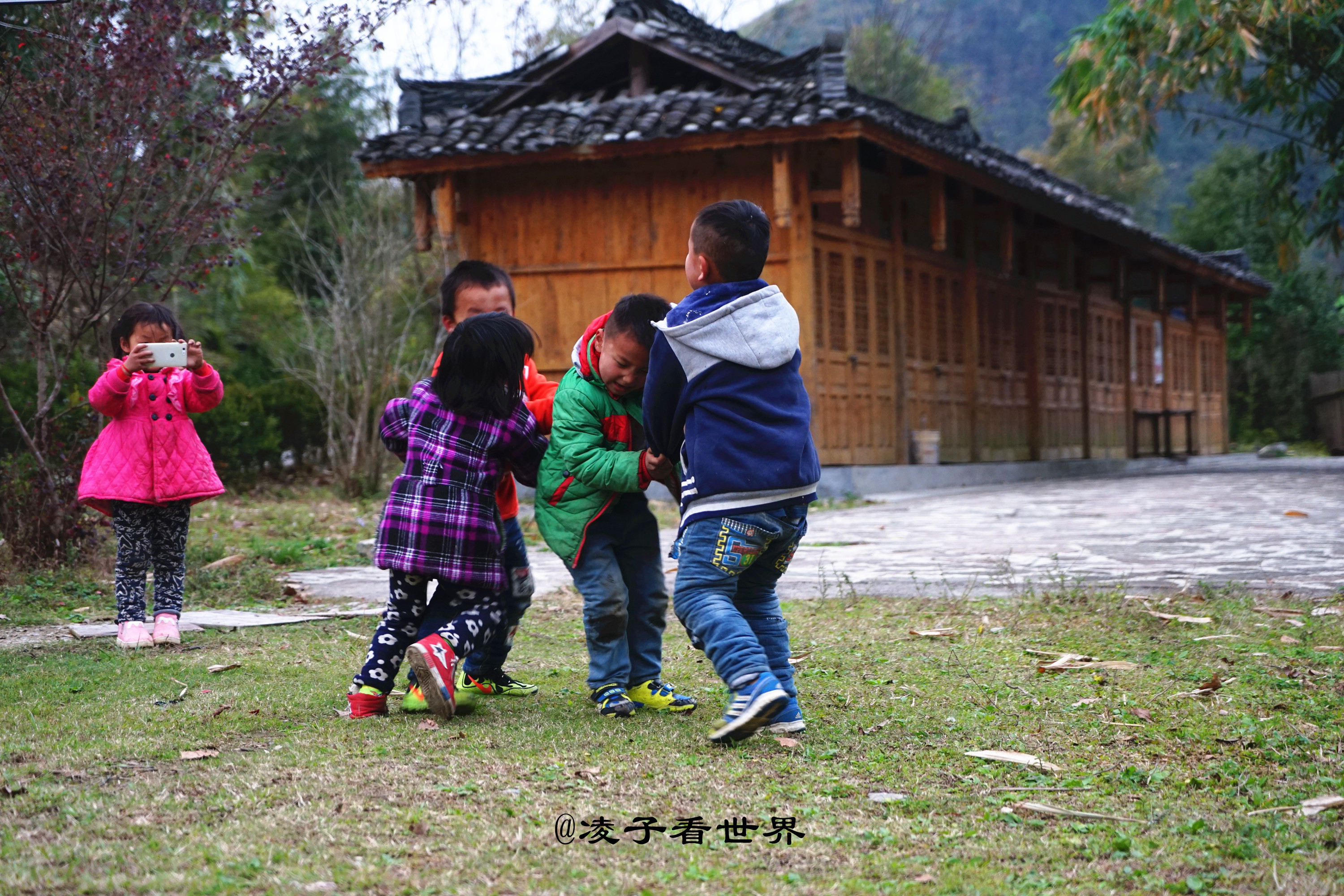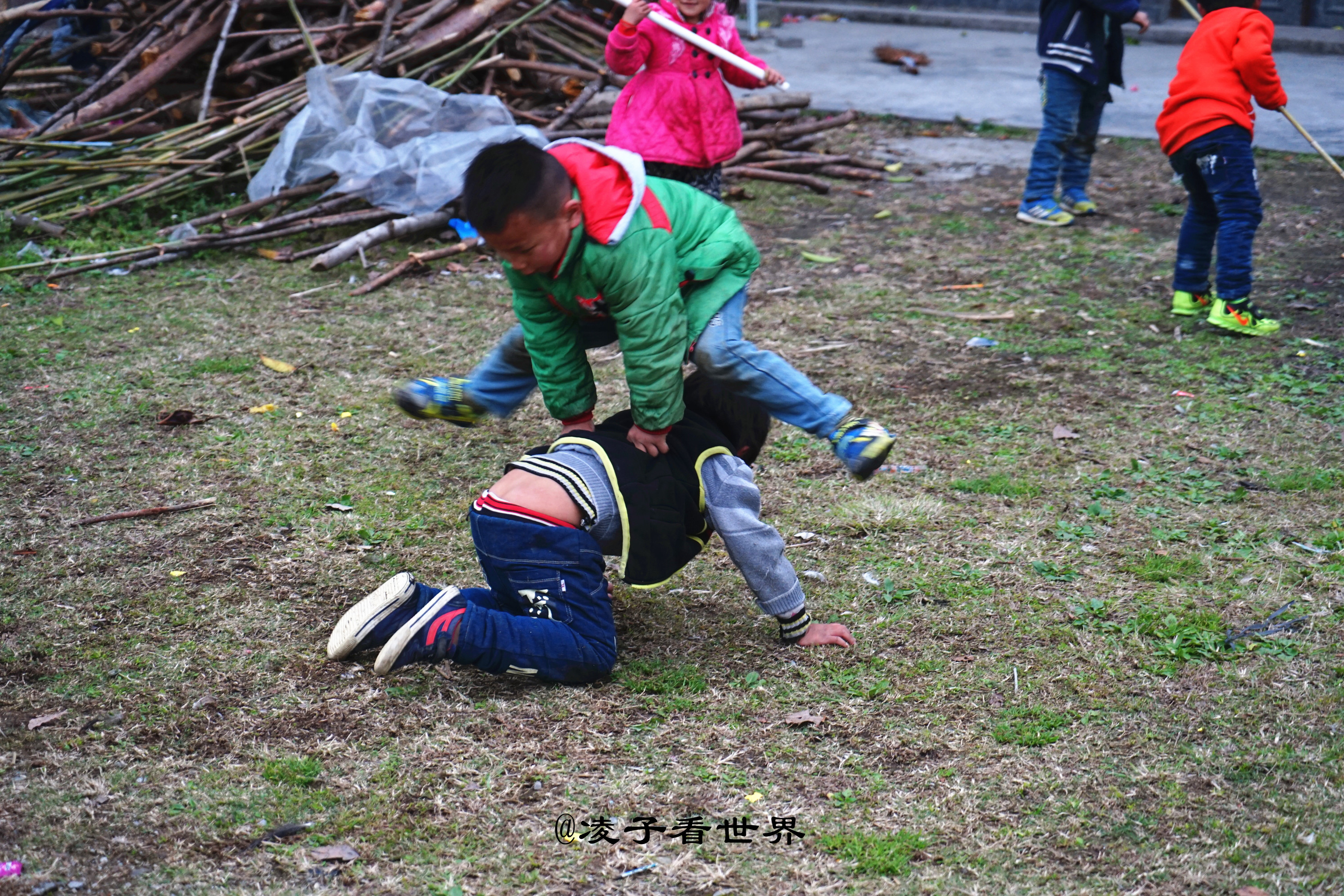 村子里可爱淘气的孩子们肆无忌惮的在草地上玩耍着,有人走近他们也不理会,继续他们的打架游戏。看看这个小妹妹最喜欢抢镜。