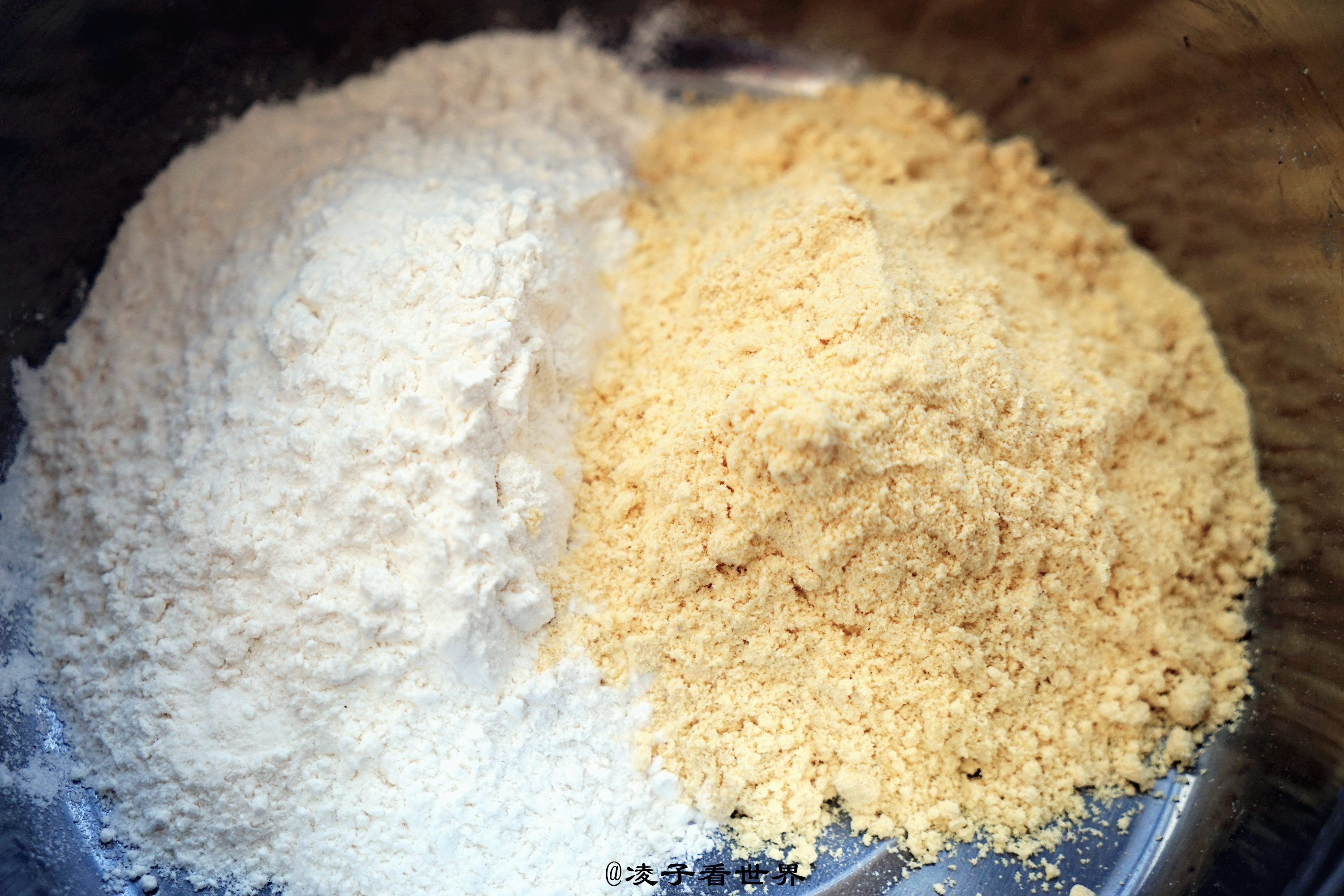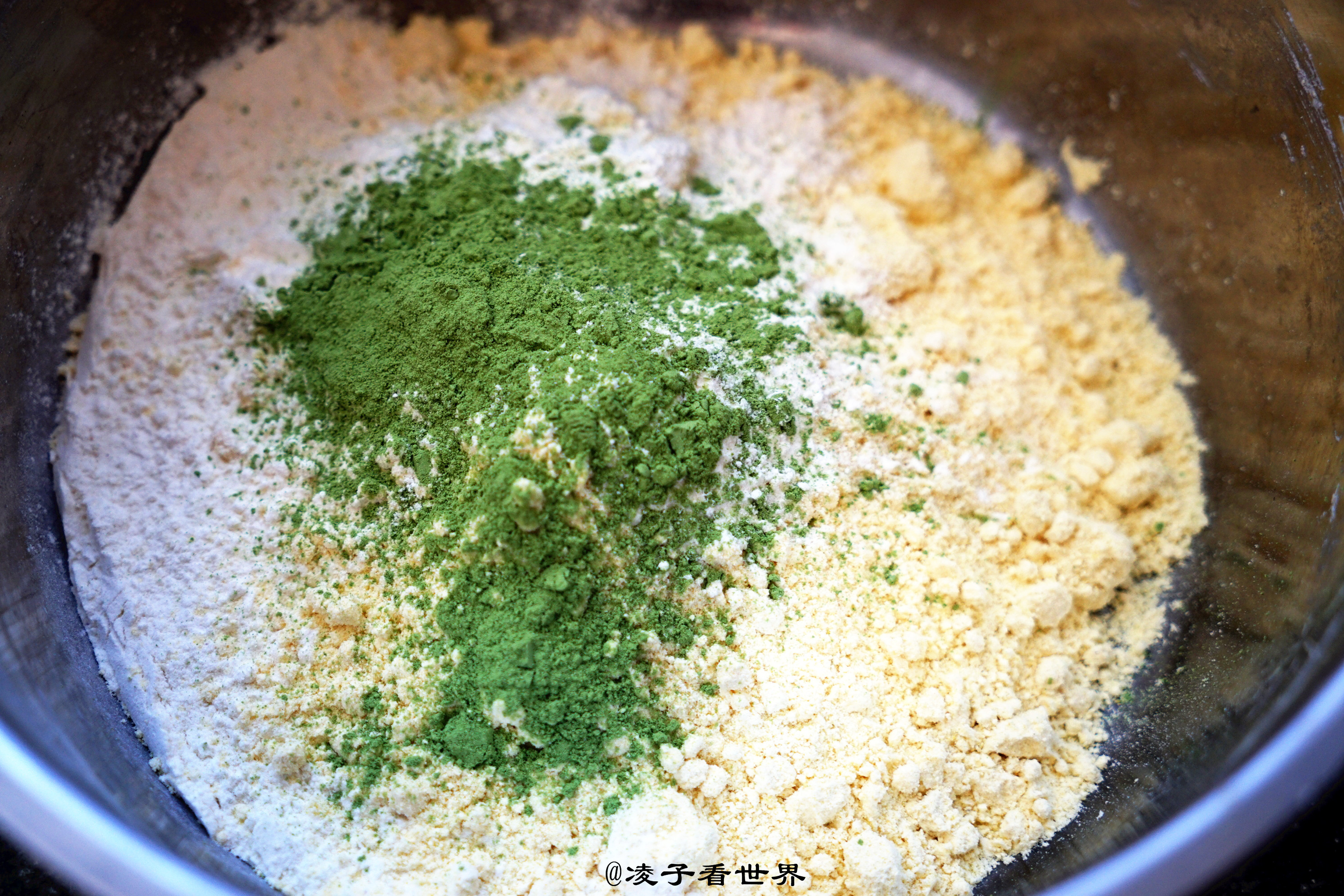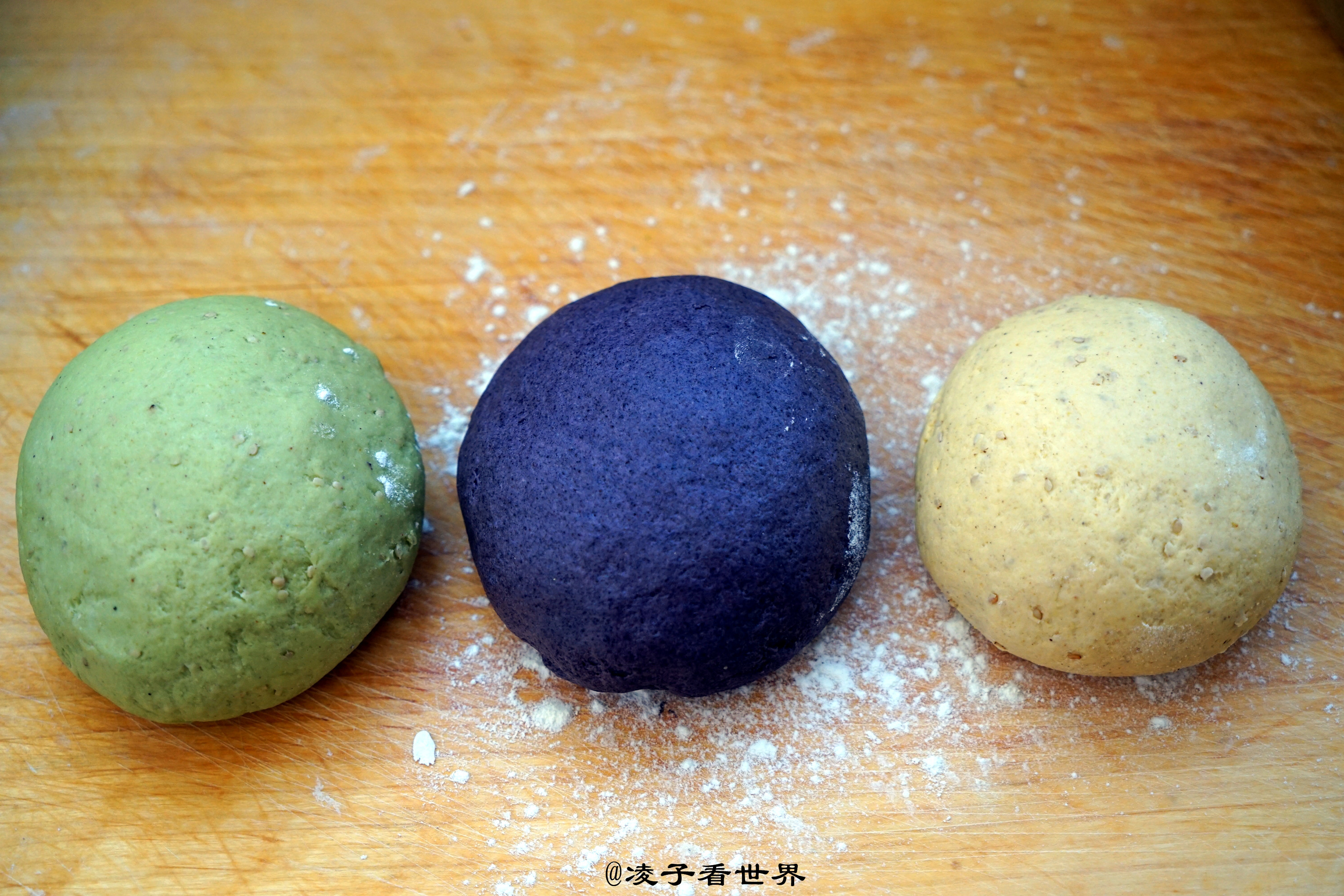 这次三块面我都按一比一的比例调配的,紫米粉面粉1:1。黄豆粉面粉1:1,小米粉面粉1:1,这个里面加了青汁粉,颜色是绿的,更好看一些。这样做也是为了粗细搭配,营养更全面,更好吃。