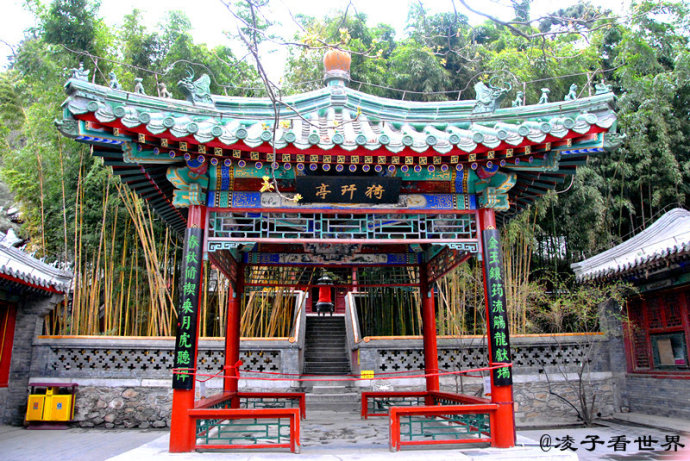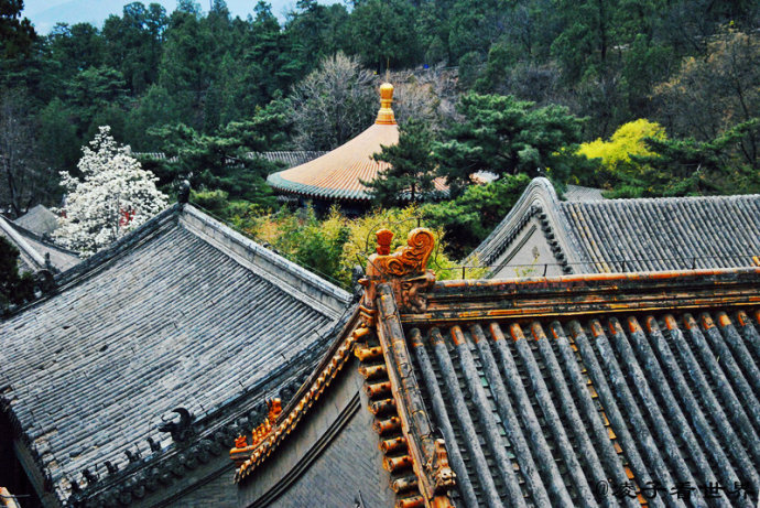 站在寺院的后山上可以一览潭柘寺的全景,千年青砖碧瓦的寺庙被淹没在这郁郁葱葱的松柏中,宁静而淡然。