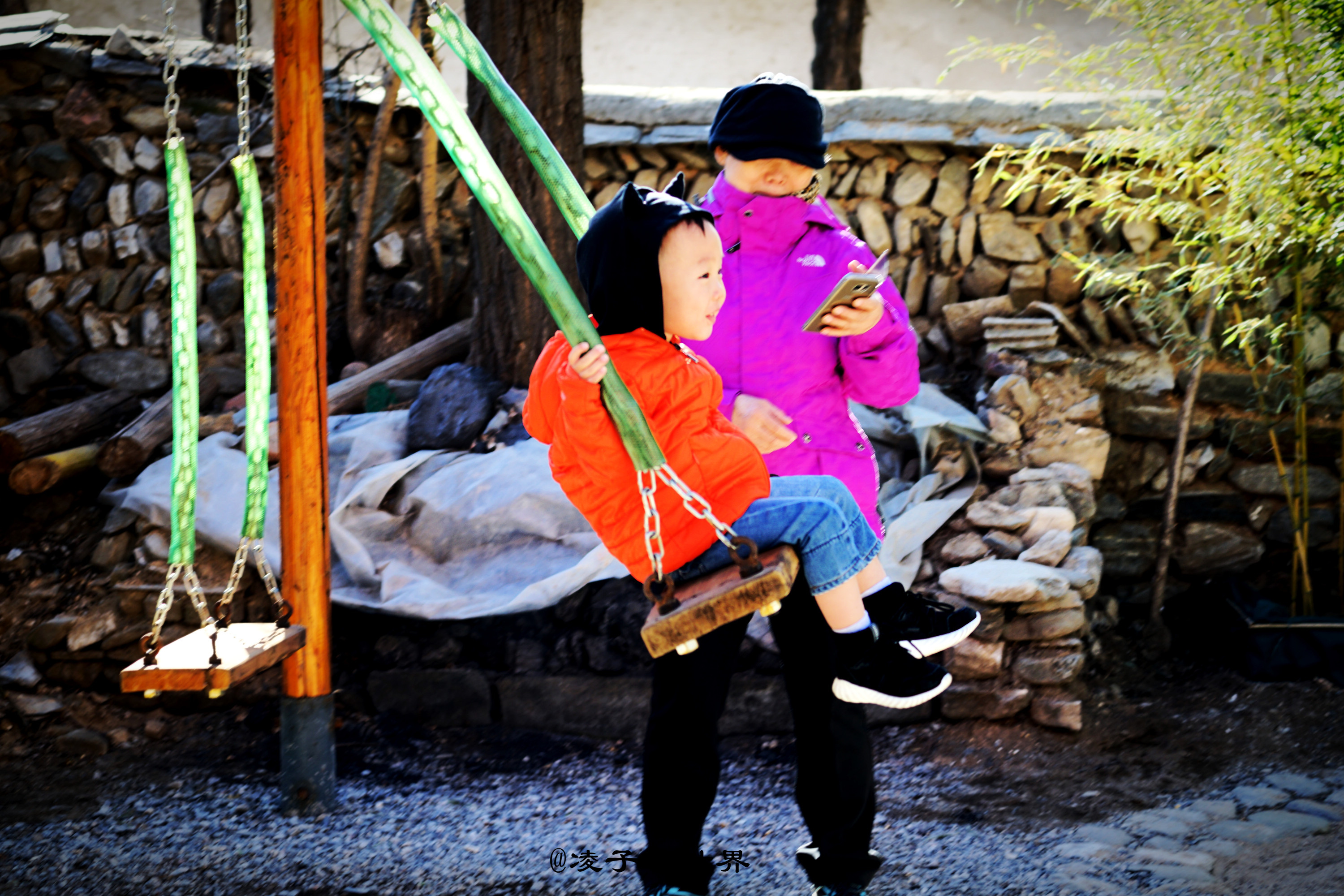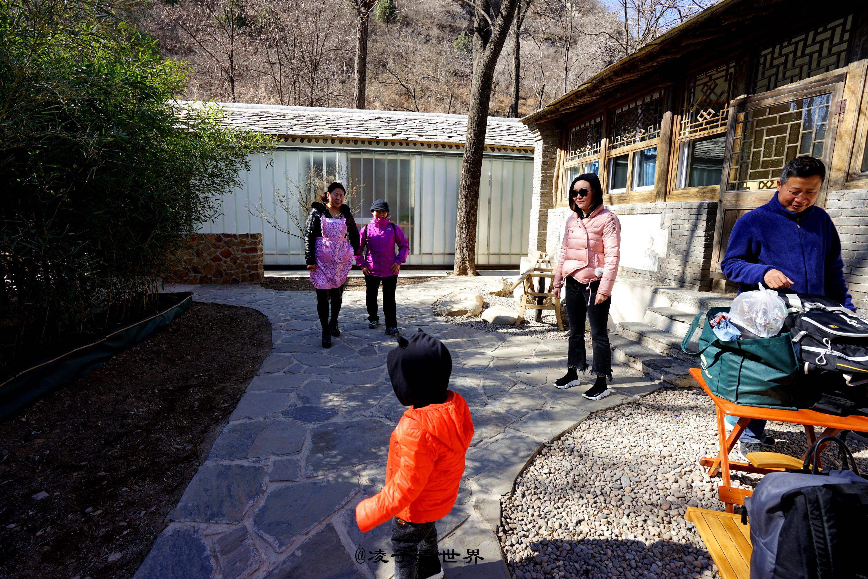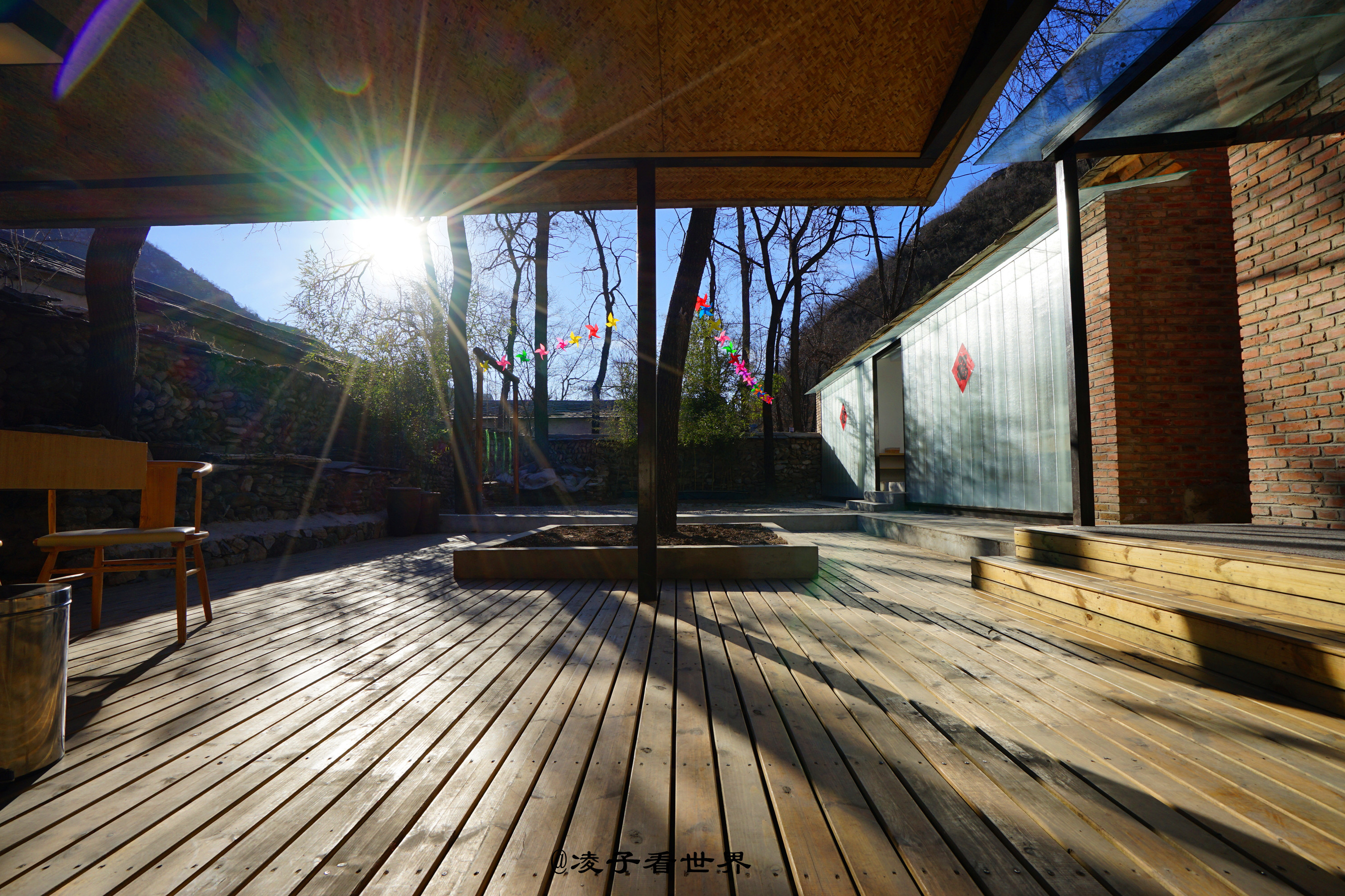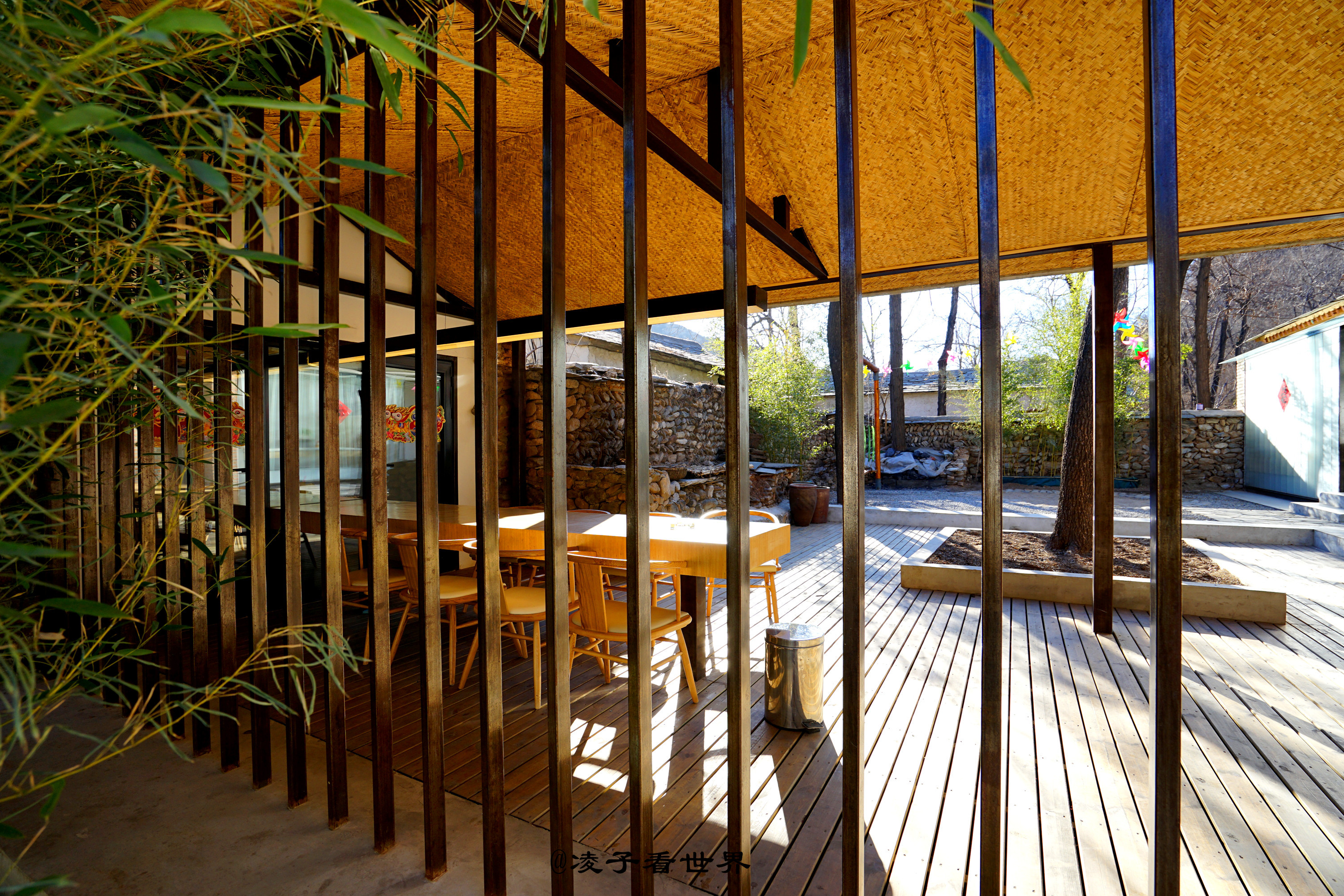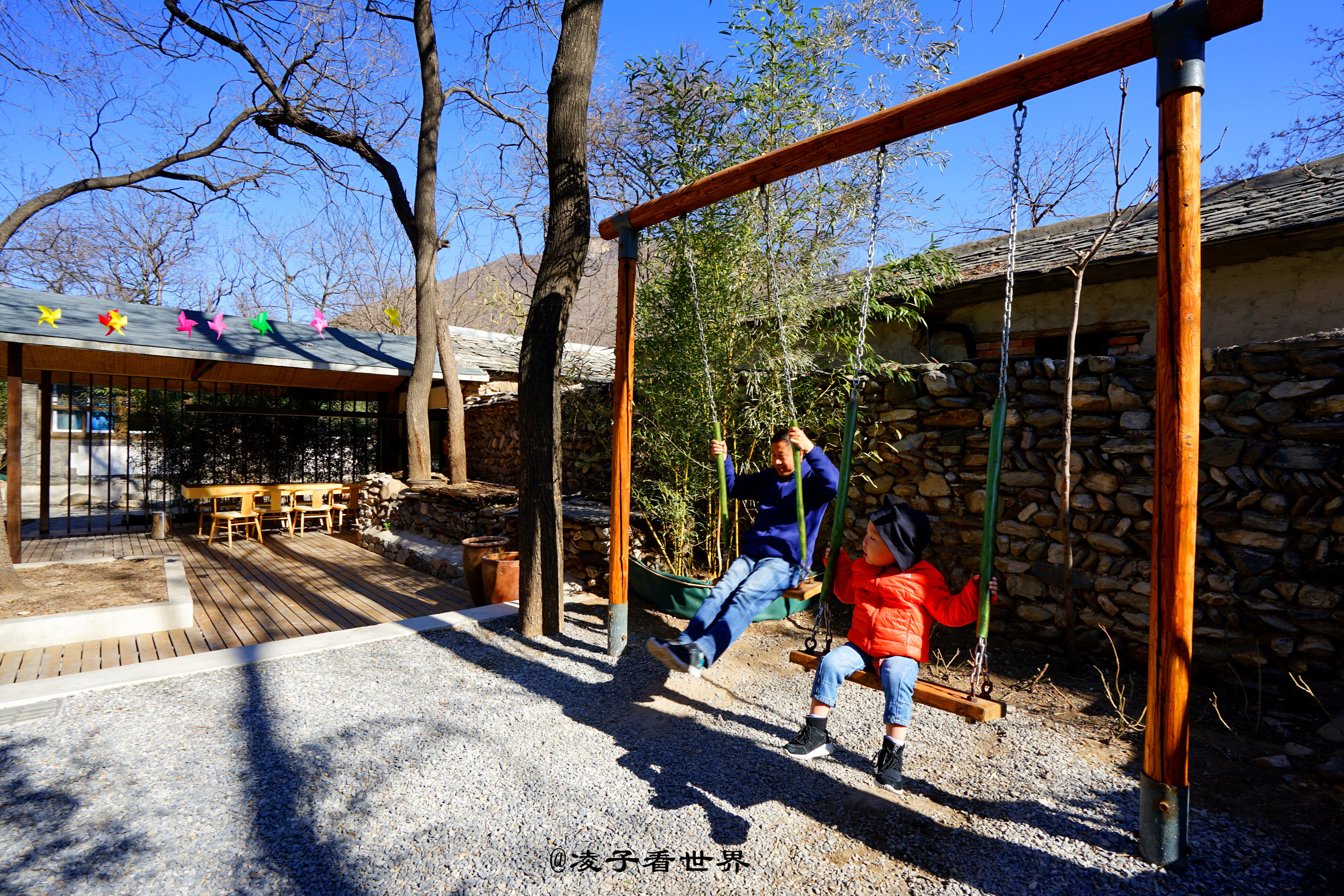 厢房对面是一个宽敞的半开放露天餐厅,园中也有一株大槐树,餐厅右手边还保留原来老房子的模样,那一块块的青石被整齐的码放成不高不矮的墙体。墙根下架起的两个秋千,是孩子们最喜欢的游乐天地。地面被铺上木条,复古而现代。春日里一家人围坐在这里喝茶聊天,吃饭说笑,那画面别提多温馨。