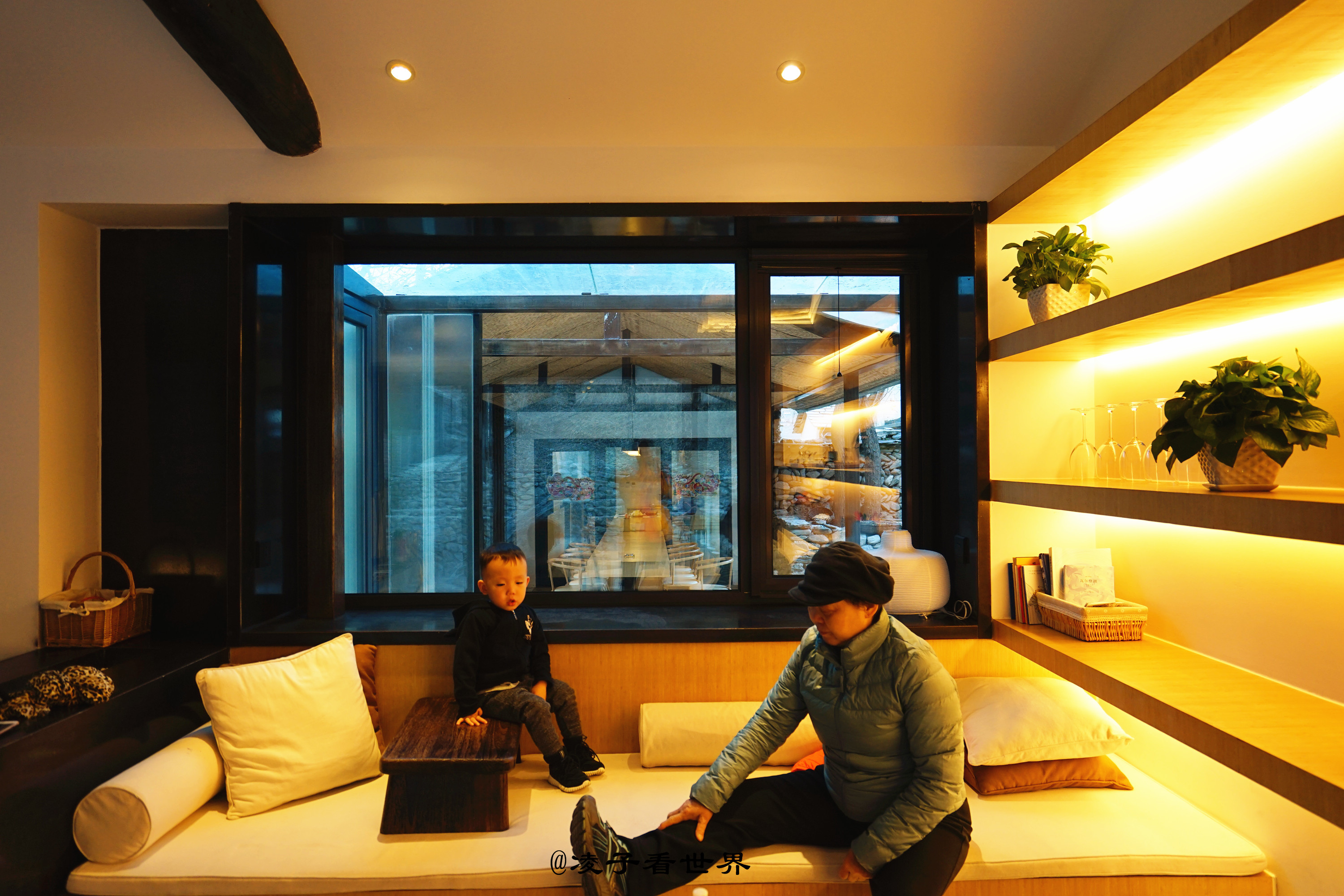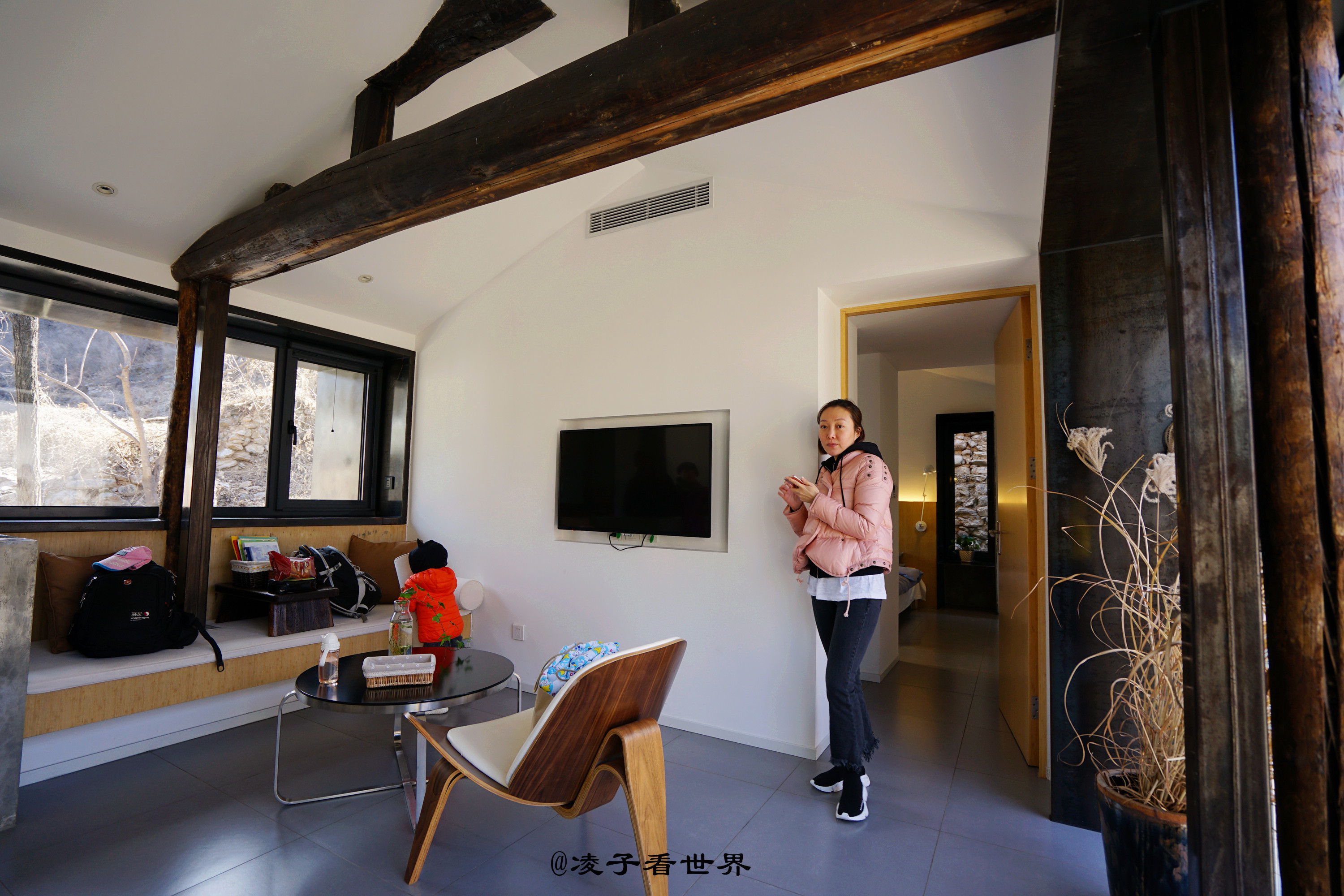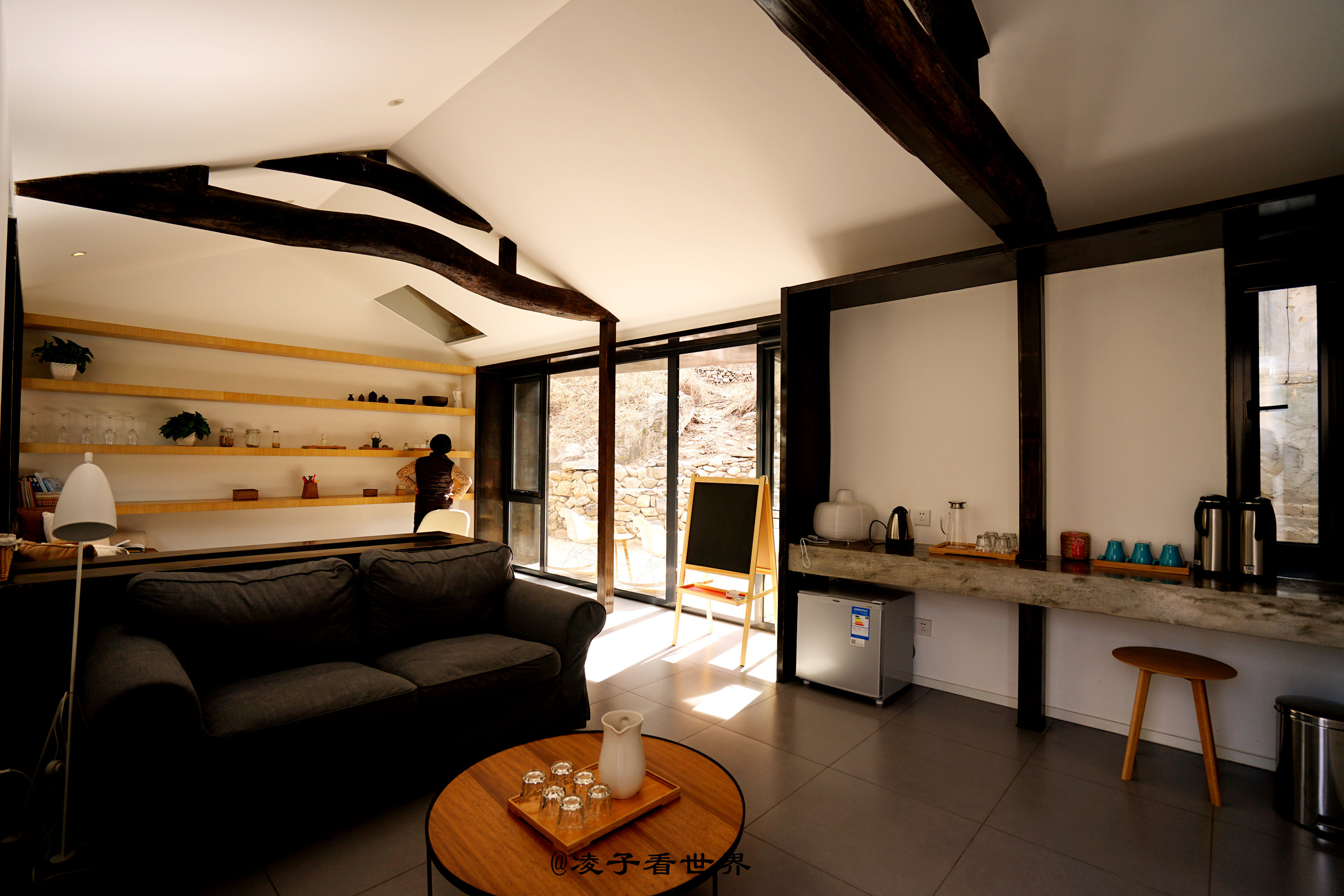 迈进后院的那一瞬间,我着实惊着了,这哪里还有老房子的模样,宽敞的大客厅,依窗而建的如榻榻米一样的茶座,背后是一扇明亮宽敞的大玻璃,放眼望去,眼前就是大山,田地。满眼都是风景。出去直接就可以爬山,无论你是在房间,还是坐在外面赏风景都是爽爽的。