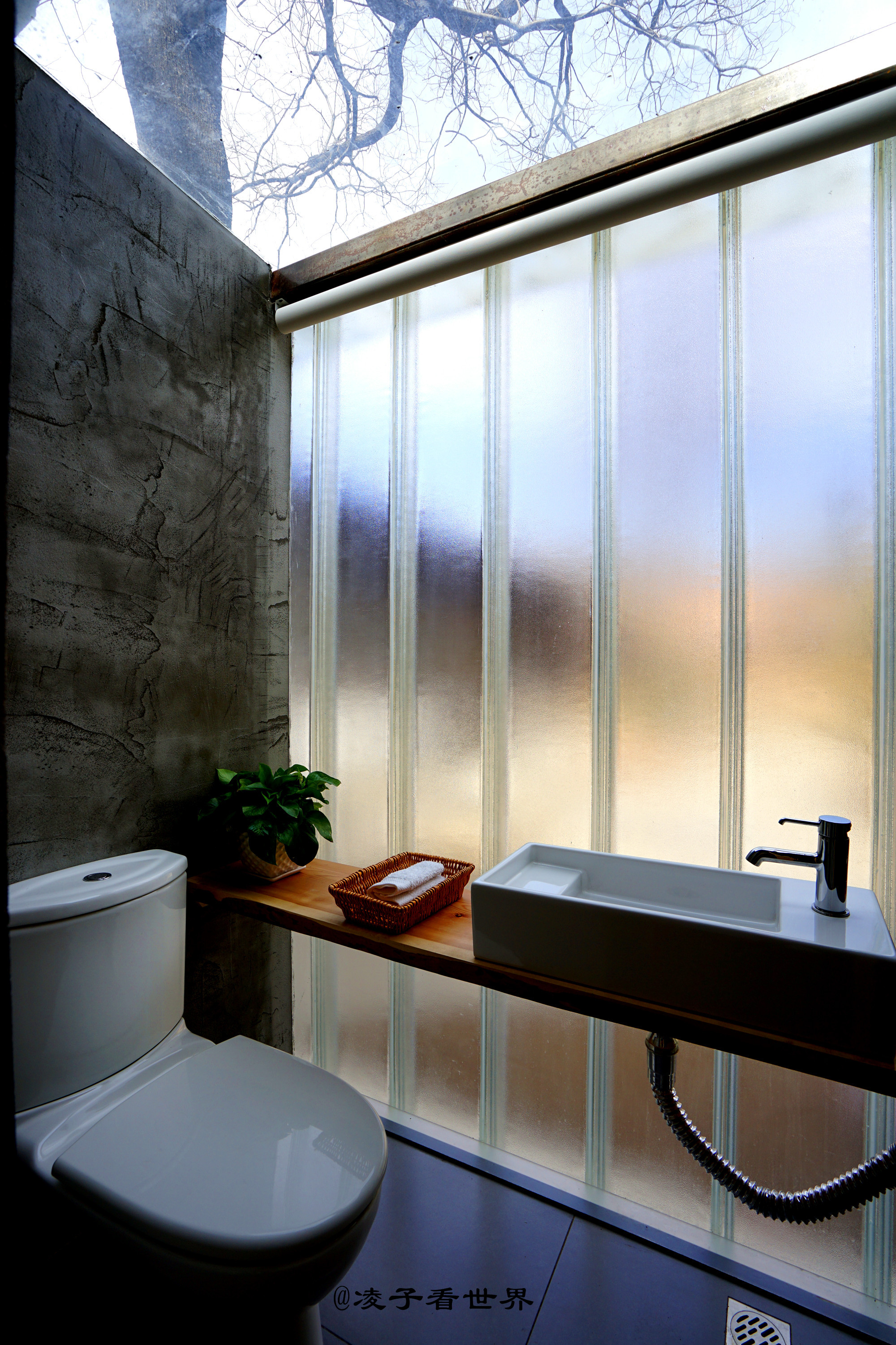 房中依然保留老房子那粗壮的木梁,复古与现代的结构,在这里体现的淋漓尽致。就连这卫生间都要保持原生态,直接水泥墙不做任何装饰,头顶透明的玻璃晚上直接可以坐在马桶上数星星。这种就是目前最流行的风格,透明的磨砂玻璃幕墙,外面是看不见的。洗护用品也是五星的水准,都是来自澳洲的,原木牙刷,木质的洗手液盒子,给人一种回归田园的温馨。