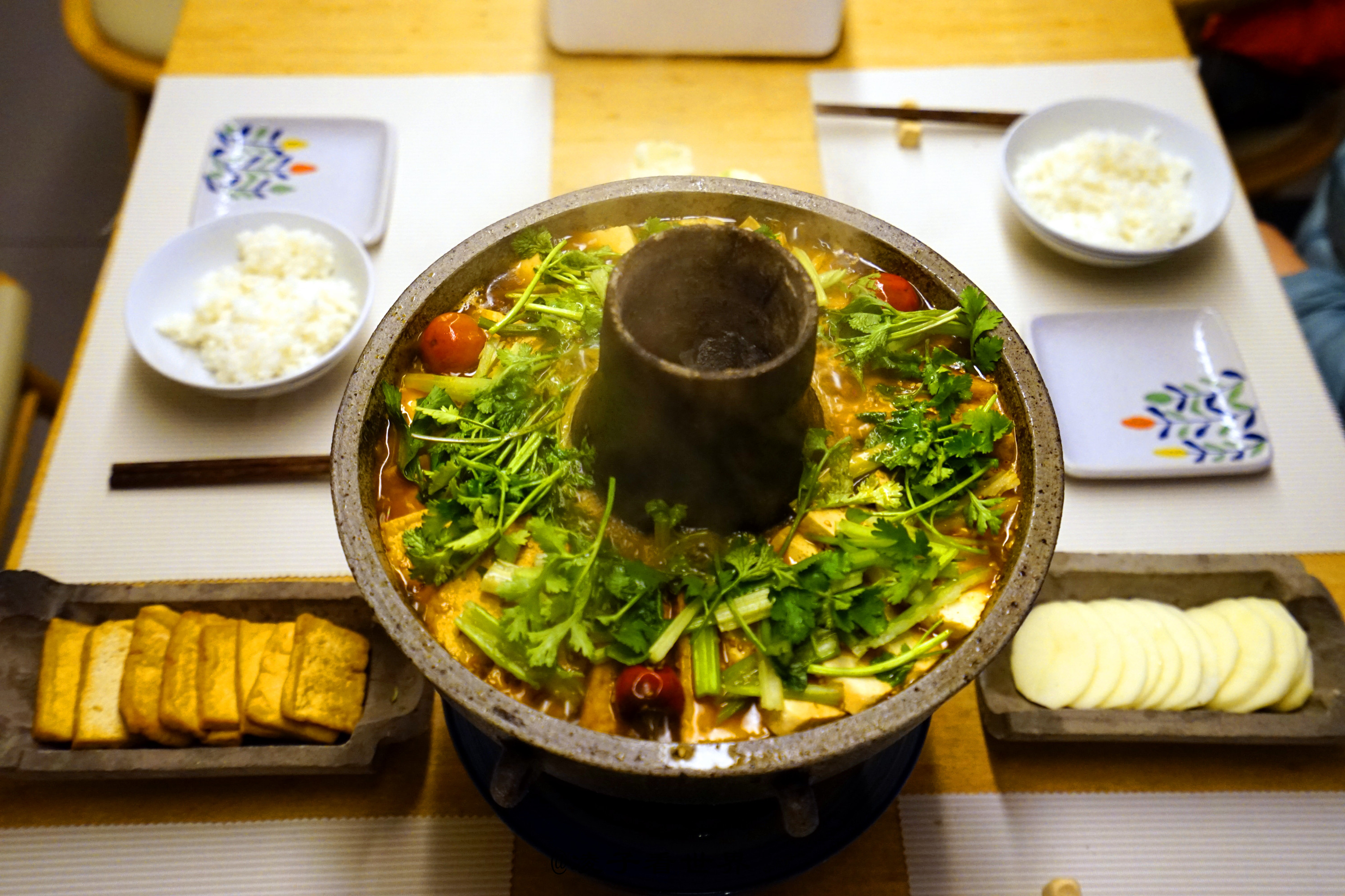晚饭我们吃的是素食砂锅火锅,满满的一锅装满了丰富的食材,都是从大山就地取材,大山里的黄豆磨成卤水老豆腐,炸豆腐,酸菜,大白菜,魔芋粉,土豆片,白萝卜,木耳等,看着都是不起眼的菜,可是不知这汤是怎么熬出来的,吃着就是香,这可是姥姥家的拿手菜,有秘方不能说,你只有来吃来品味。在这乍暖还寒的春日,暖暖的吃一锅真是暖到心窝里。