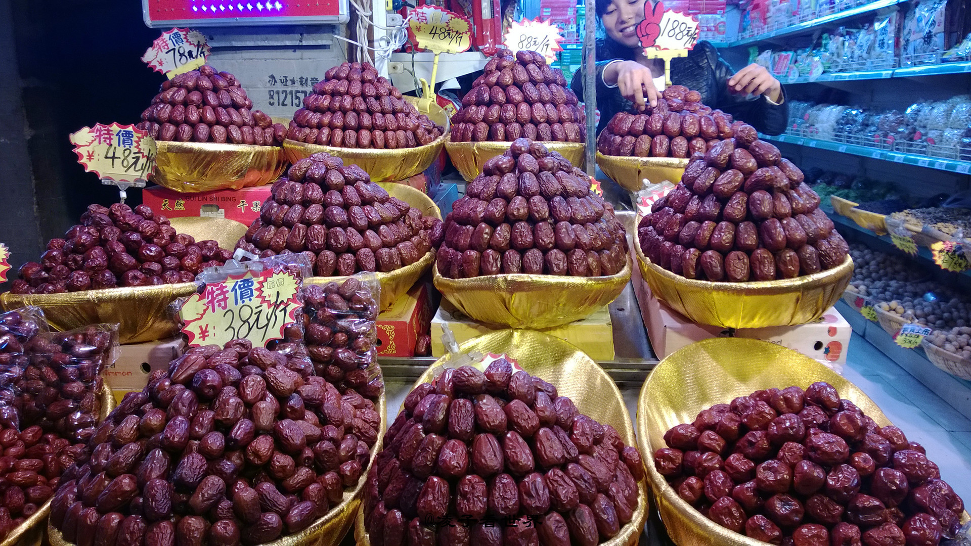 逛完了去回民街品尝西安的小吃,这里汇集了陕西比较有名的小吃。你看这狗头枣又红又大。