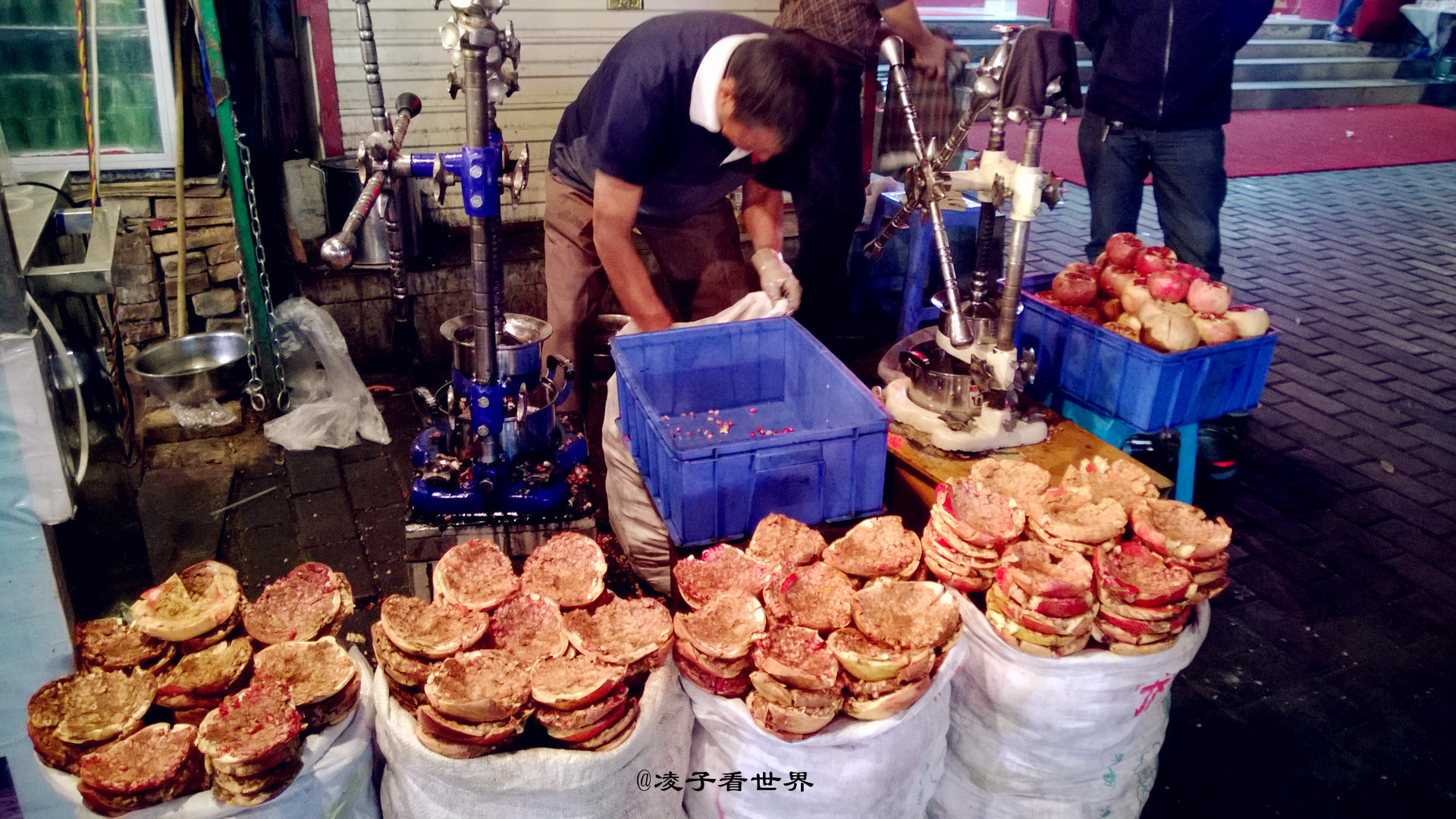 临潼大石榴可是全国有名,下图的摊主正在忙着榨石榴汁,不应该叫榨,应该叫压。嘿嘿!一个大大的石榴一下就被压成饼。