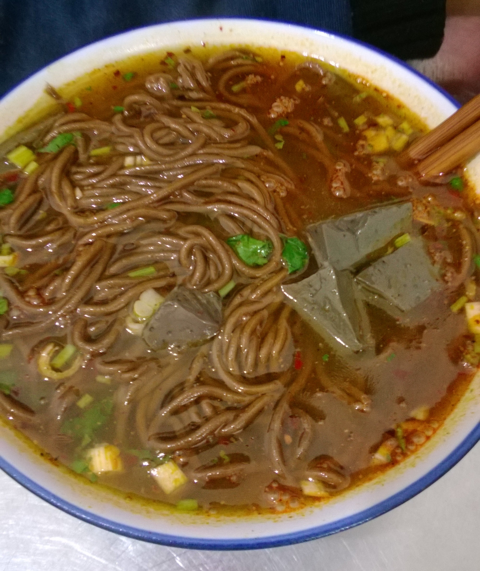 羊血冒饸饹,可是不容错过的吃食,荞麦面的饸饹,配上这浓香四溢的羊汤羊血,撒上翠绿的蒜苗,那就绝了。香辣鲜香,吃一碗还想下一碗。
