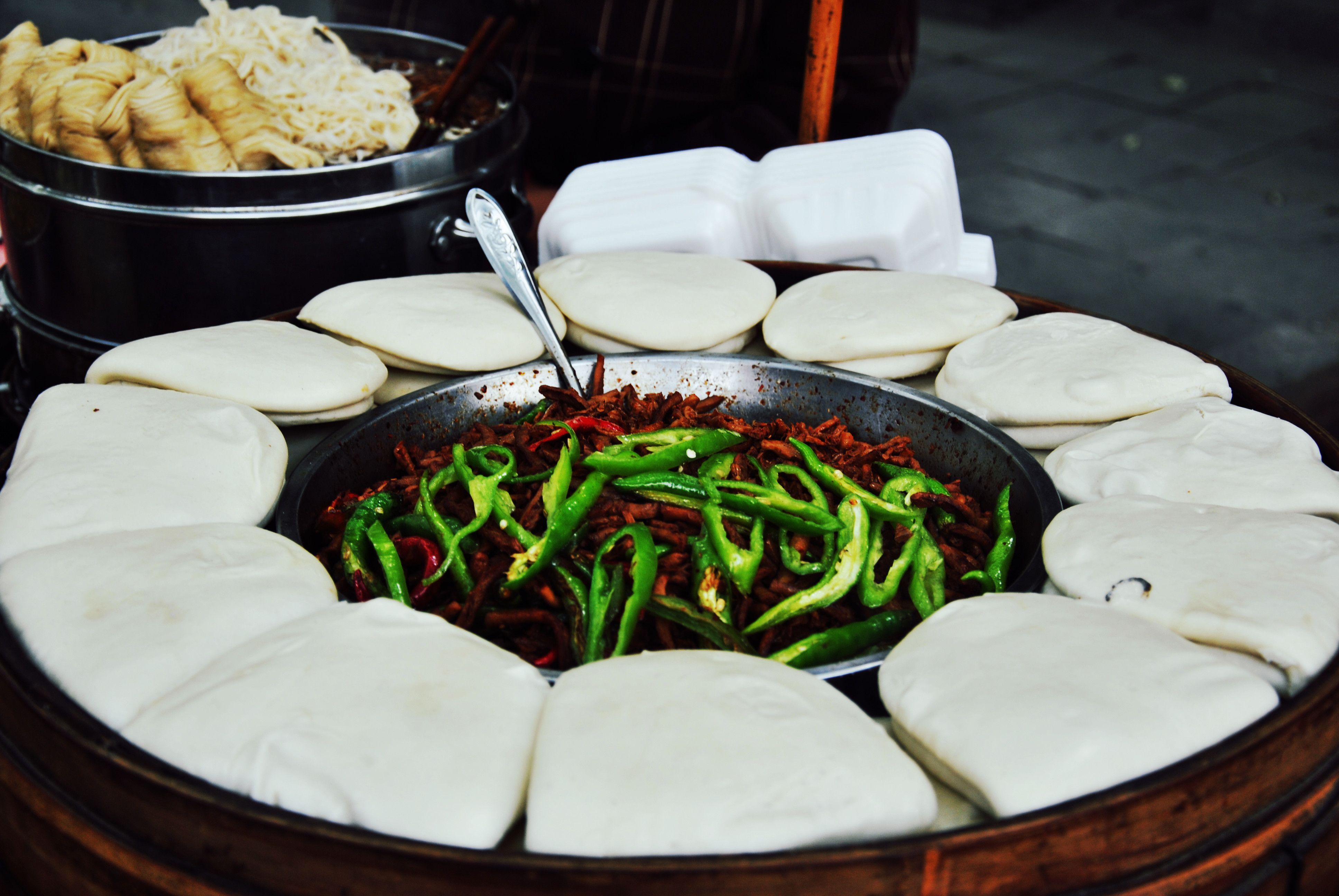 就连街头随便的一个小摊上荷叶馍加上这家常菜都是那么的好吃。下面那个叫油旋,抖开就可以吃,拌菜更好吃。