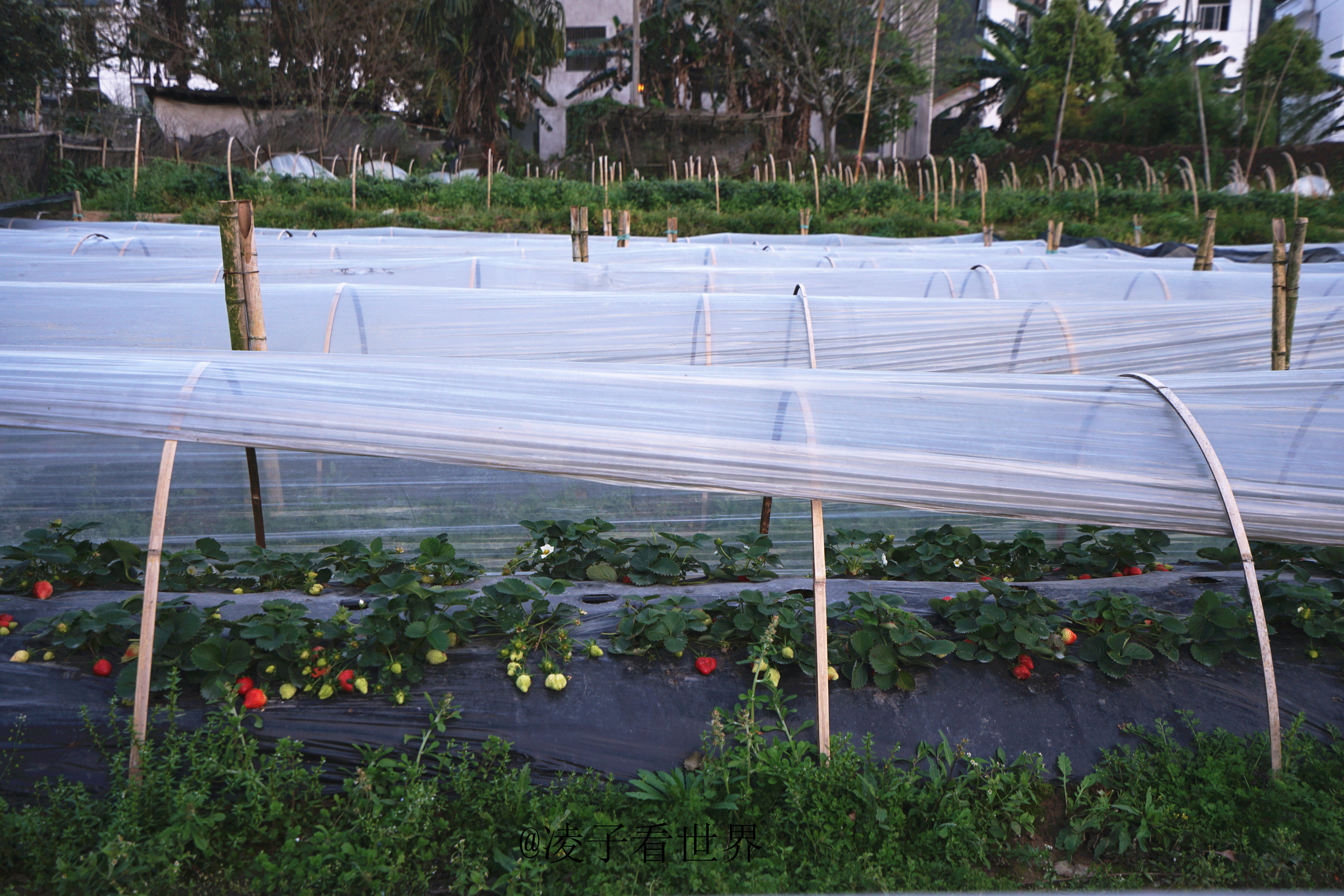 出得小院沿着乡间马路继续走,前面有一块搭着棚子的草莓园,这时的草莓正是采摘的季节,大家忍不住走进去摘了起来,一群吃货,吃起来就不想走。这里的草莓虽然个头不大,但是很甜。听说这可是纯绿色的,不施化肥,都是农庄自己种植的。草莓园外很多的芭蕉树,树上已经挂满芭蕉,不过还没有熟,芭蕉花还在呢。