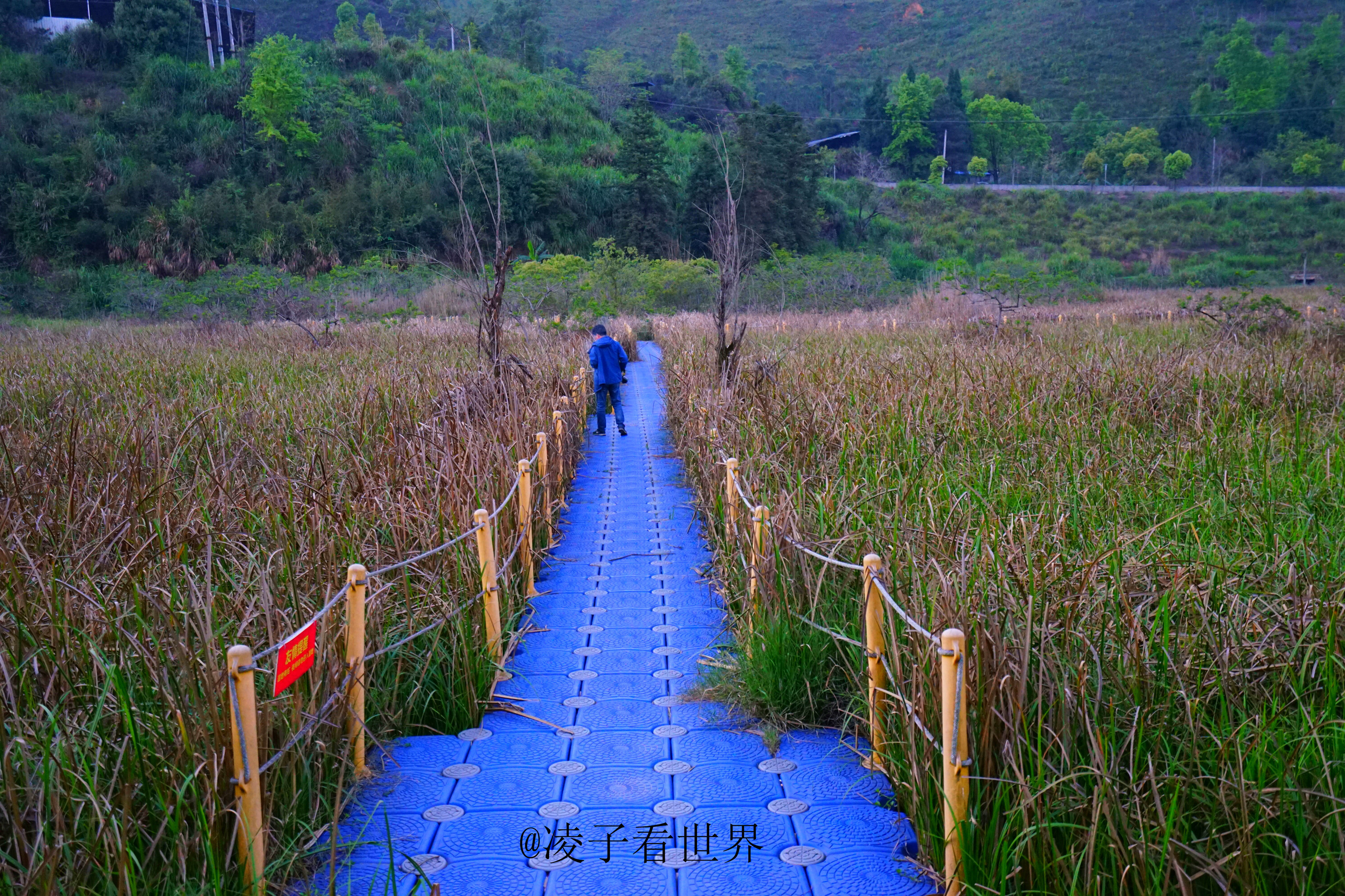 再往前山脚下有一块很大的湿地公园,这里有很多鸟儿在芦苇丛中欢叫,只闻其声不见其身。我们正在说话间有一个白鹭不知从哪里飞了过来,可能是天快黑的时候了,鸟儿都已归巢。想看只能等到早上来看看喽!鸟儿都会在一大清早出来溜达,早起肯定能看见好多。