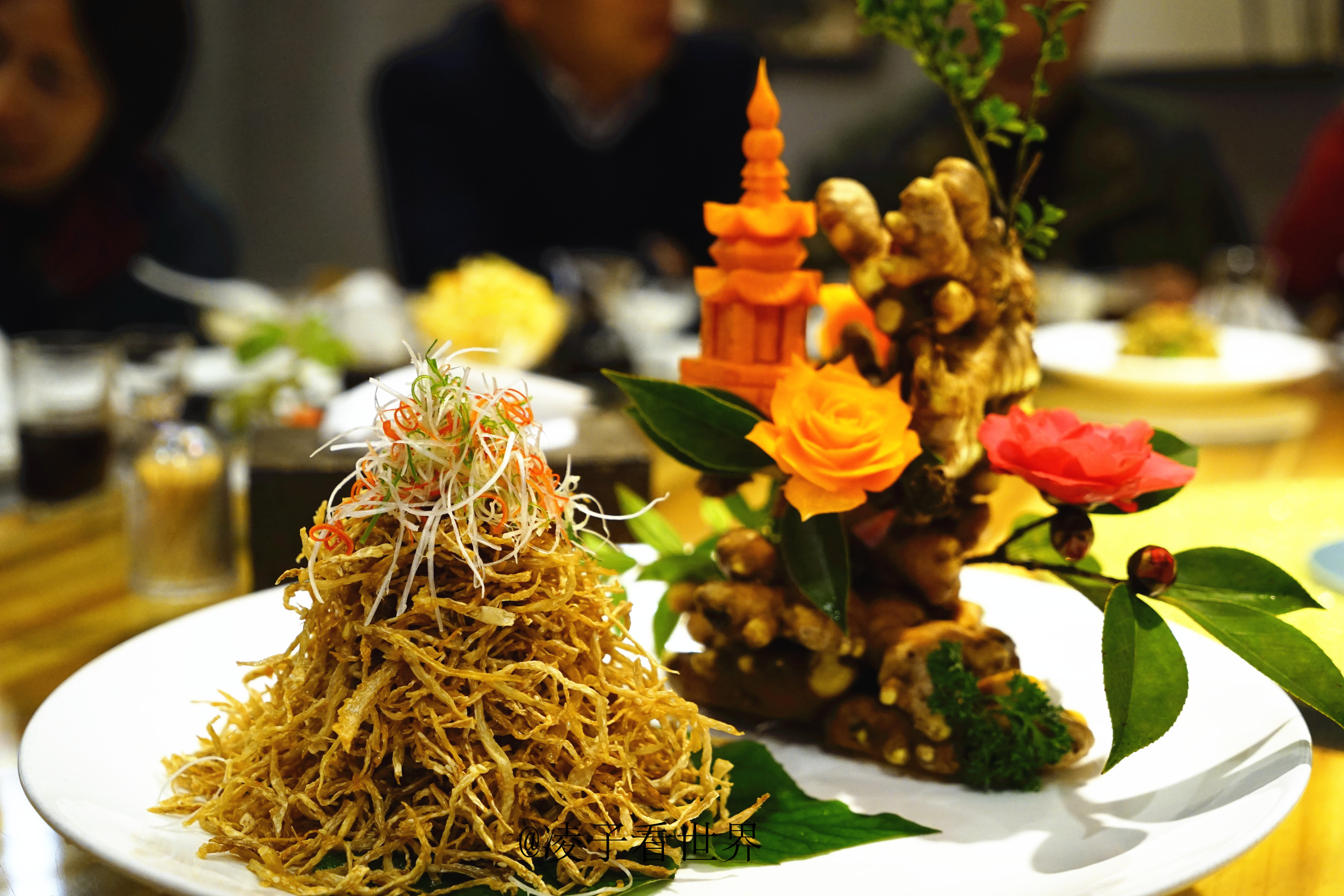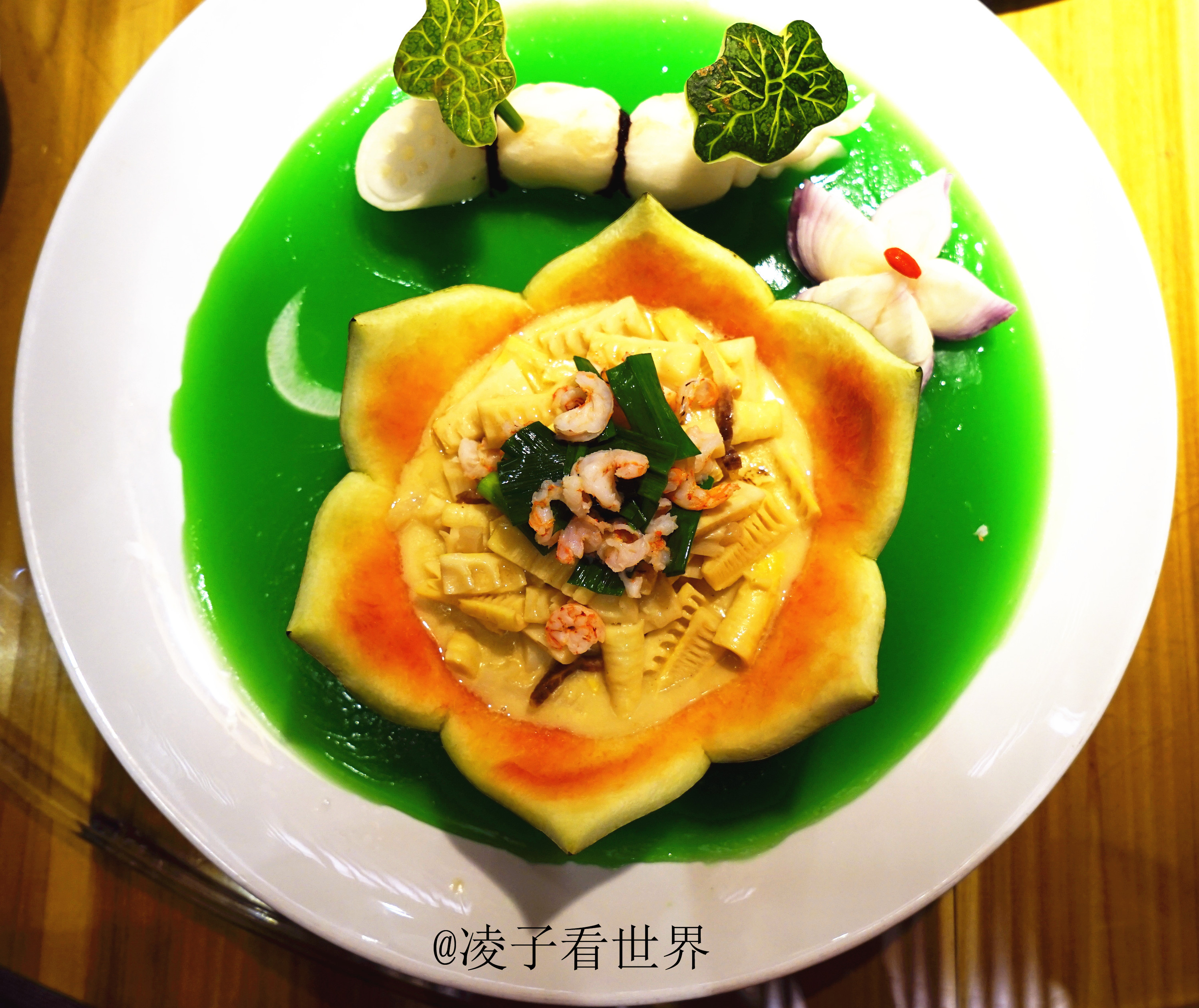 这第一道菜上来后就把大家惊呆了,光看这造型就知道这笋竹宴讲究,这么美的造型可舍不得下筷子,先拍吧。园林御景观寓意好,一看就知道我们身在田野,住在园林中。这是把石笋切丝炸制而成的一道菜,吃起来脆香有嚼劲。