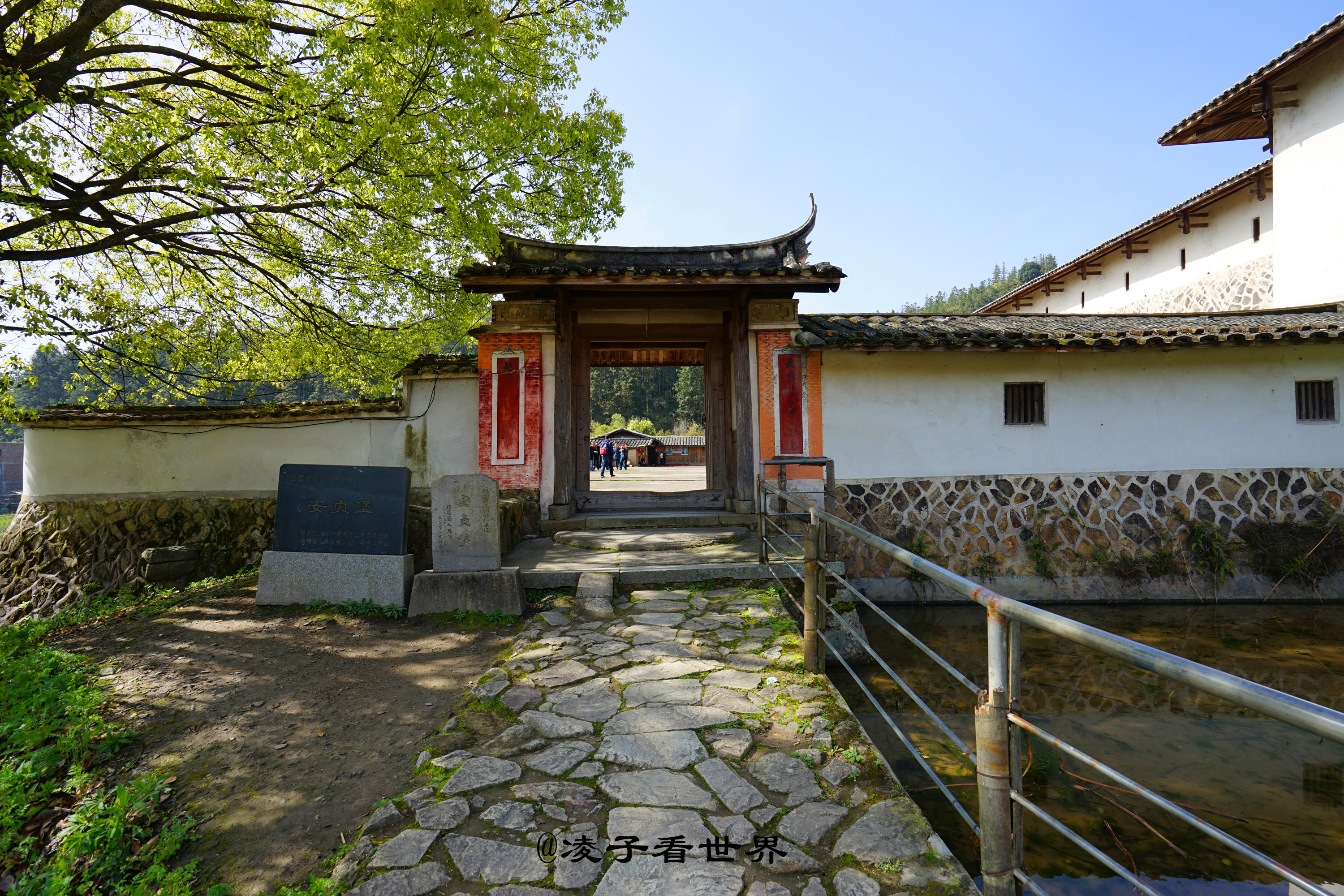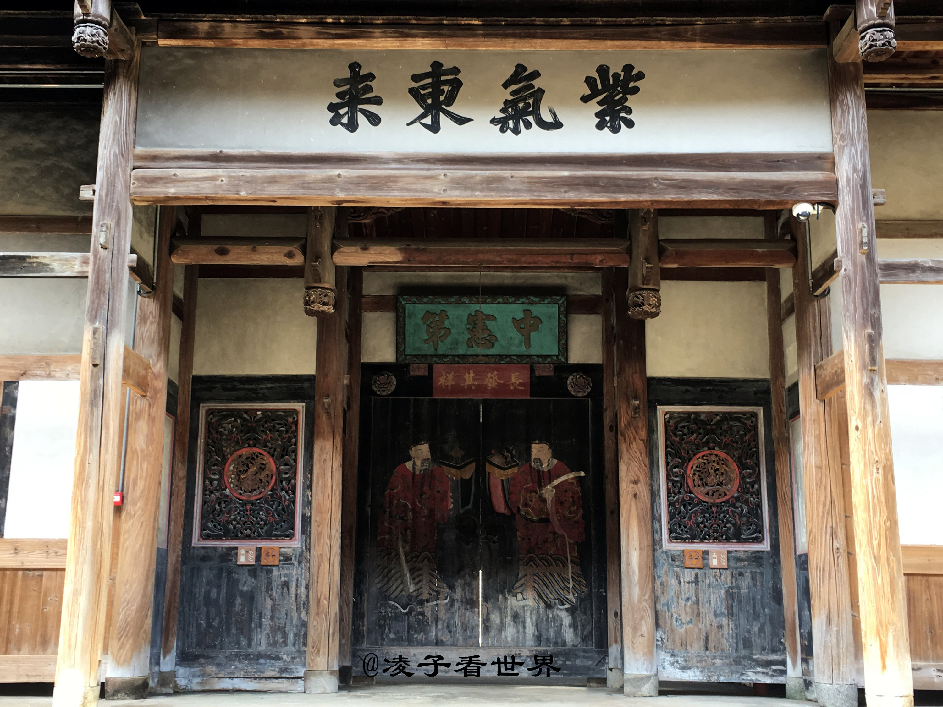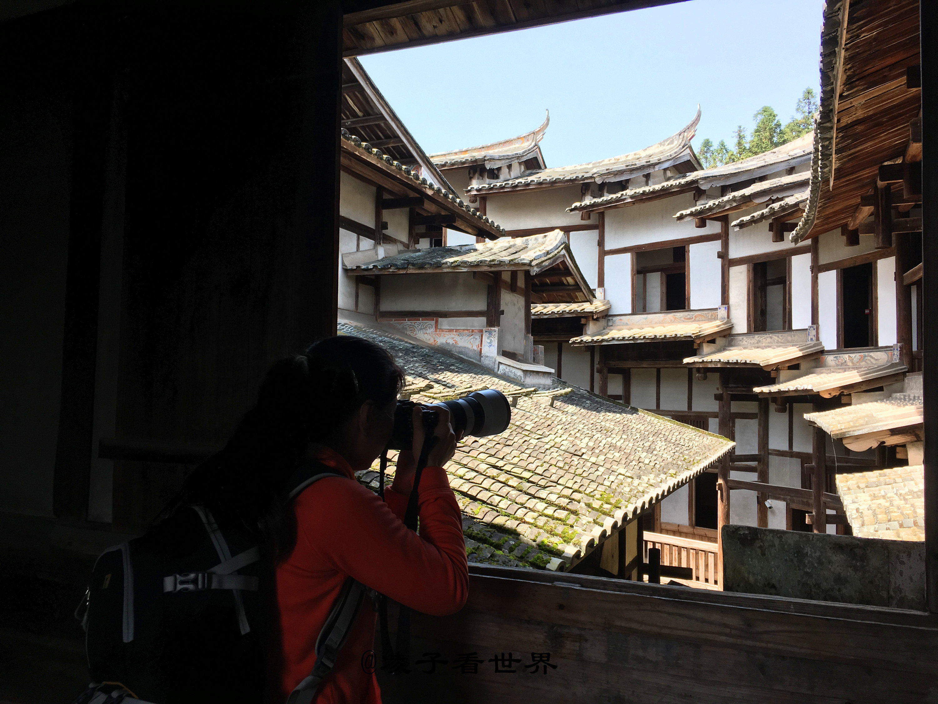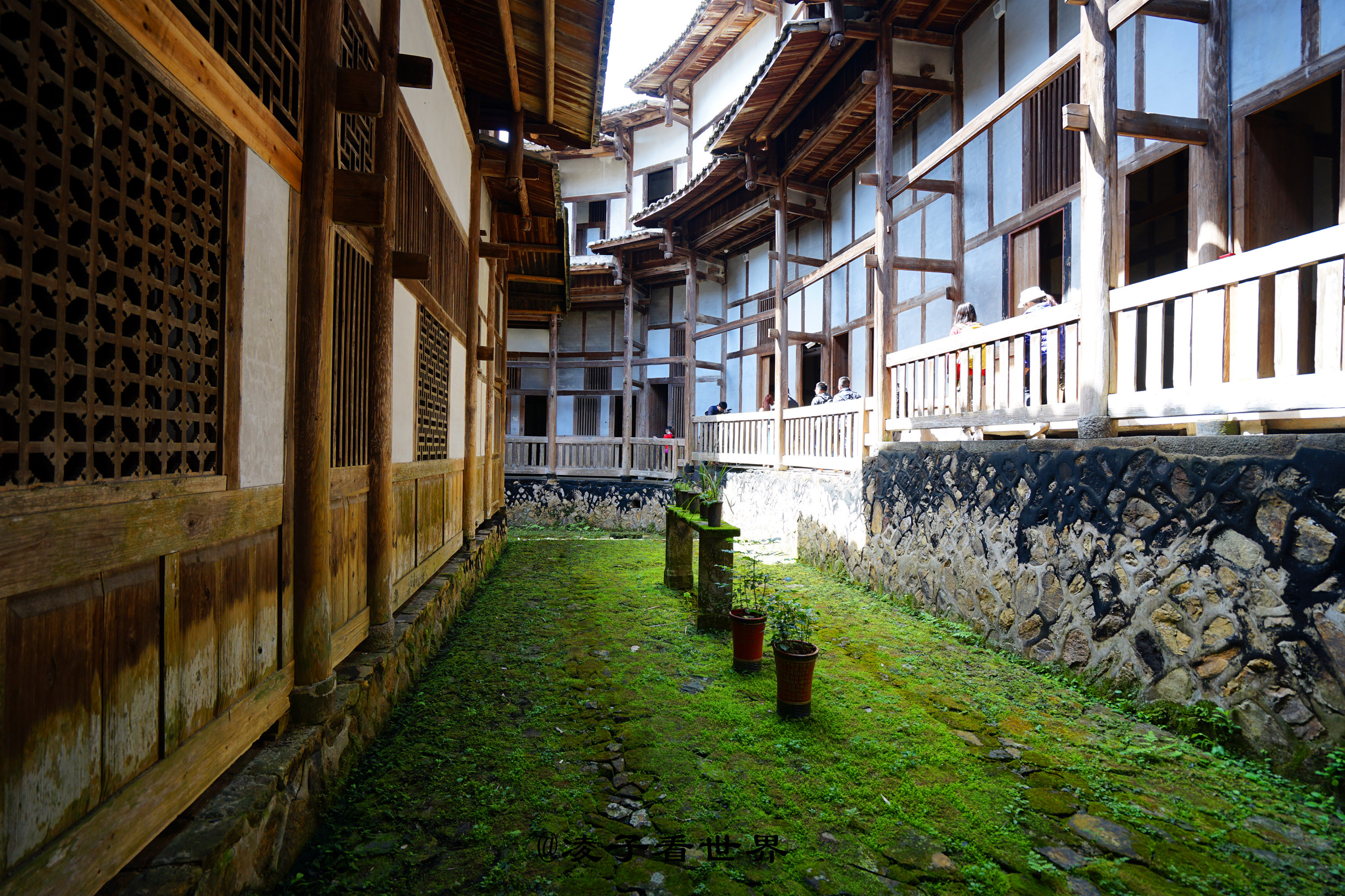 继续拾阶而上,门楣上的紫气东来寓意安贞堡家族吉祥,财运亨通。高大的木质建筑廊柱,在一层庭院围城一圈,看这阵势就知道这个古堡有多麽的坚实与厚重。以套进有序的四合院组合,布局错落有致,安排精巧有序,以厅堂为中心的三百六十八间,构成了这座福建省保存最完好的古代大型民居。