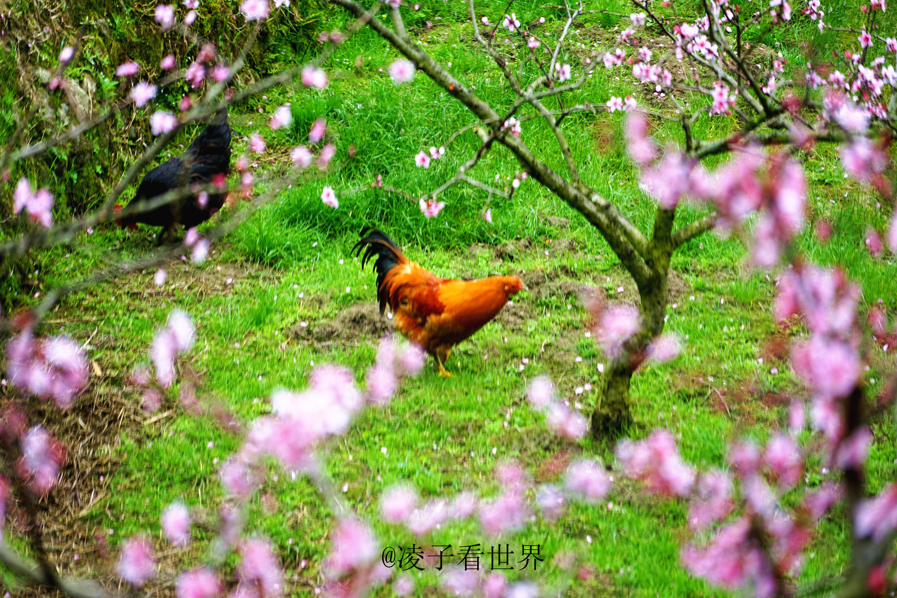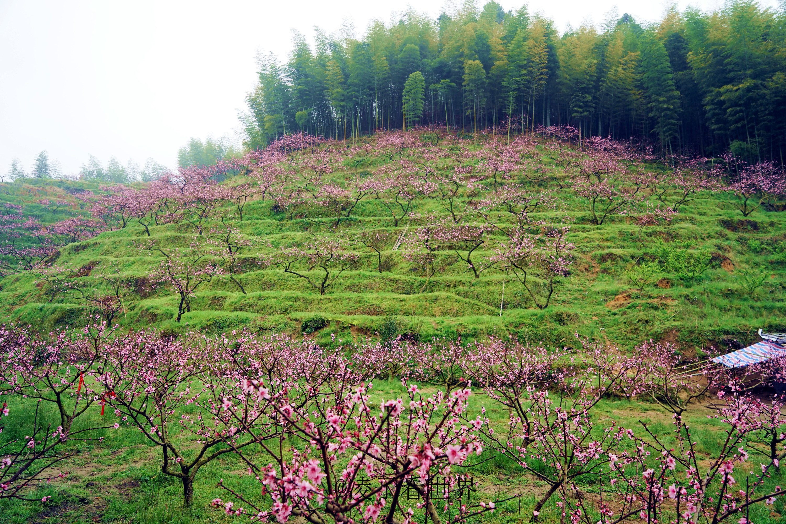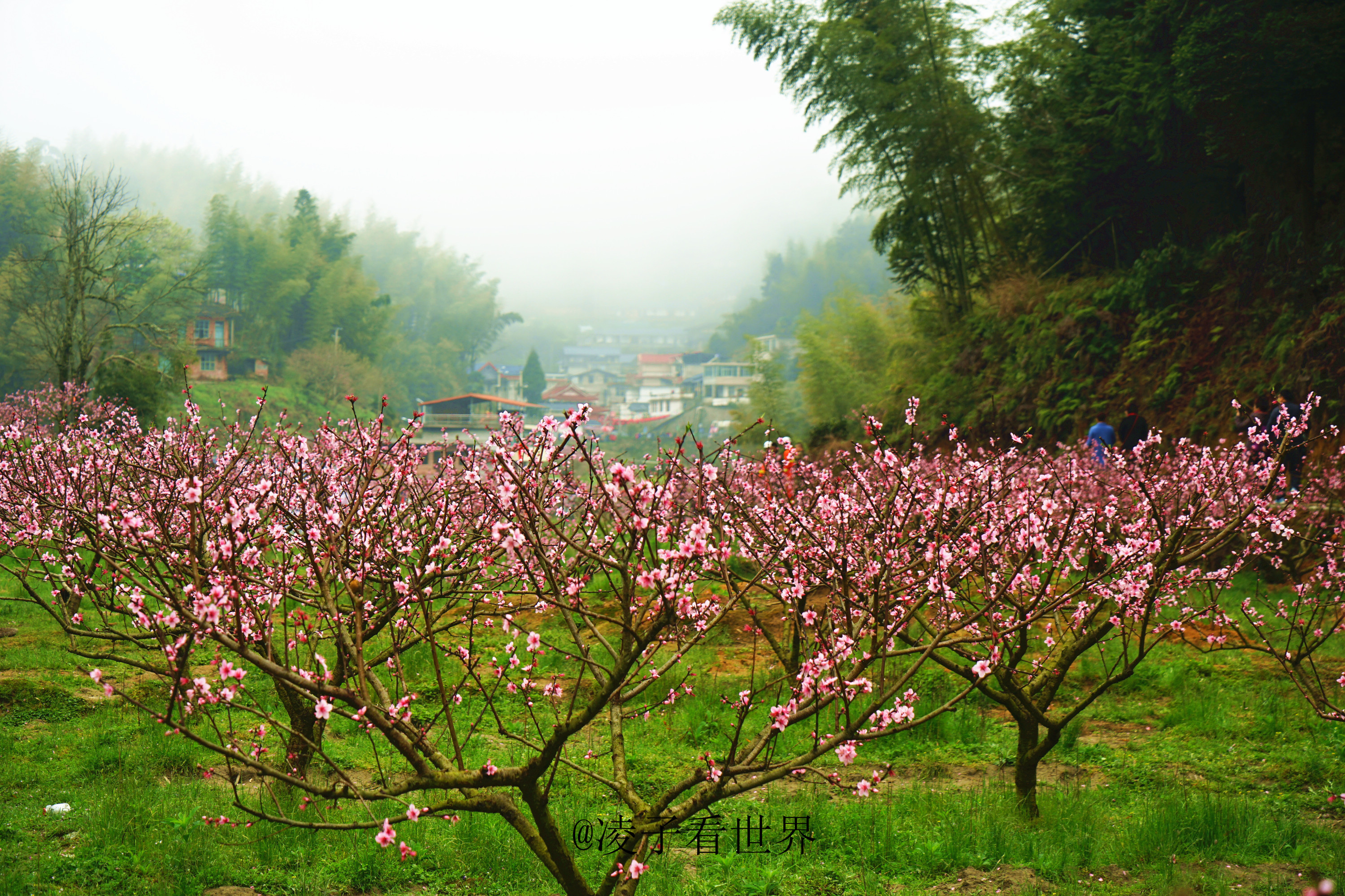 山上桃花层层开,云间烟火有人家。这层层的梯田,一棵棵红艳艳的桃树穿插其中,山后面的翠竹林与这桃花形成鲜明的对比。这就是南方的桃林与北方最大的区别,而且这里的桃花也是很大,桃花中间很红边缘粉红,而北方的则是粉里透着白。
