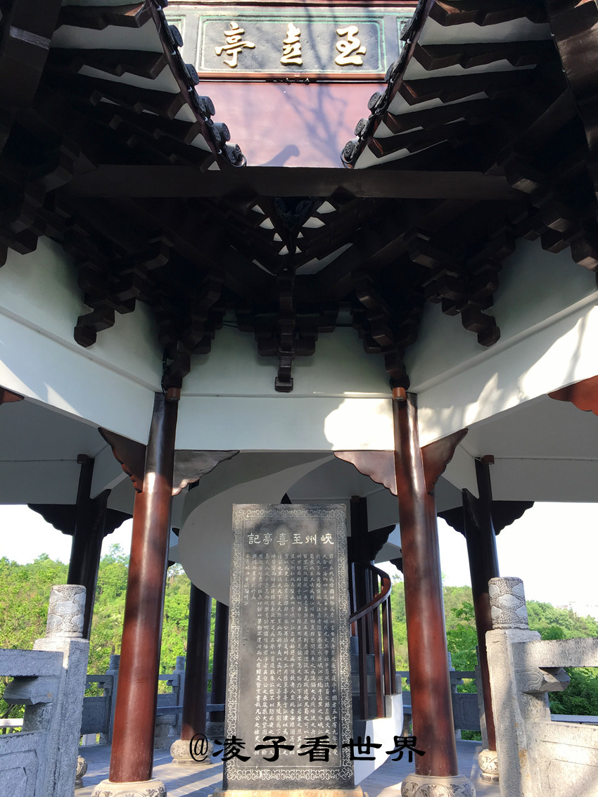 走过栈道绕至山上,这里有一个至喜亭,始建于宋朝,当时文学家欧阳修被贬任宜昌县令,峡州太守朱庆基建此亭后,特委托欧阳修专为此亭作记文,即《峡州至喜亭记》,使此亭成为峡州三大胜境之一。由于战乱和其他人为因素以前的至喜亭已被毁坏。如今新建的至喜亭重檐三叠,玻璃瓦,青石雕花栏杆,通高18米,亭分三层,楼中设螺旋式楼梯,亭内竖有欧阳修《峡州至喜亭记》及古今诗画数十幅。站在亭子最顶层可以一览葛洲坝全景。http://si1.go2yd.com/get-image/0DeOhWd7MqO