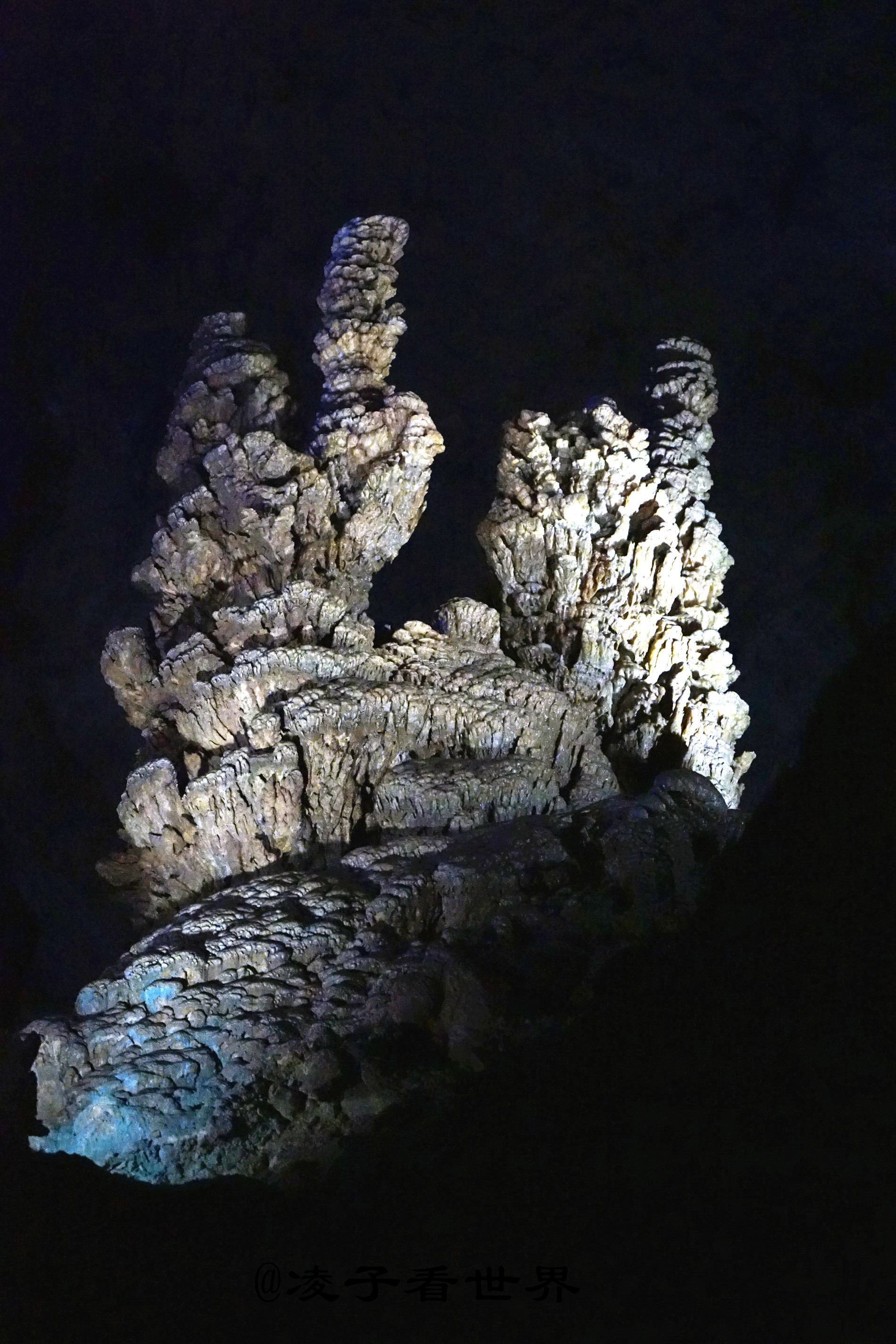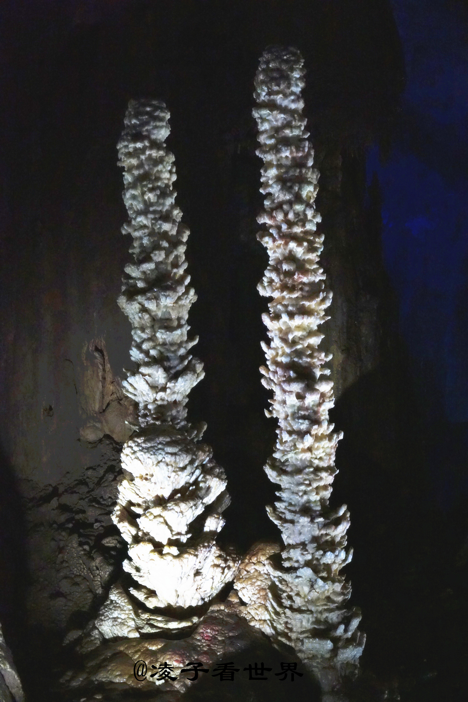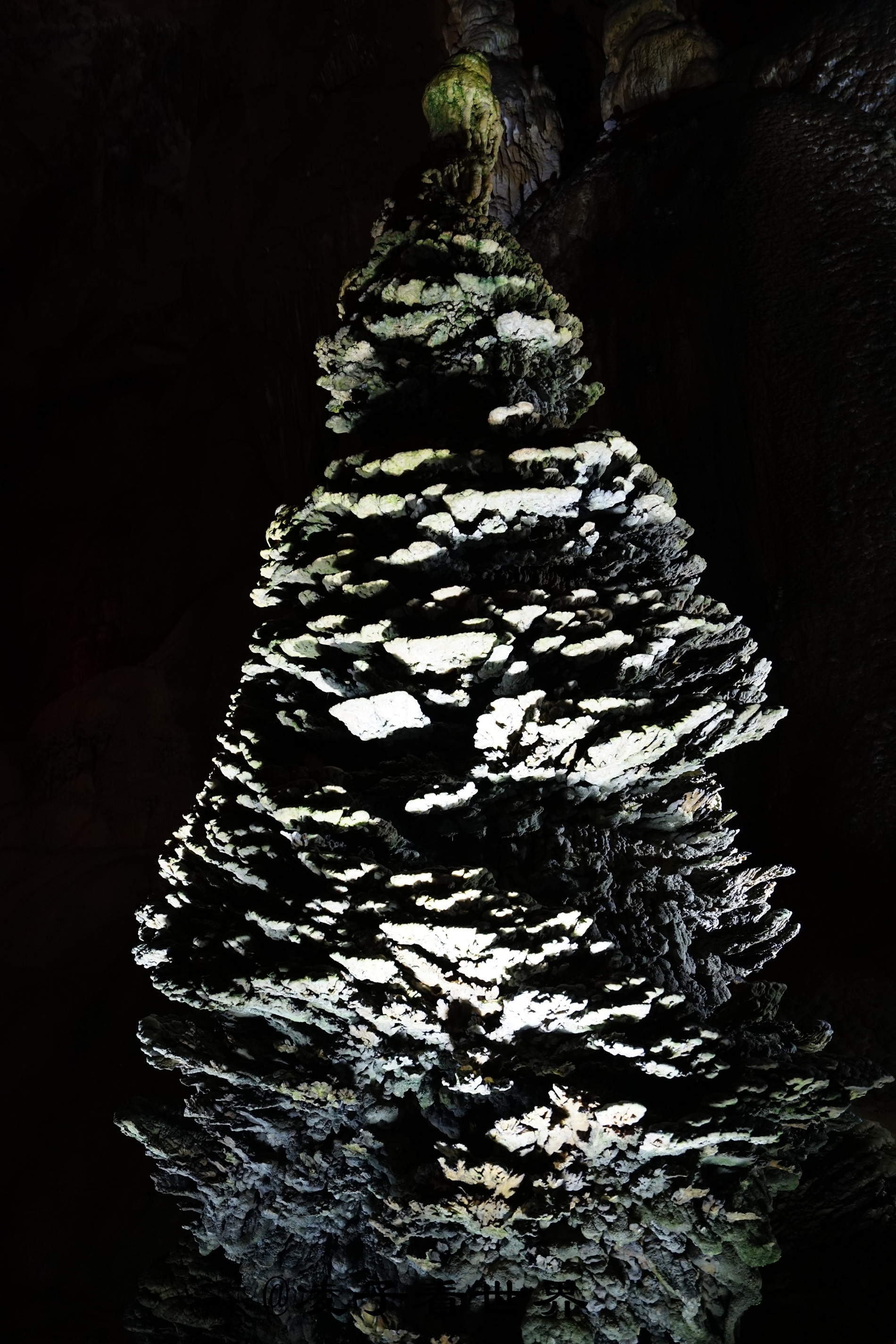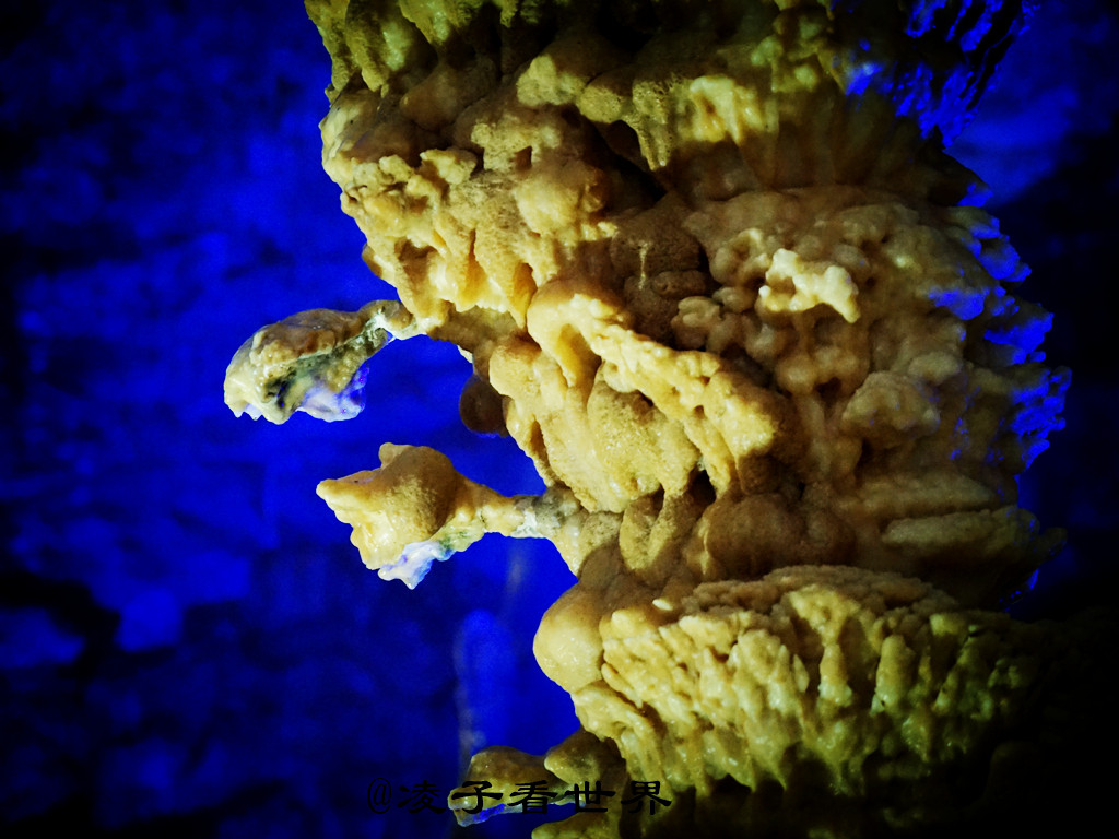 经过迎宾厅,火炬状的石笋——大力神杯,矗立在通往溶洞里面的台阶旁。继续往里走就来到了逼真形象的塔林宫,这一座座的形似宝塔的石笋,好像是专门修建的一样,屹立在山洞中。洞中的路忽而上行,忽而下行,让你无法辨别自己是在山间还是沟底。绕过一座座塔林,突然眼前一亮,稍远的塔林间一把倒挂的琵琶在灯光的照耀下是那么的醒目。它似乎在弹奏冬的序曲,白雪皑皑的青松在这序曲中熠熠生辉。这位老者在塔林的尽头好像要为每一位经过的人布道解惑。