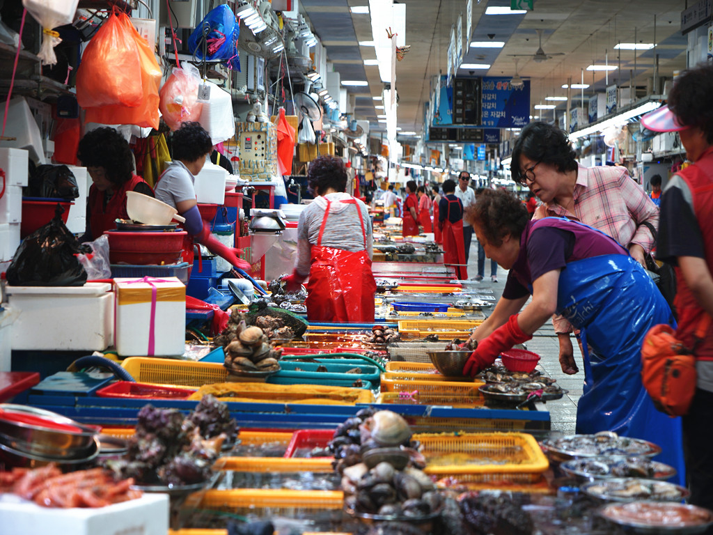 我们在韩剧里看到的好多场景都是在这里拍摄的。据说很久以前这里只交易活鱼,而且最多的就是一种叫札嘎其鱼,久而久之“札嘎其市场”就由此而来。