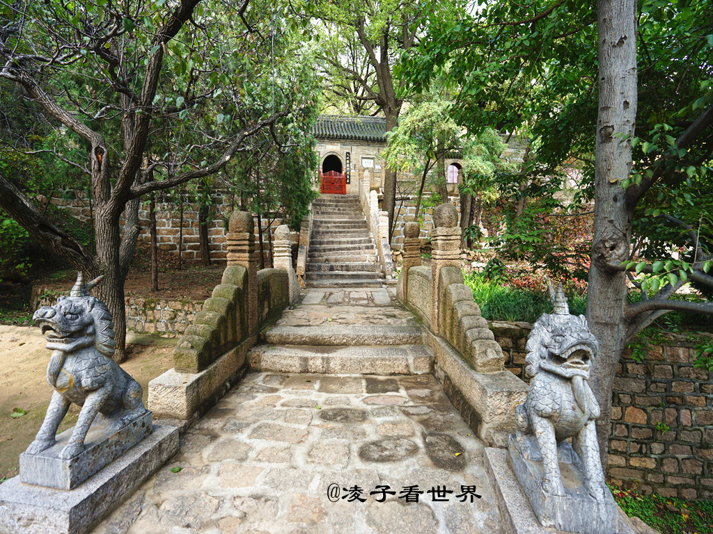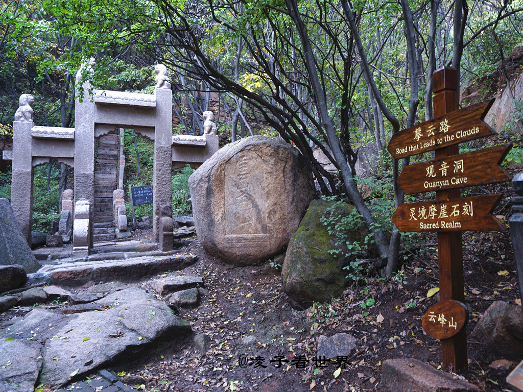 绕过超胜庵到后山可以去爬山,登山口有一座古老的桥,还有这一百多个台阶都是有历史的地方。桥边的这块大石头上刻有云峰山三个字,据说是最早的石刻。在山上有一座巧夺天工的观音洞值得一看。