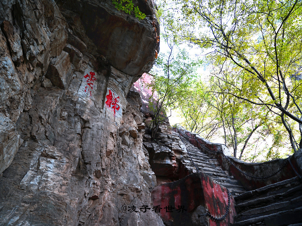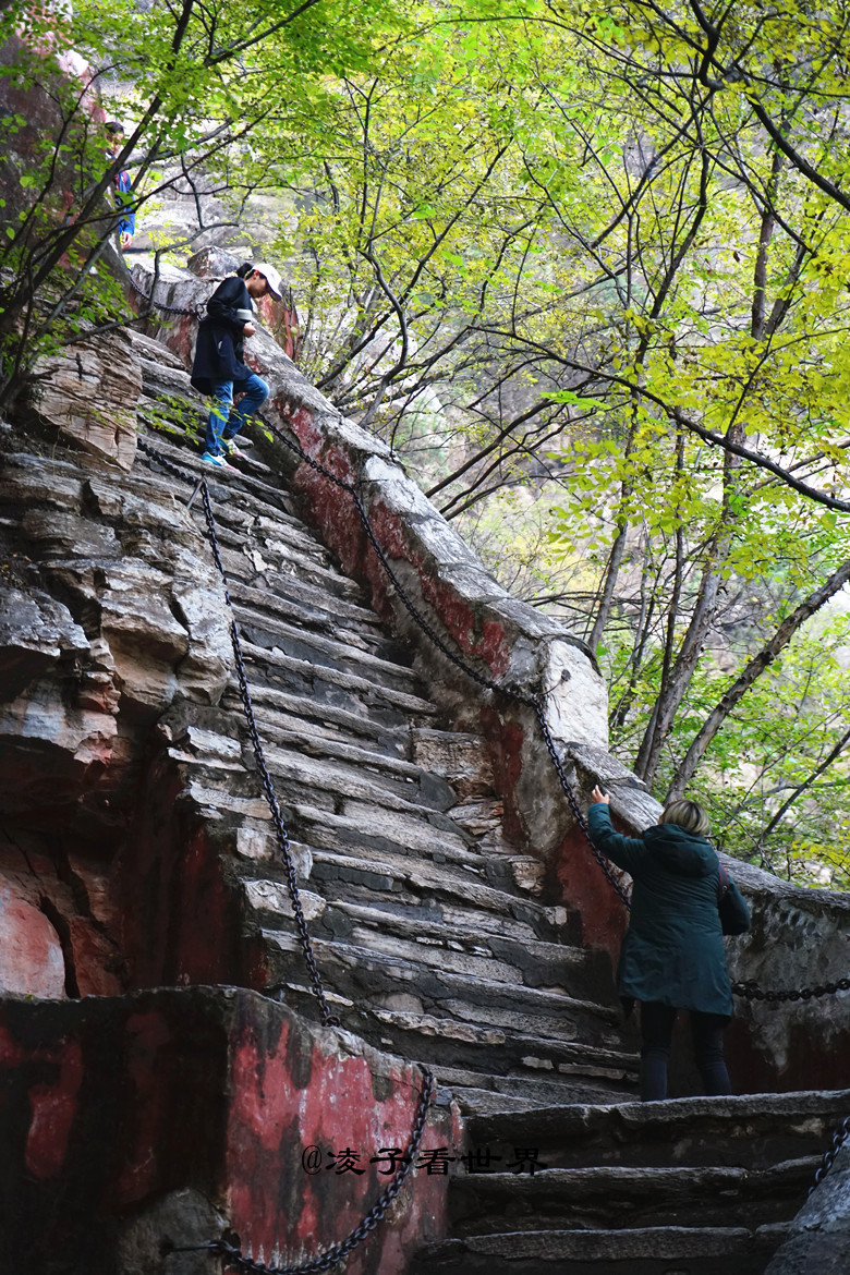 我们主要走了这几个地方,从东门进来,往里走经过一座残缺断裂的古桥,拾阶而上开始登云梯。云梯依山而建,几乎是成九十度的直梯,要想爬上去必须手脚并用方可行走,真乃“爬”云梯。修葺于明代的古云梯有 262 级,开凿于岩壁之上,拾阶而上,仿佛进入云霄,极为险峻。云梯是古时登上方山必经之路,是明代司礼太监冯保所建,是北京最古老的石阶梯。