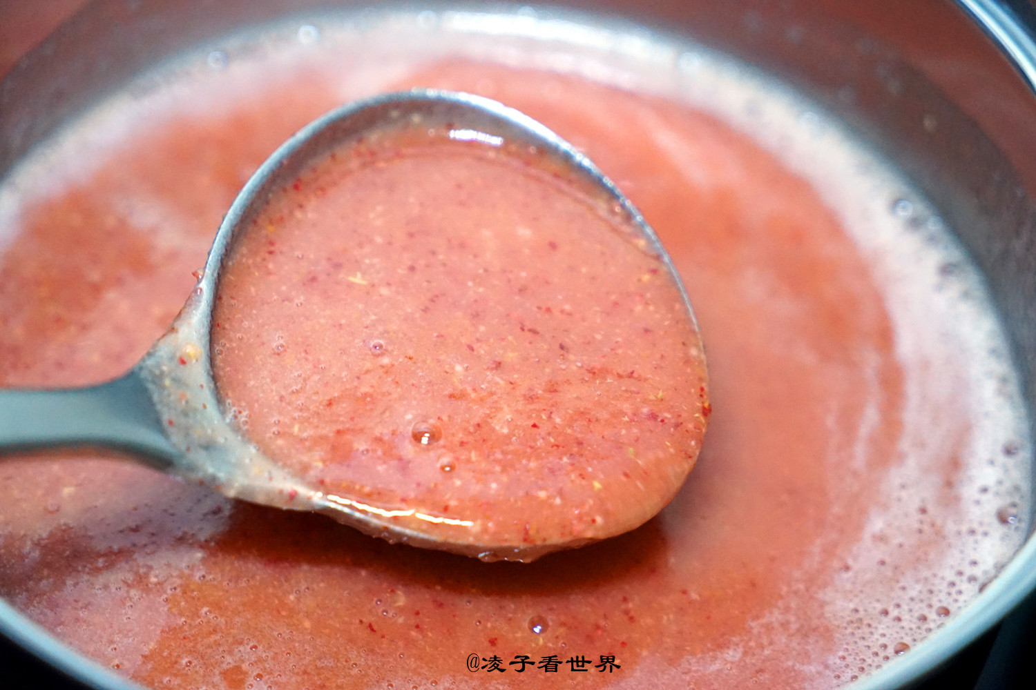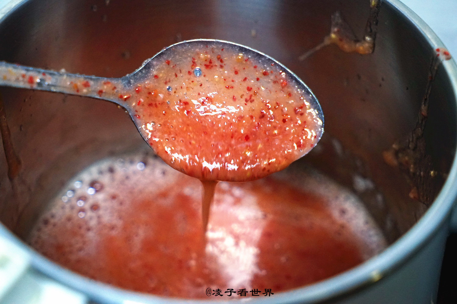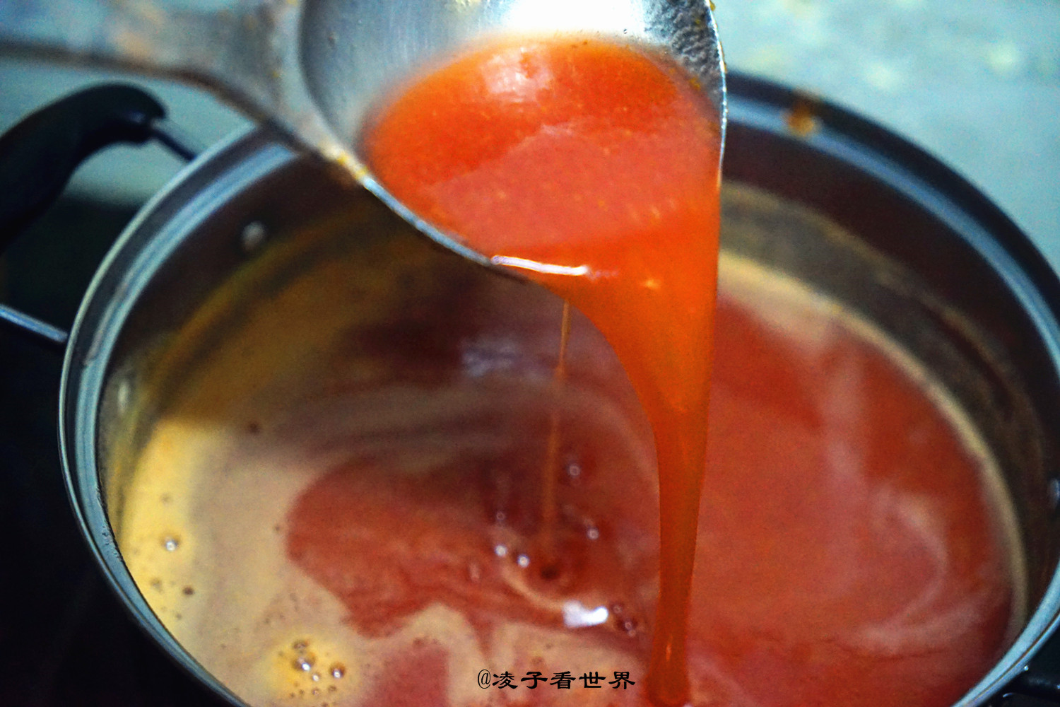 第三步,把榨好的汁液倒进煮锅,这时候一斤的山楂榨出的汁确实很稠,太稠也不好喝,一定要再加水进去,水加多少可以看汁的粘稠度而定,用勺子摇起来倒下去就像我们熬好的粥一样就行,强调一下,应该是就像我们勾芡的浓稠度就是刚刚好。就像超市里卖的山楂汁那么个浓稠度。还没有熬煮的汁看起来会比煮开之后稠一些,所以第一次加水不要太多,煮开之后还要放冰糖,因为冰糖化开也会稀释一些。煮开之后的山楂汁就不像刚榨成的生汁那么粗,而且是很细滑,所以一点不用担心粗糙的问题。下面图1颜色红的是已经煮开的,图2不红的是生山楂汁。http://si1.go2yd.com/get-image/0I6sh8FnOpU