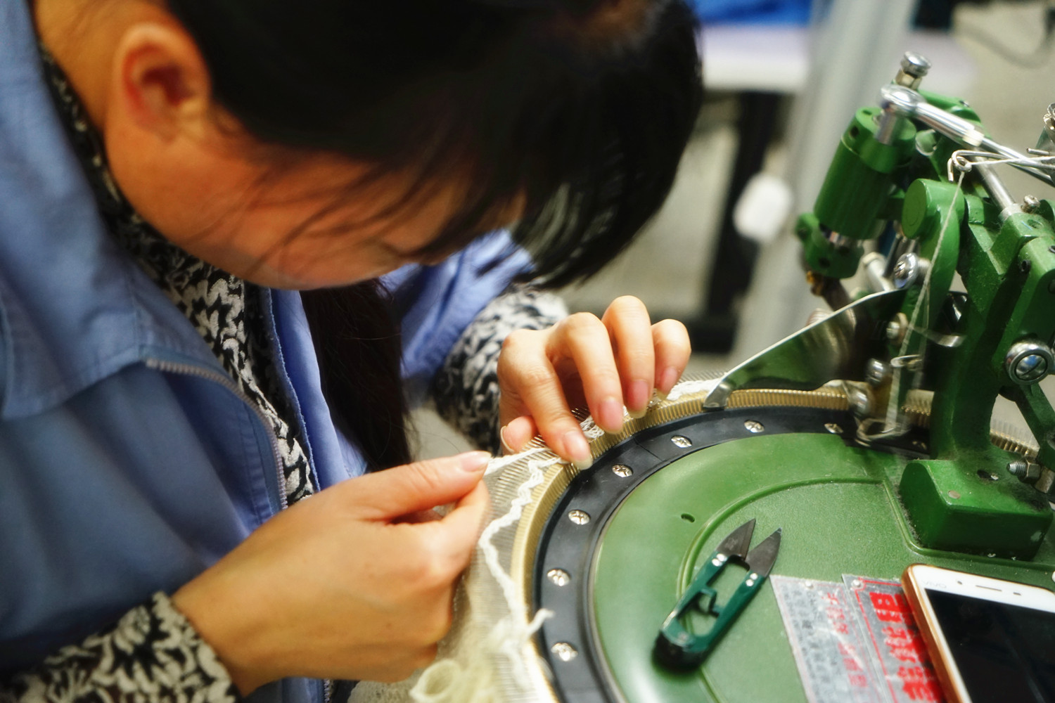 标签一般都可以机器缝制,为什么这里的羊绒衫要工人们用钩针一针一针勾上去呢?技术人员说,由于羊绒很娇贵,机器缝制容易出问题,缝得太紧对绒线会进一步的产生磨损。所以必须每一件羊绒衫都要工人手工缝制标签。http://si1.go2yd.com/get-image/0IqMZN0FMbA