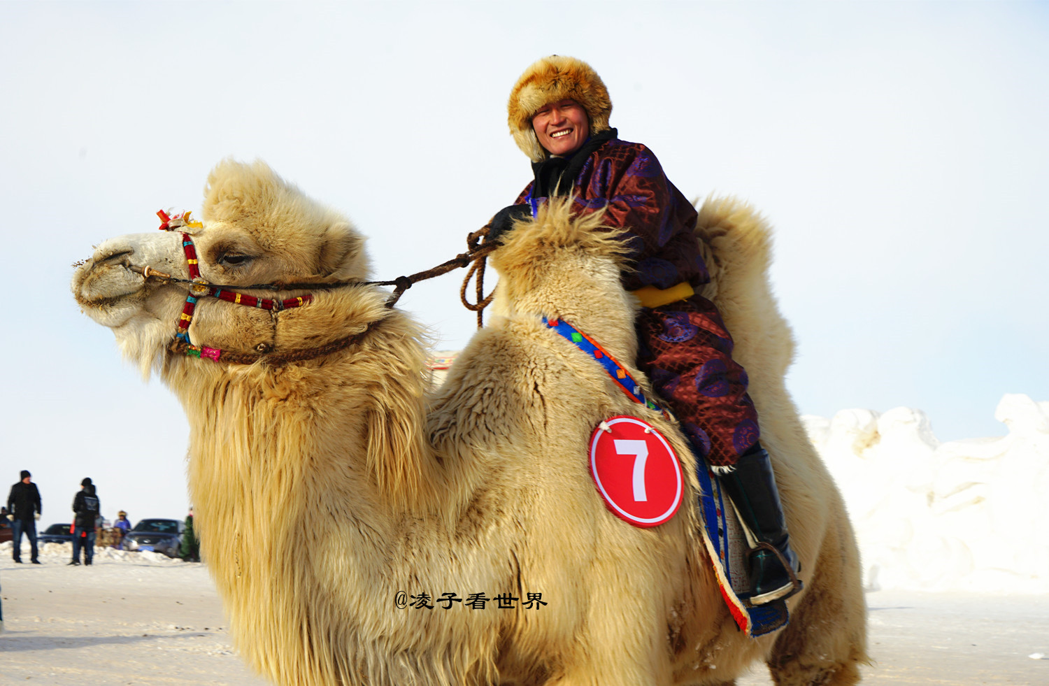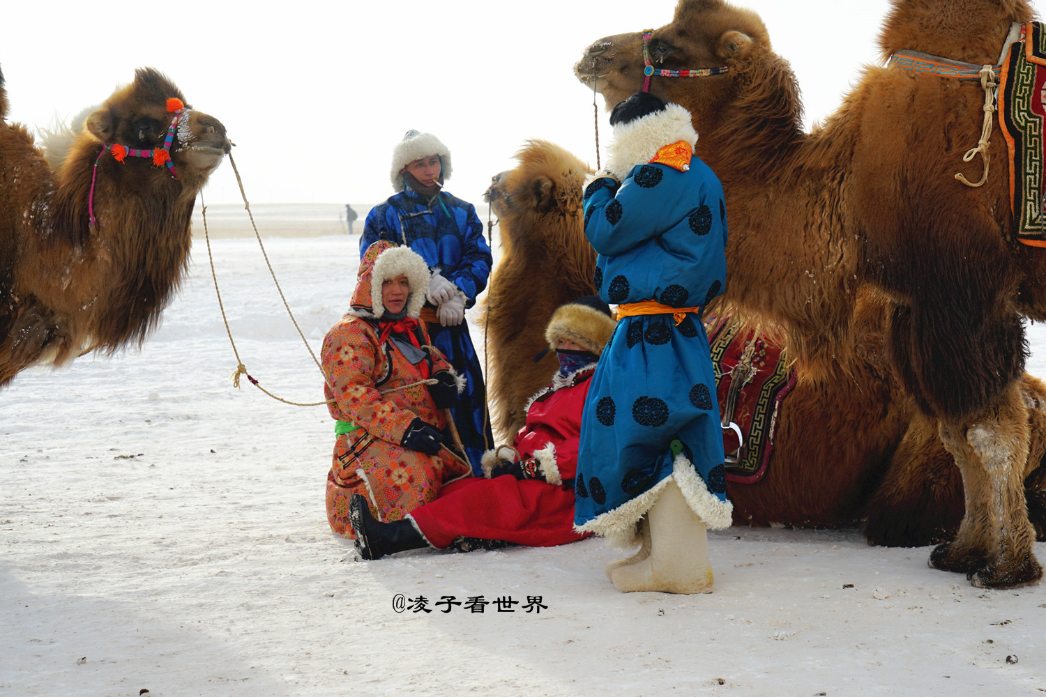 此次文化节不仅参赛人员多,而且全国各地前来观看的人也很多,人们身着内蒙古族盛装,领着孩子,家人。我最喜欢这五颜六色的蒙古族棉袍,在白茫茫的大草原上显得是那样的跳眼,美丽。尤其是姑娘们,更是一个个花枝招展,虽然赶上湛蓝的一天,却也是白毛风肆虐的一天。这白毛风一点也没有影响人们观看骆驼比赛的心情。姑娘们居然都没有戴帽子,不畏严寒还要来个迷人的自拍,这妖娆的姿势也是醉了。