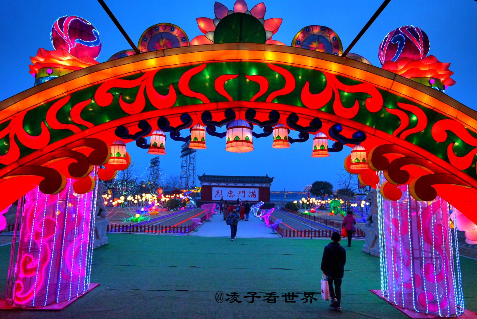 漫步在杨府景区流光溢彩的灯海中,有一种如梦如幻的感觉。尤其是看到景区南大门《繁花似锦》灯组,以现代灯光科技结合传统技艺,用梦幻之花来表示对杨家将忠烈的敬仰之情,而照壁上“满门忠烈”四个大字被彩灯映衬得更加夺目,不仅油然而生一种自豪感,也意识到了自己的责任。每一位杨家后人都应严格要求自己,都要对得起“满门忠烈”这四个字,对得起列祖列宗。