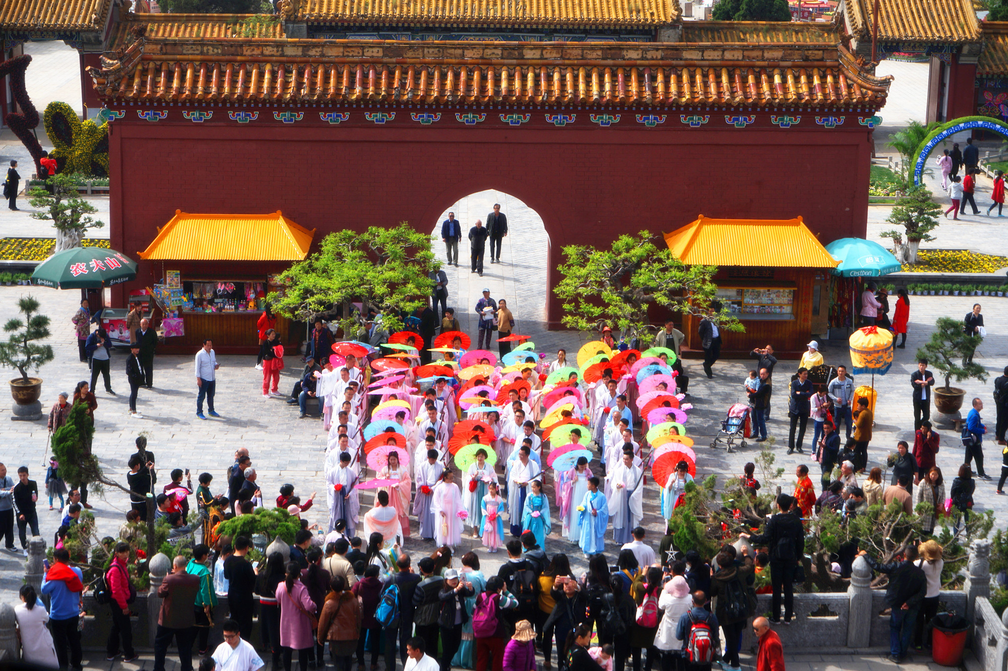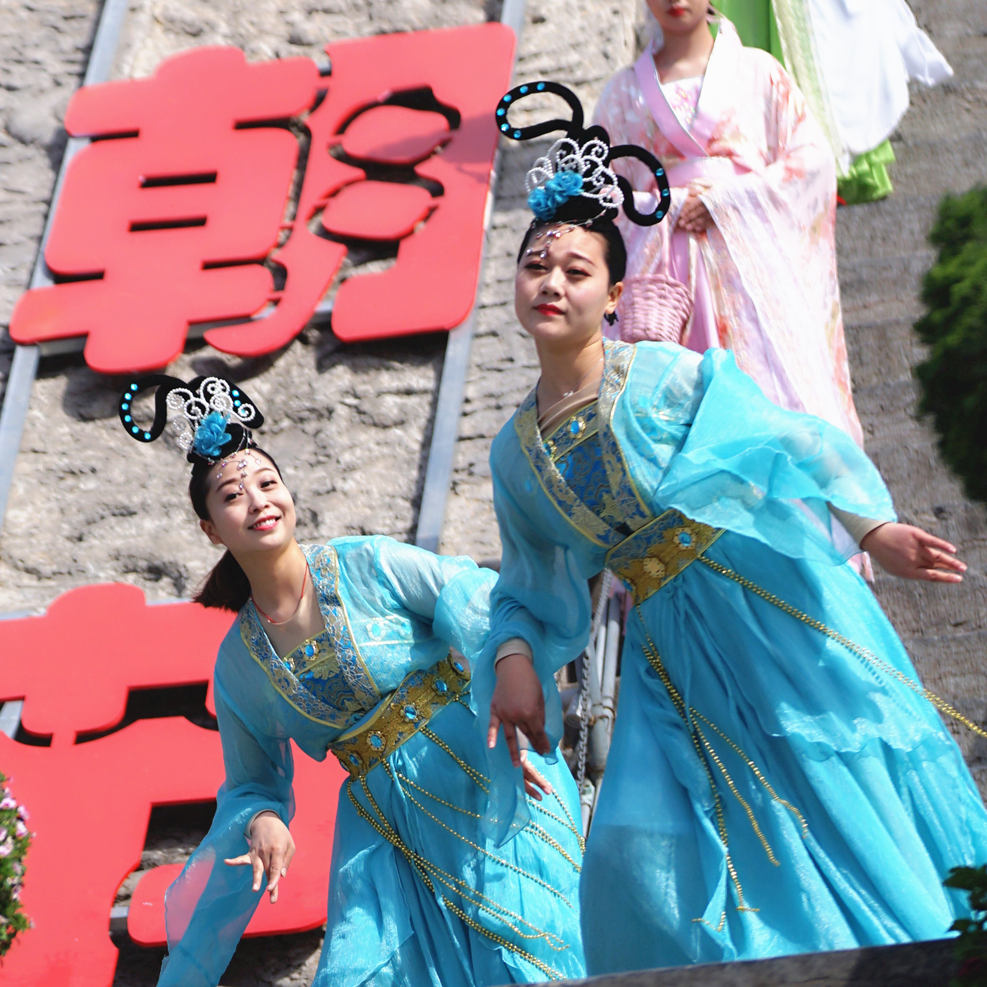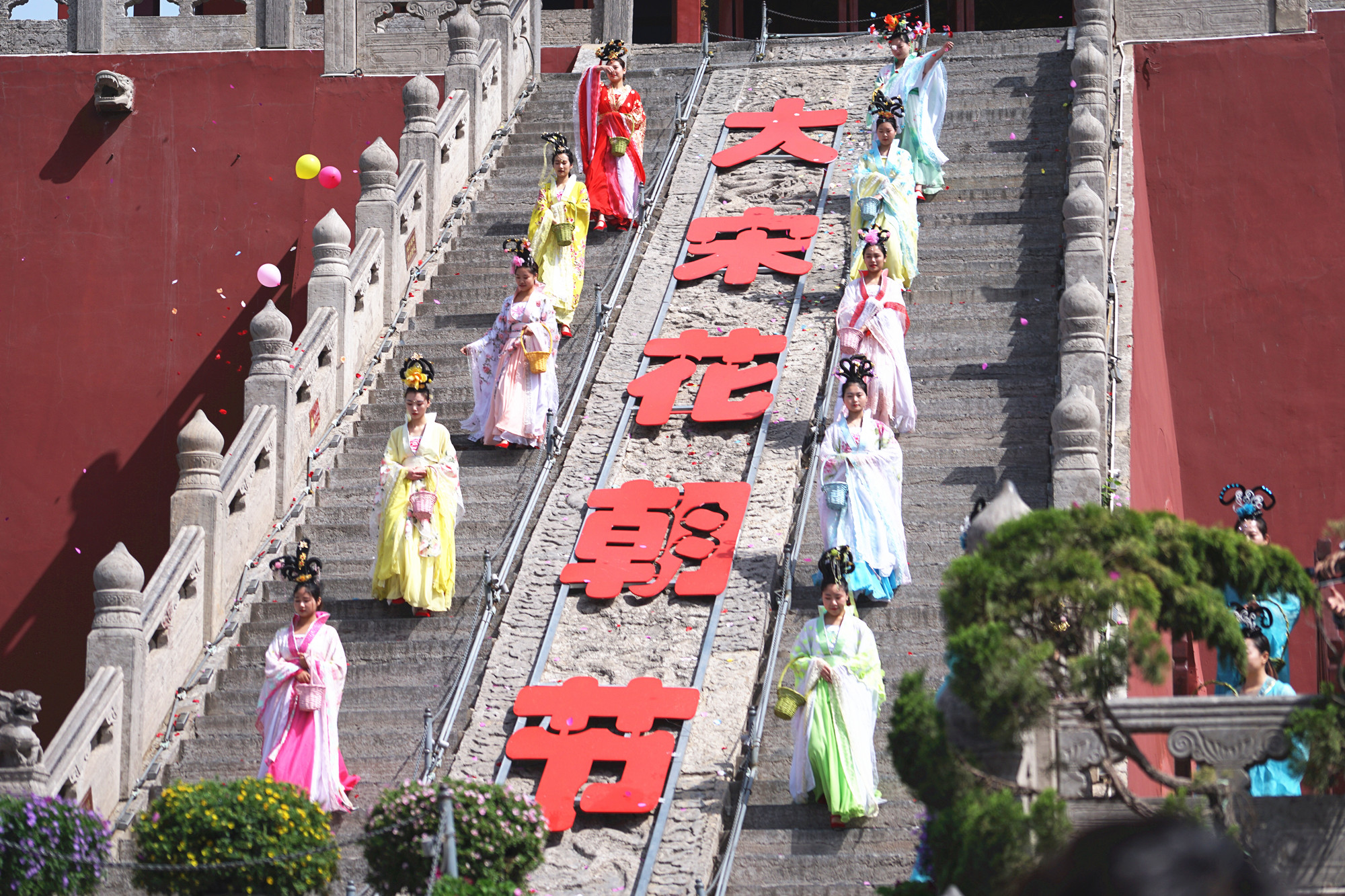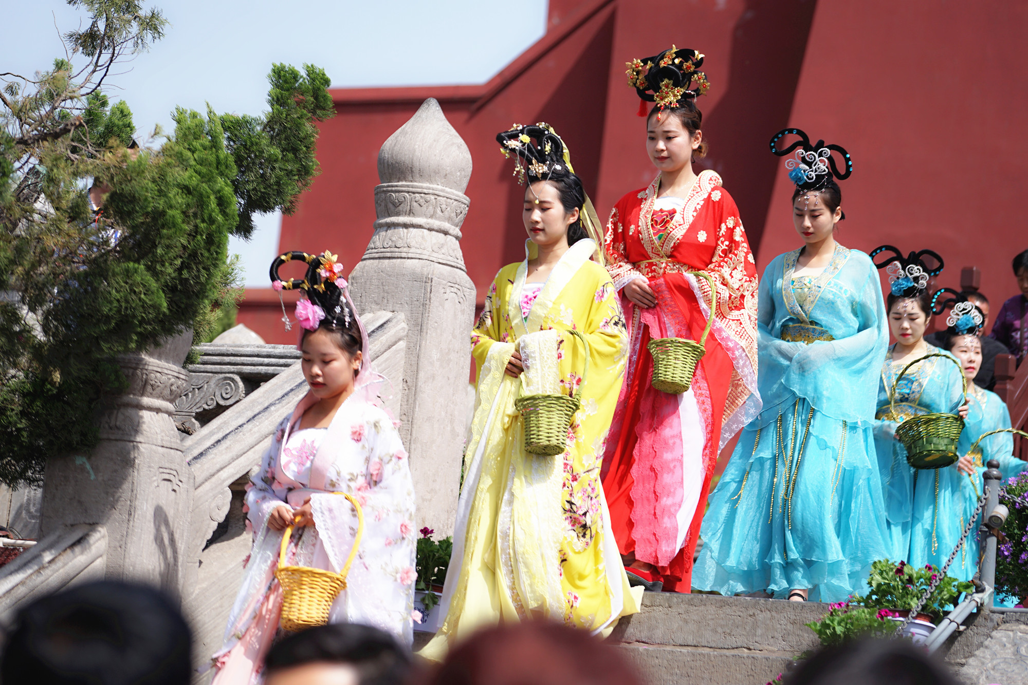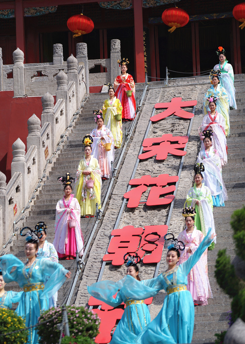 朝花节异常热闹,人们着古装巡游龙亭公园。花仙子们翩翩起舞,喧天的锣鼓奏响春的序曲。