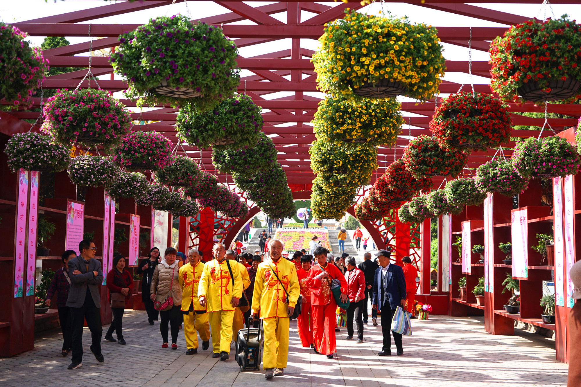 一眼望不到头的缤纷花廊,道路两旁的廊架上布满了各种盛开的鲜花,此乃花墙之真实写照。墙上用不同颜色花儿拼出龙的图案,花的造型。凹凸有致,层次分明。悬挂于廊架上的五色菊,角堇,半边莲争相怒放着倒垂下来,远远望去,如五彩绣球摇曳于风中,异常壮观美丽。漫步其中,犹如穿梭花的海洋,花的隧道,如痴如醉,让人流连忘返。