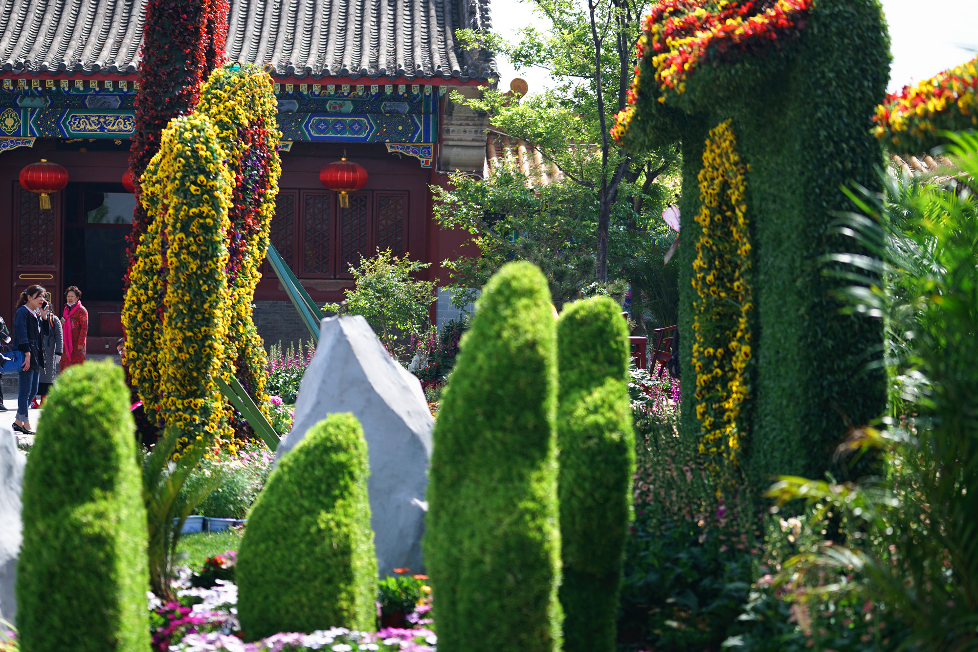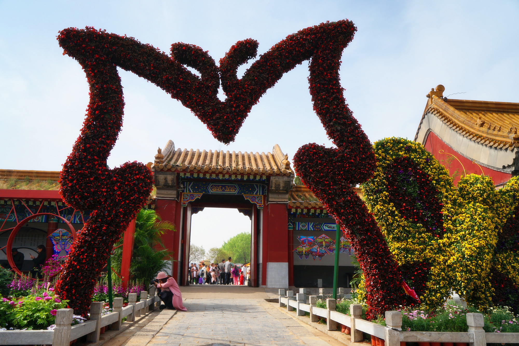 穿过花廊来到蝴蝶式的拱门前,这只蝴蝶门全是用盛开的鲜花装点而成。进去之后在龙亭大殿前右侧是花草装扮而成的嶙峋的山,以及奔流而下的瀑布。