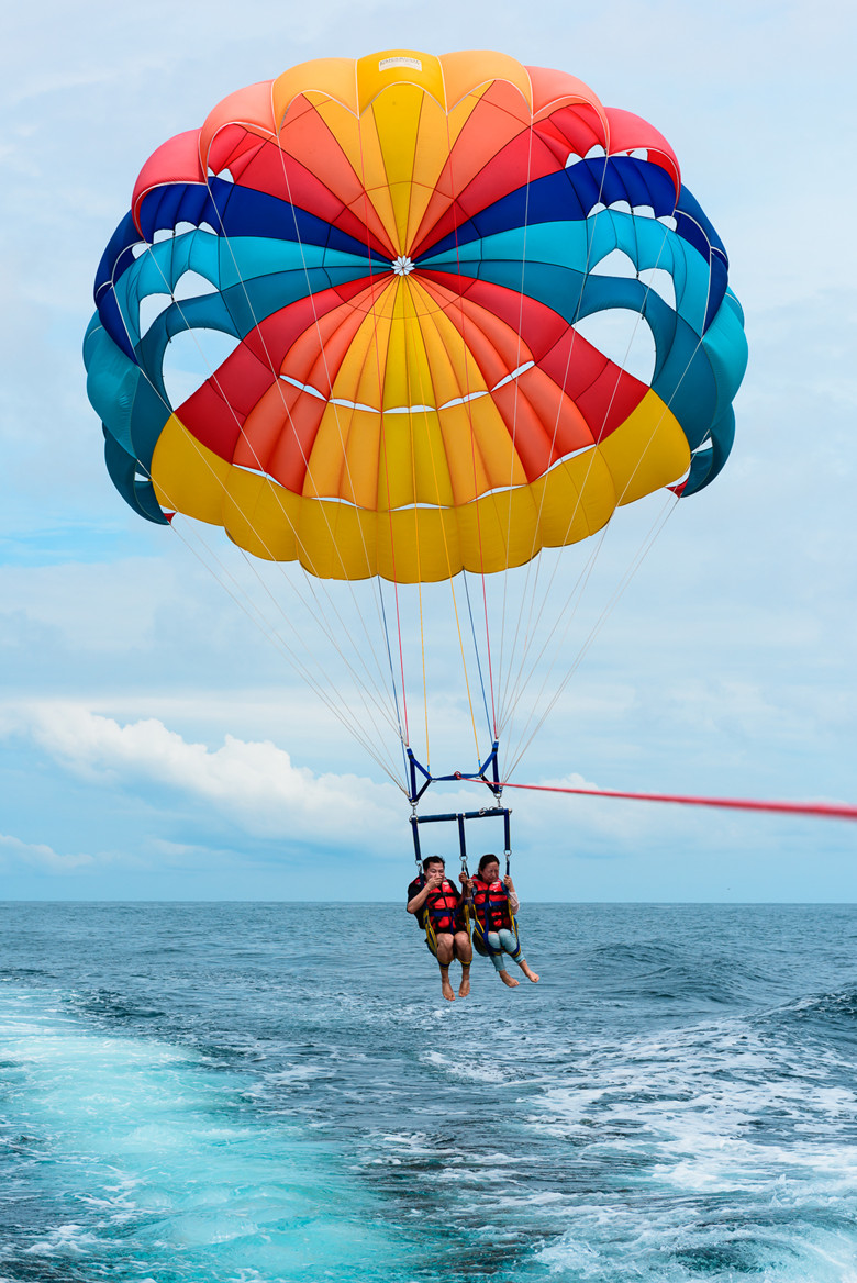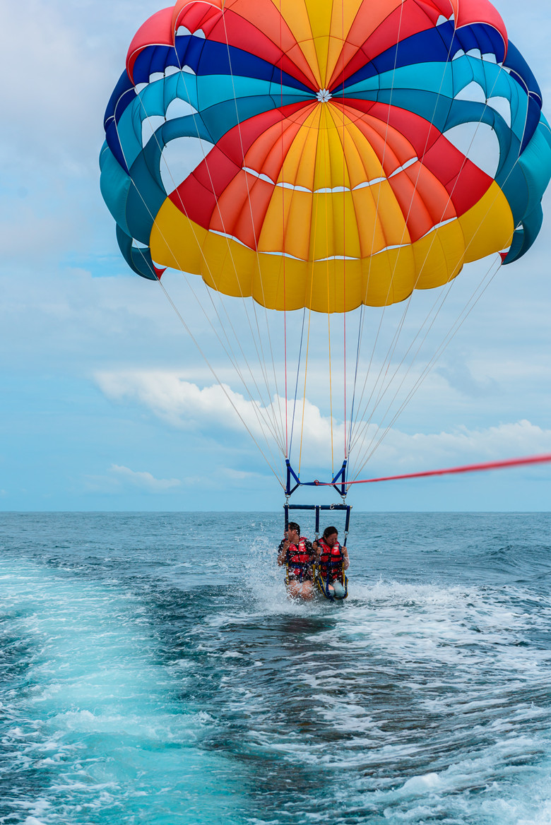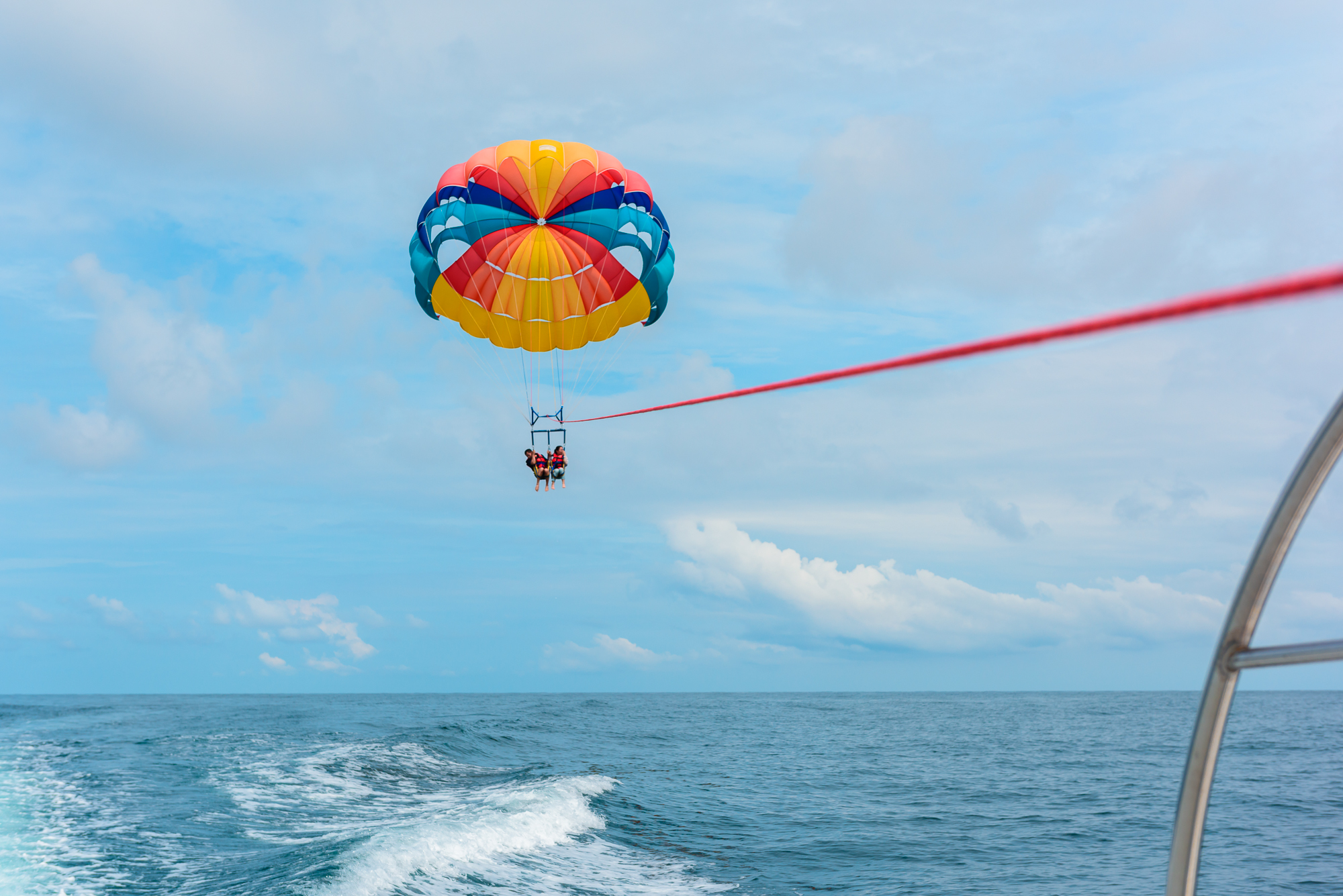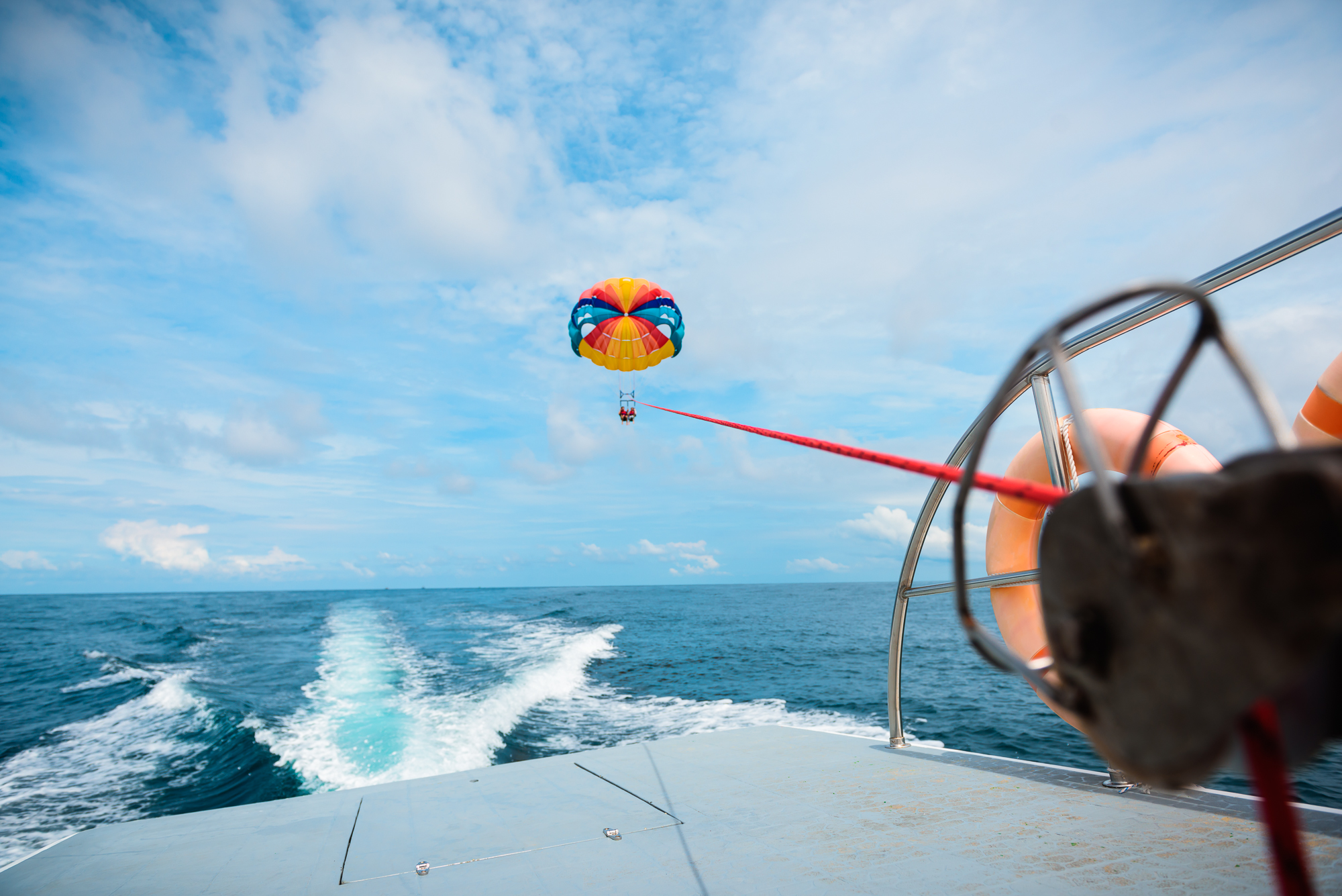 那感觉简直就像是在空中自由的翱翔,刚开始还有点紧张,由于是两个人一起,还好有小伙伴陪伴,一会就玩开了。大呼小叫的,非常开心。这个在玩的过程中降落伞真的会降下来让你入海,被海浪拍打很是刺激。放心,就是入水一瞬间就会被拉起来,来回好多次,简直太好玩了,听我说估计你体会不到,害得自己来亲身感受一下,最好会安全降落在快艇上,然后返回岛上。一定要穿救生衣,不然真的会掉下去,在我们的船上,就有两个妹子在玩的过程中,收伞的时候出现故障,掉到了海里,好在有救生衣,一点事没有。为了弥补出现的故障,修好之后结果她们又大胆的玩了第二次,看来这个实在是太好玩,小女生掉海里都不怕,还要玩第二次。枫子为我和冰冰拍了最好看的照片,来,你们欣赏一下入水的一瞬间。