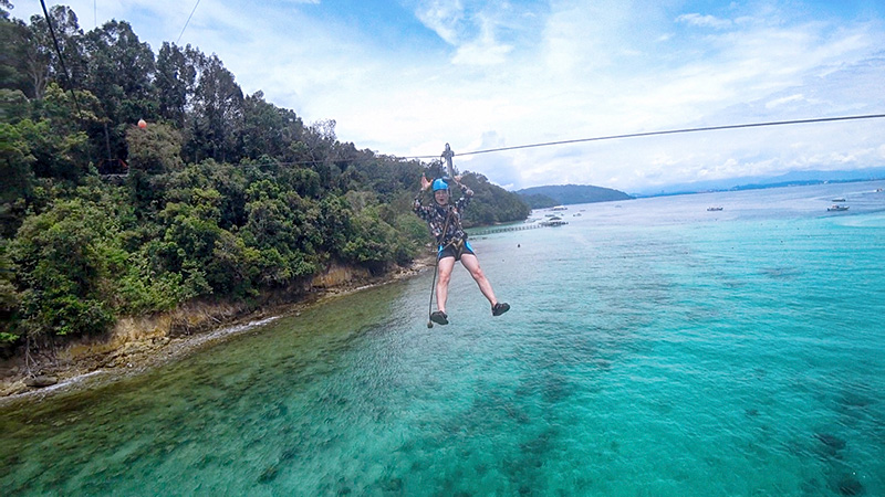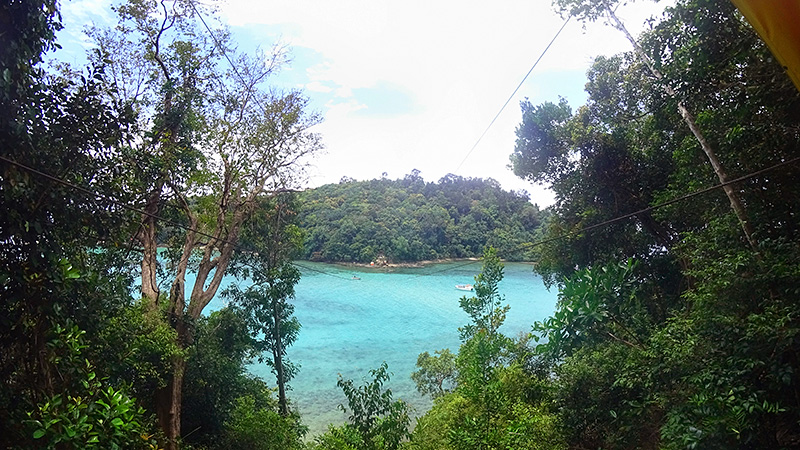 玩过降落伞,我们不尽兴,又去玩了滑索,这里的滑索号称海上最长的索道,一定要体验一下。索道在两座岛的中间,从海滩乘船过去,然后上到山顶,穿戴整齐,两人一组同时山索道,一人一个。瞬间就被人一推滑了下去,只有站在山顶俯瞰这片海,与站在沙滩上看海的感觉完全是两个概念。俯瞰可以清晰的看到这里海水居然是如此的漂亮,说他是海上明珠一点不为过。海水的颜色也是层次分明,一层一层不同的色彩,简直妙不可言。