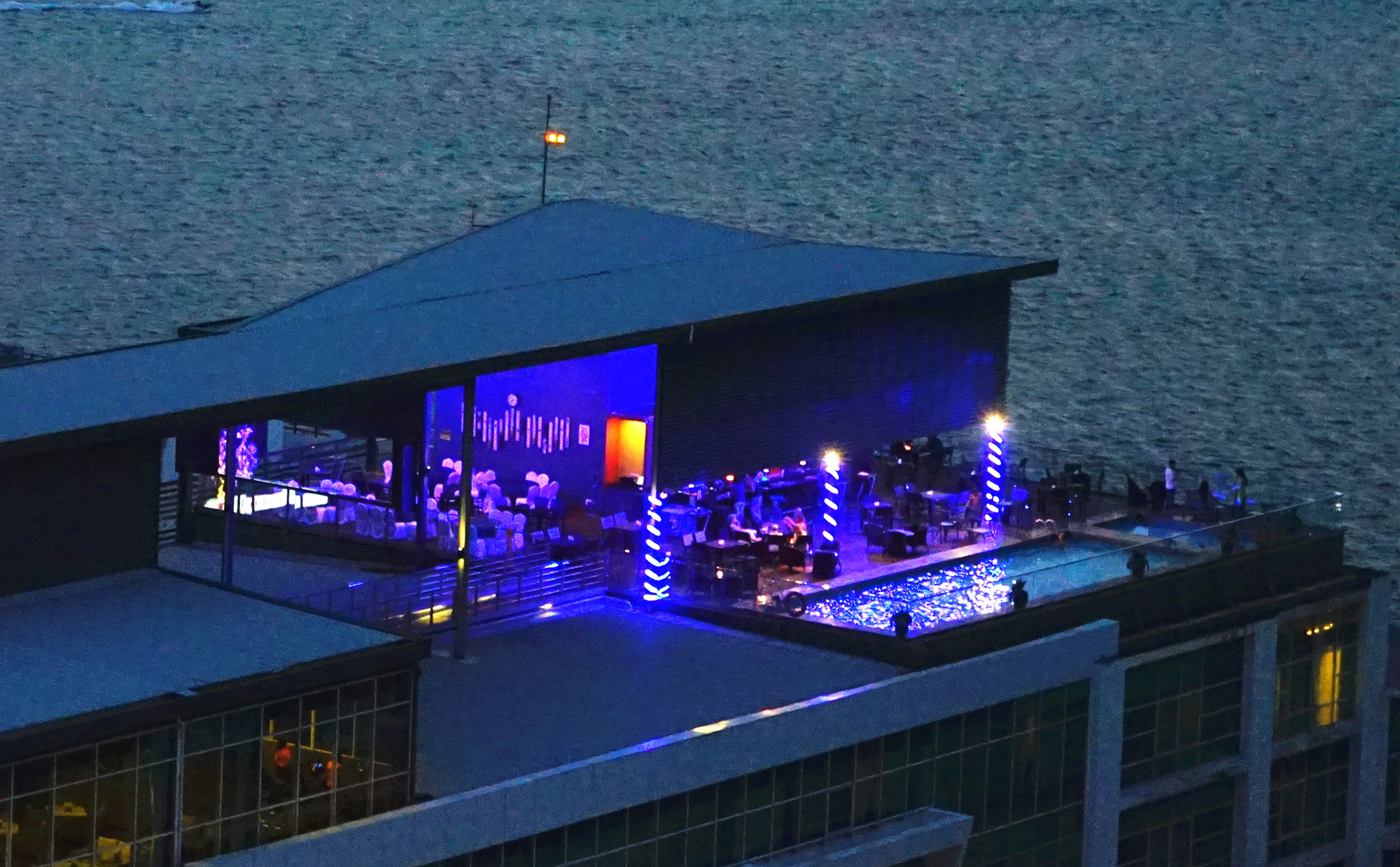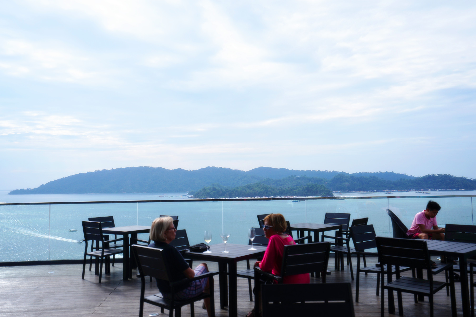 我们住的酒店不仅是海景房,楼顶还有赏景咖啡吧,游泳池,健身房都是为这里住宿的客人免费开放。坐在这里悠闲的喝着咖啡,看着日出日落,简直不要太美。所以我对这个酒店很是中意,不但服务好,而且还真干净。房间还备有温馨的果盘,这个我最喜欢。大落地窗可一览无余的看见海上忙碌的渔船。