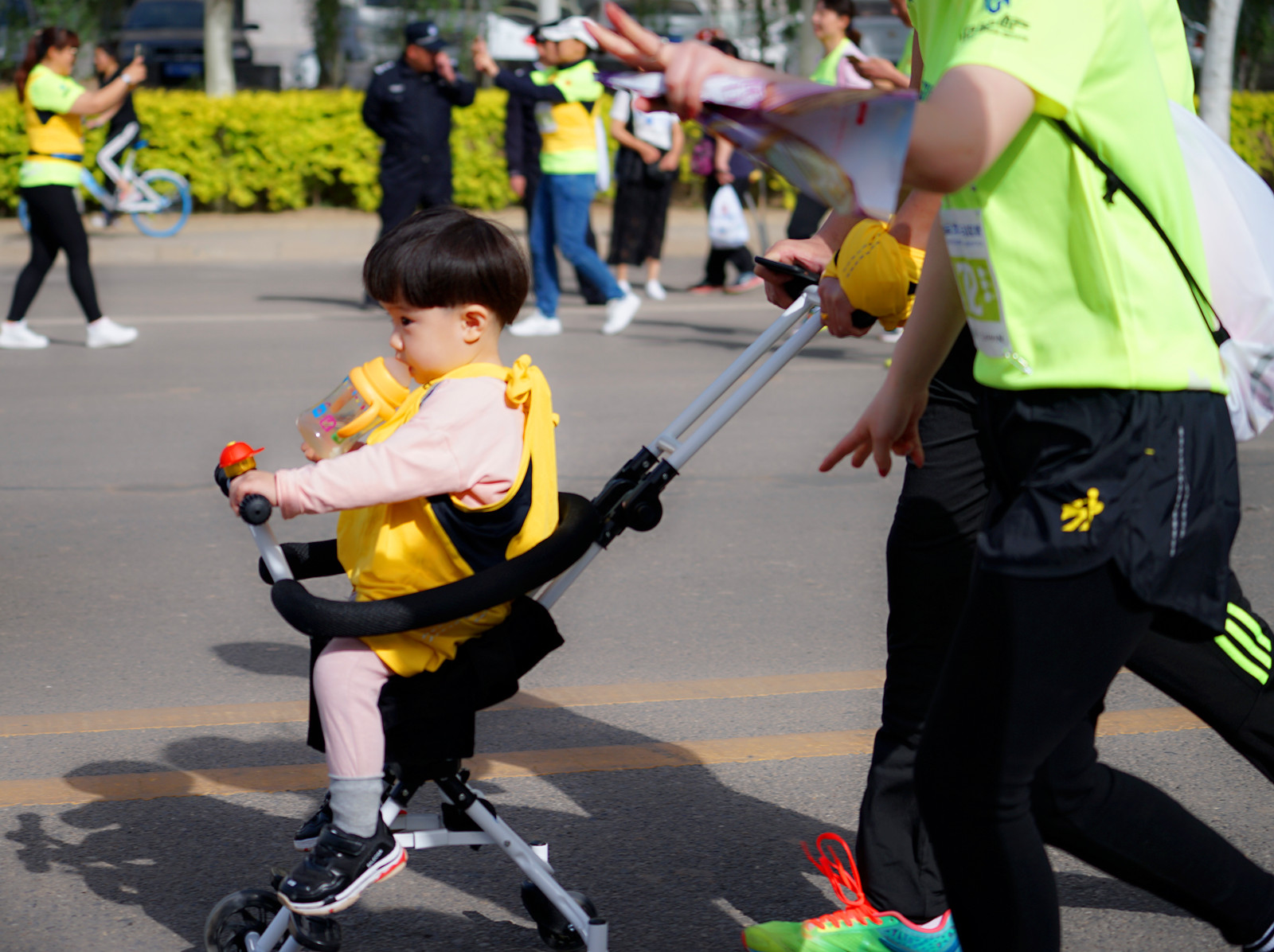 还有这个被爸爸妈妈推着一直跑的,还不忘自己拿着奶瓶补充水分,哈哈!