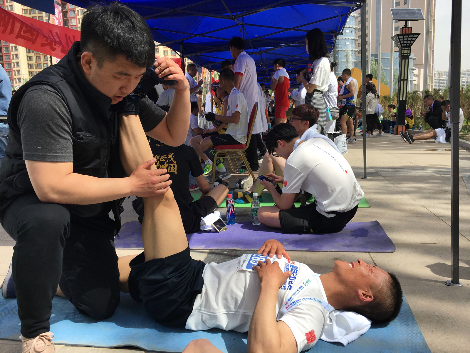 比赛结束,志愿者们在位运动员进行按摩。