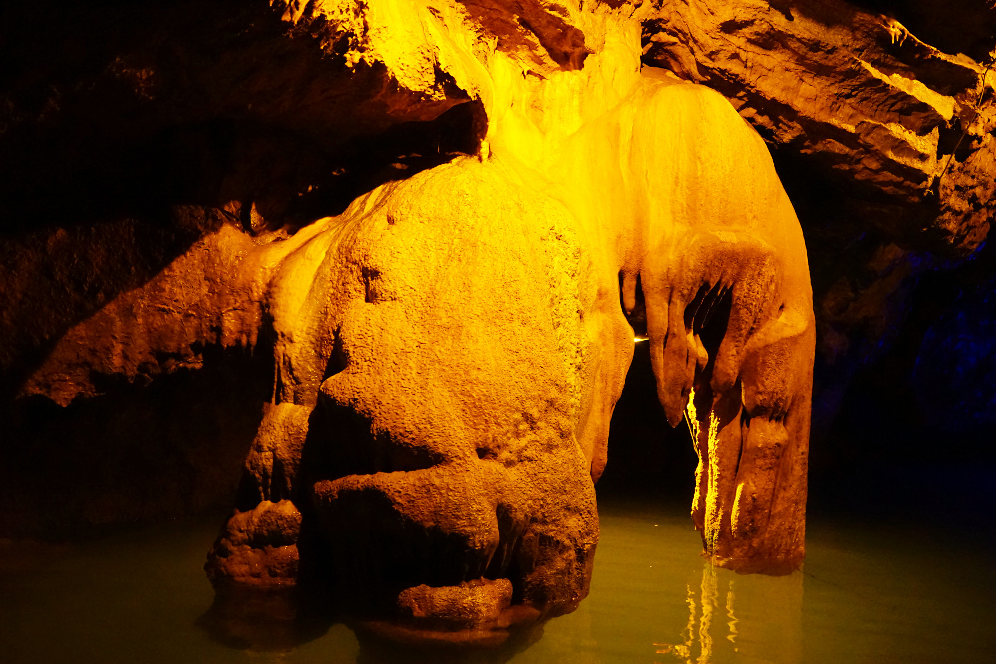 最精华之处就是水洞,乘着小船穿行其中,刚开始的一段没有什么,越往里面越神奇。由于是地下暗河,必须要有灯光,每一艘快艇上都配有一盏很明亮的灯,必要时工作人员会打开让大家欣赏溶洞中最美的钟乳石。