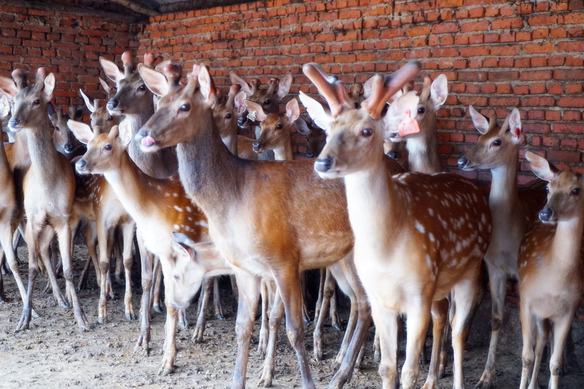 养了五六年的成年雄性梅花鹿即到了鹿茸的盛产期,一头鹿一年可割2次鹿茸。普通品种少的每头鹿只有0.5-1公斤鹿茸的年产量,多的平均每头每年可割2公斤鹿茸。梅花鹿一般寿命在15年左右,公梅花鹿长到三岁,就可以产鹿茸。一头公鹿一年可以割两次鹿茸,一般一次能割2到3斤左右,每斤鹿茸能卖1800元,一只公鹿一年产的鹿茸可以卖万元甚至更多。割完鹿茸后,在被割处都会长出一个比石头还硬的“角帽”,等“角帽”掉了才会开始长新鹿茸,而“角帽”磨成粉可以用来治疗咽炎、乳腺炎等疾病。所以,鹿乡人没有一个得乳腺炎的。鹿茸如果不割掉的话,对梅花鹿来说是一种负担,鹿茸逐渐的骨化,顶在头上一点也不舒服,这样公鹿就会互相的打斗,场面也是比较残忍的。