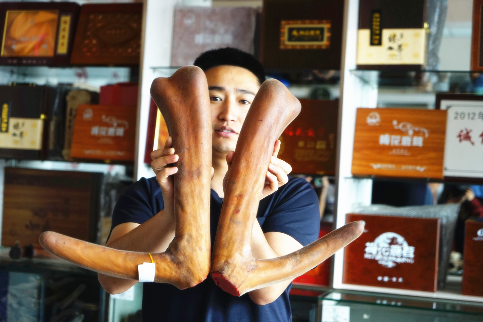 帅哥手中的这一对鹿茸是鹿茸中的精品,售价高达万元。